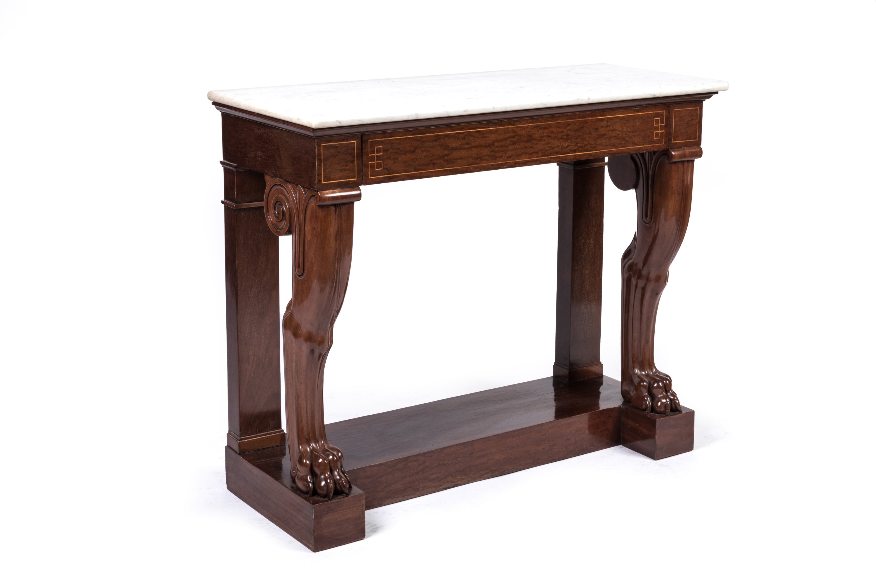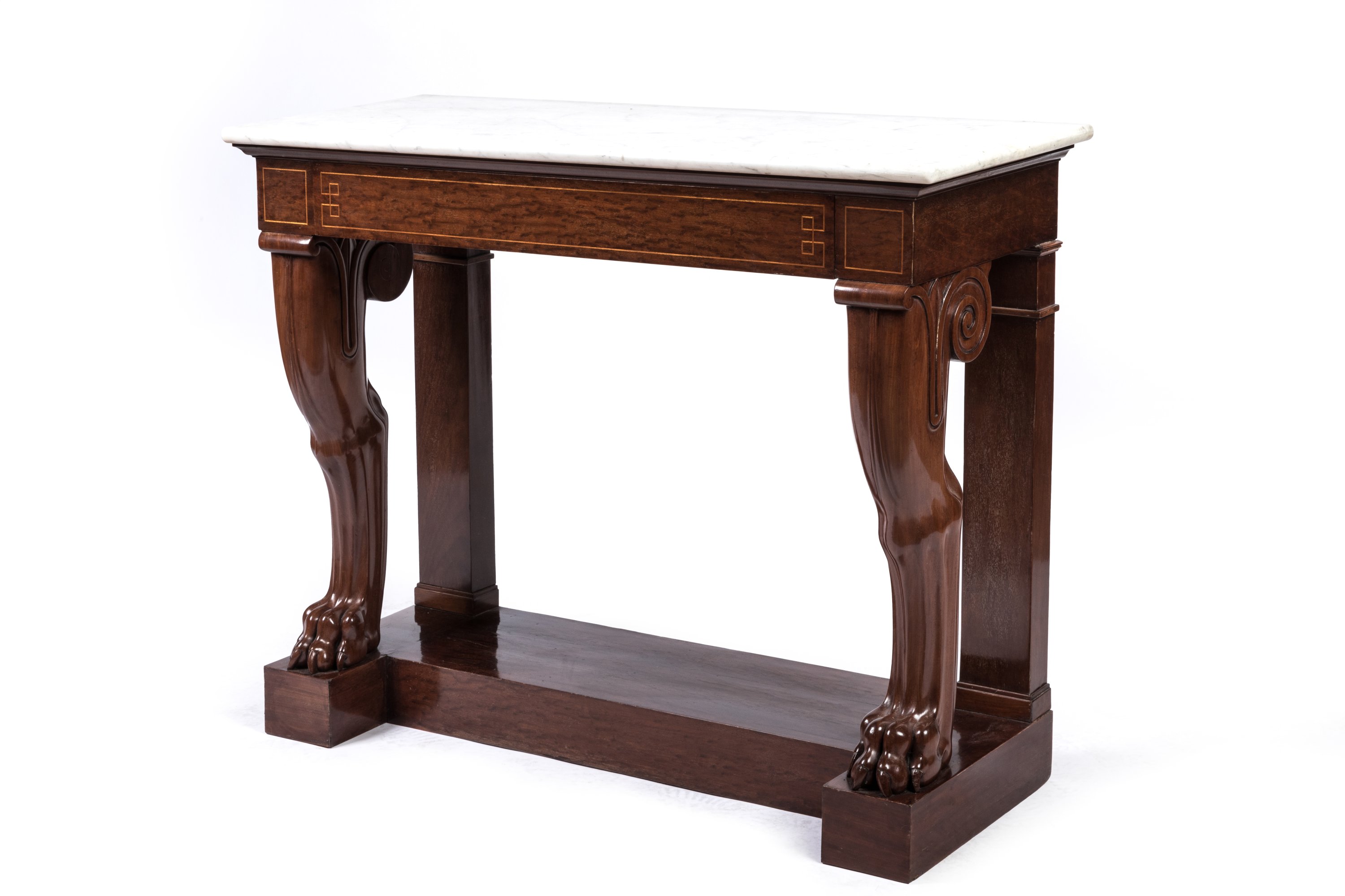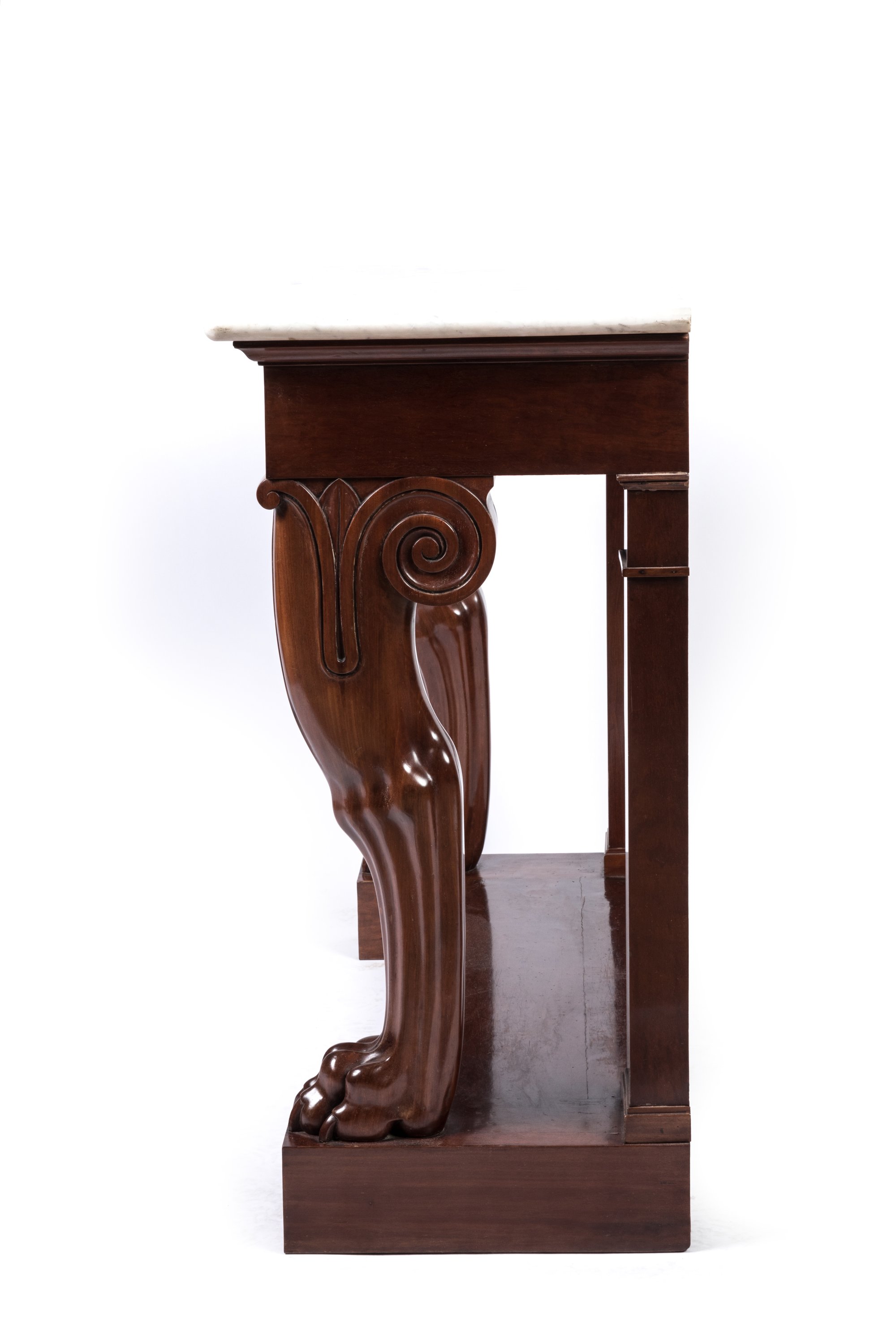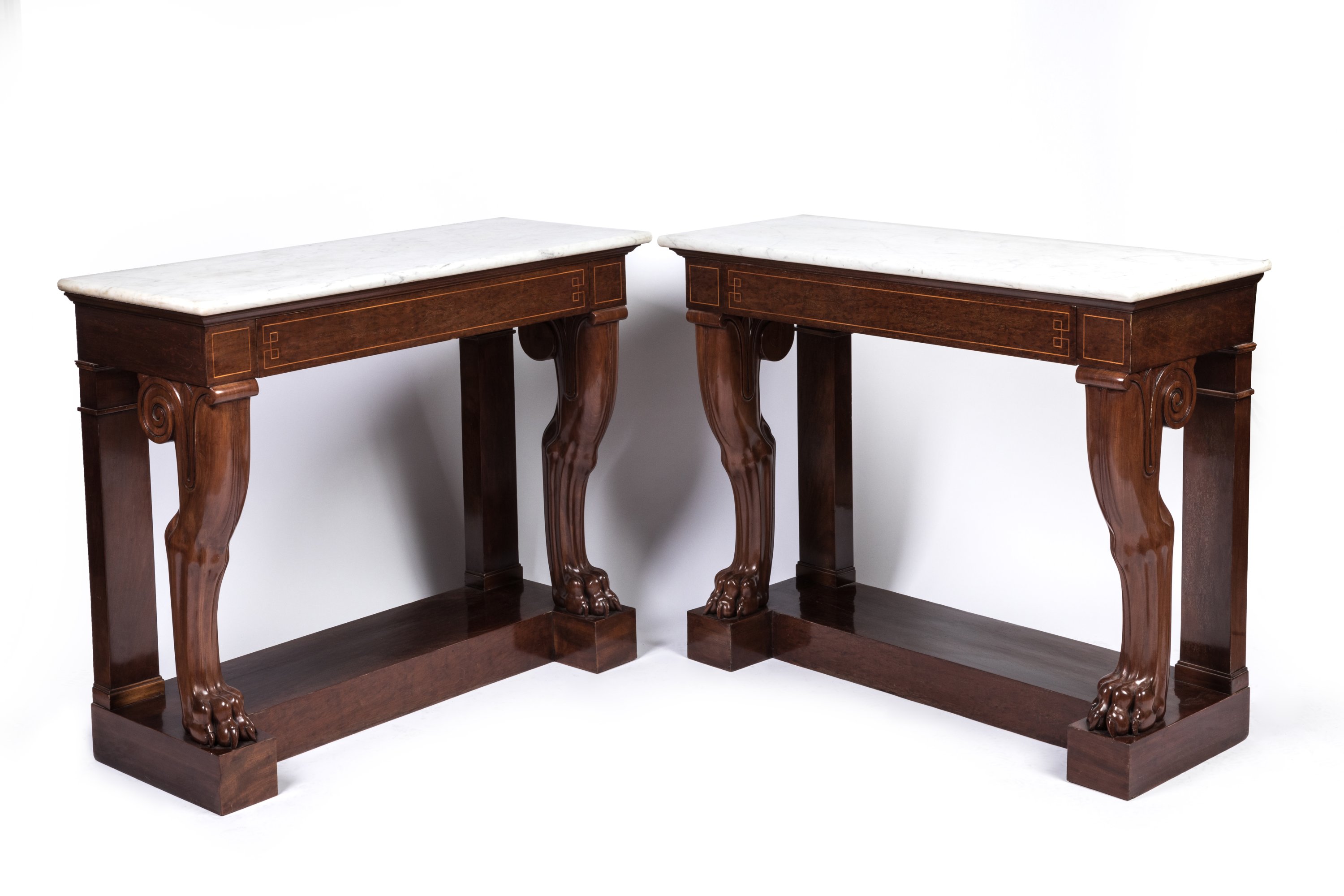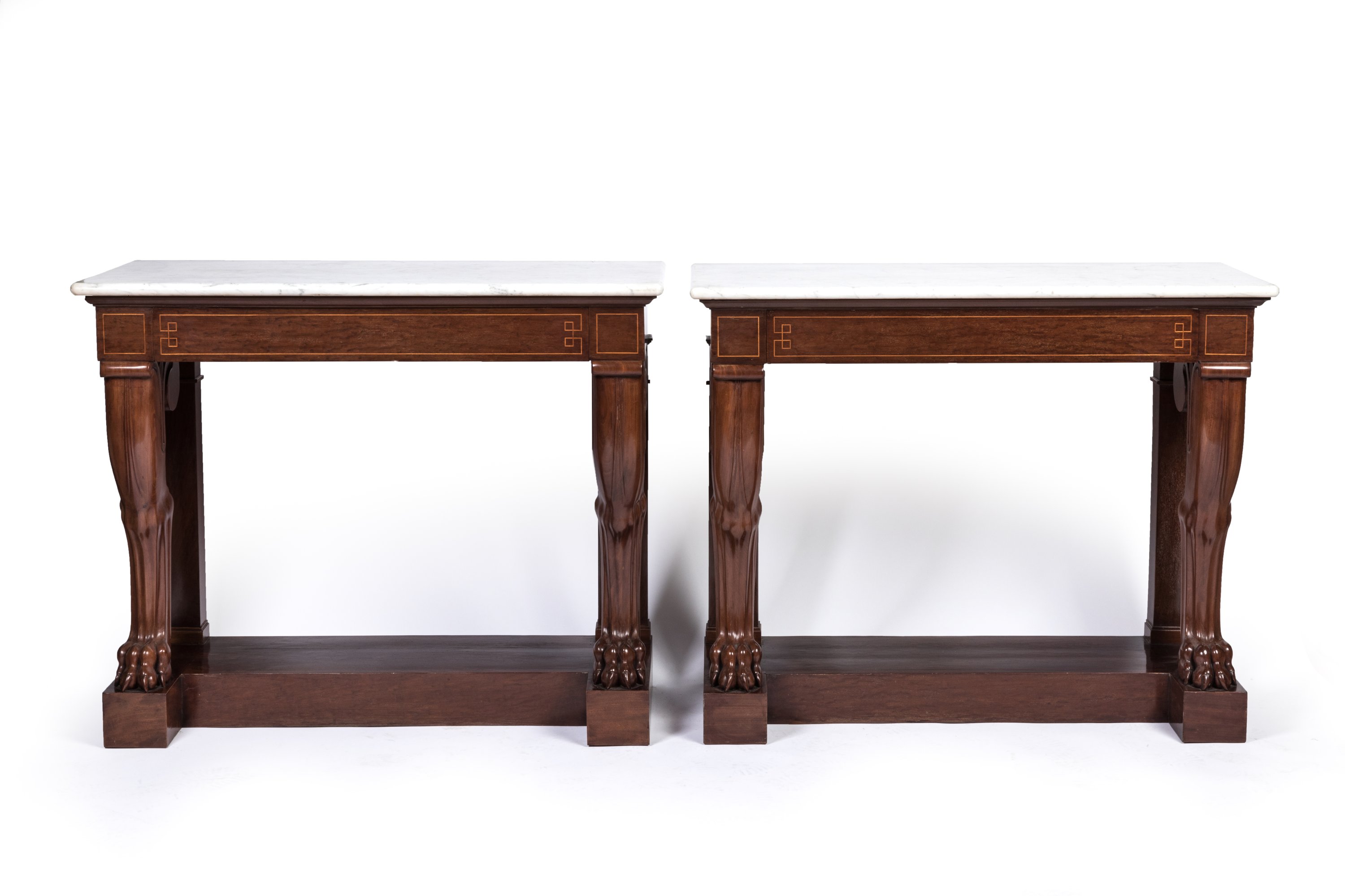 Louis-Philippe, ca.1835. A pair of mahogany and mahogany veneer console tables on lion claw feet by Georges-Alphonse Jacob-Desmalter. White marble top.