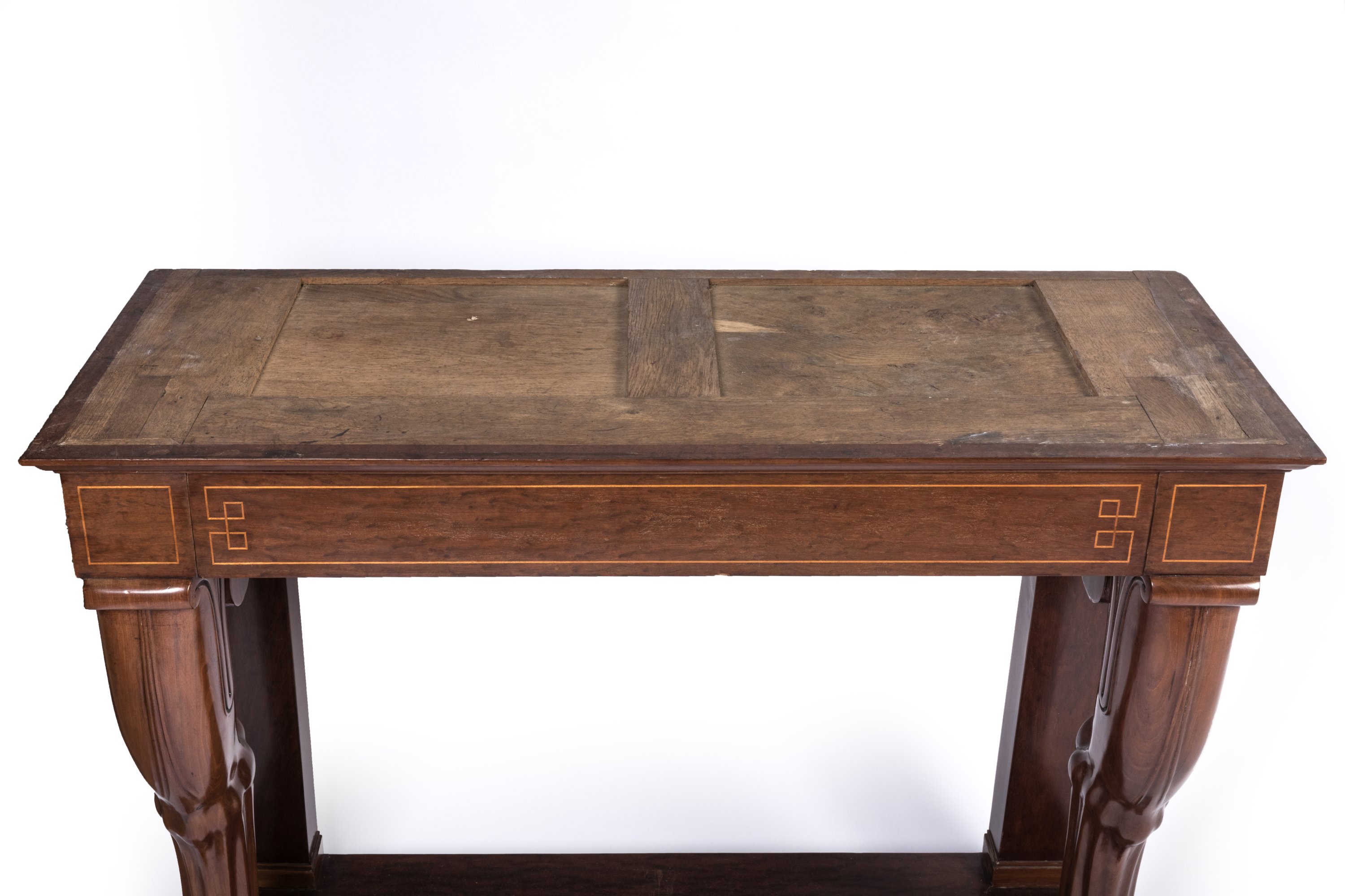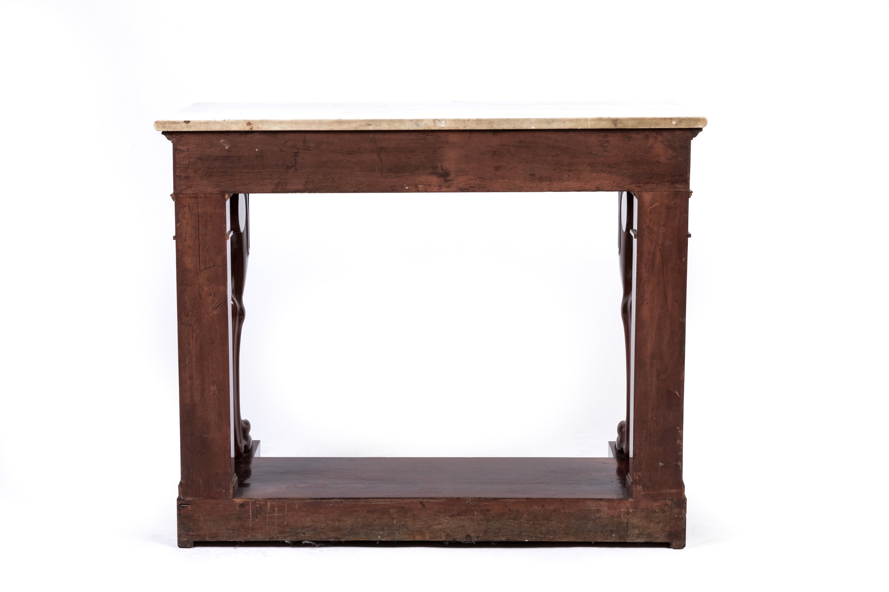 en acajou et placage d'acajou, ouvrant en ceinture par un tiroir décoré de filets de citronnier. Elle repose sur d'importants pieds antérieurs en jarrets surmontés de volutes et terminés par des pattes de lion. Les pieds postérieurs simulant deux pilastres. L'ensemble repose sur une plinthe à partie centrale en retrait.