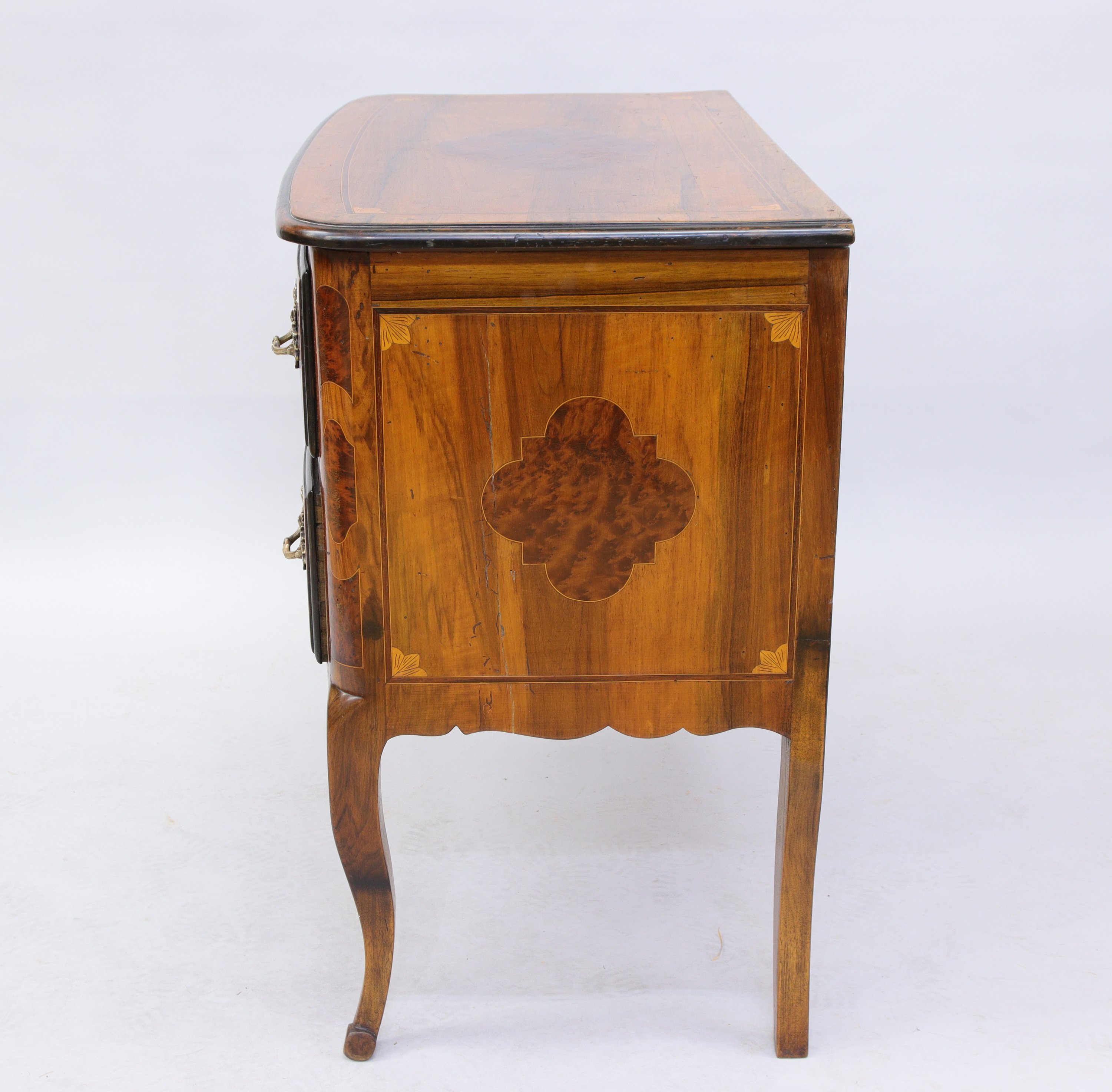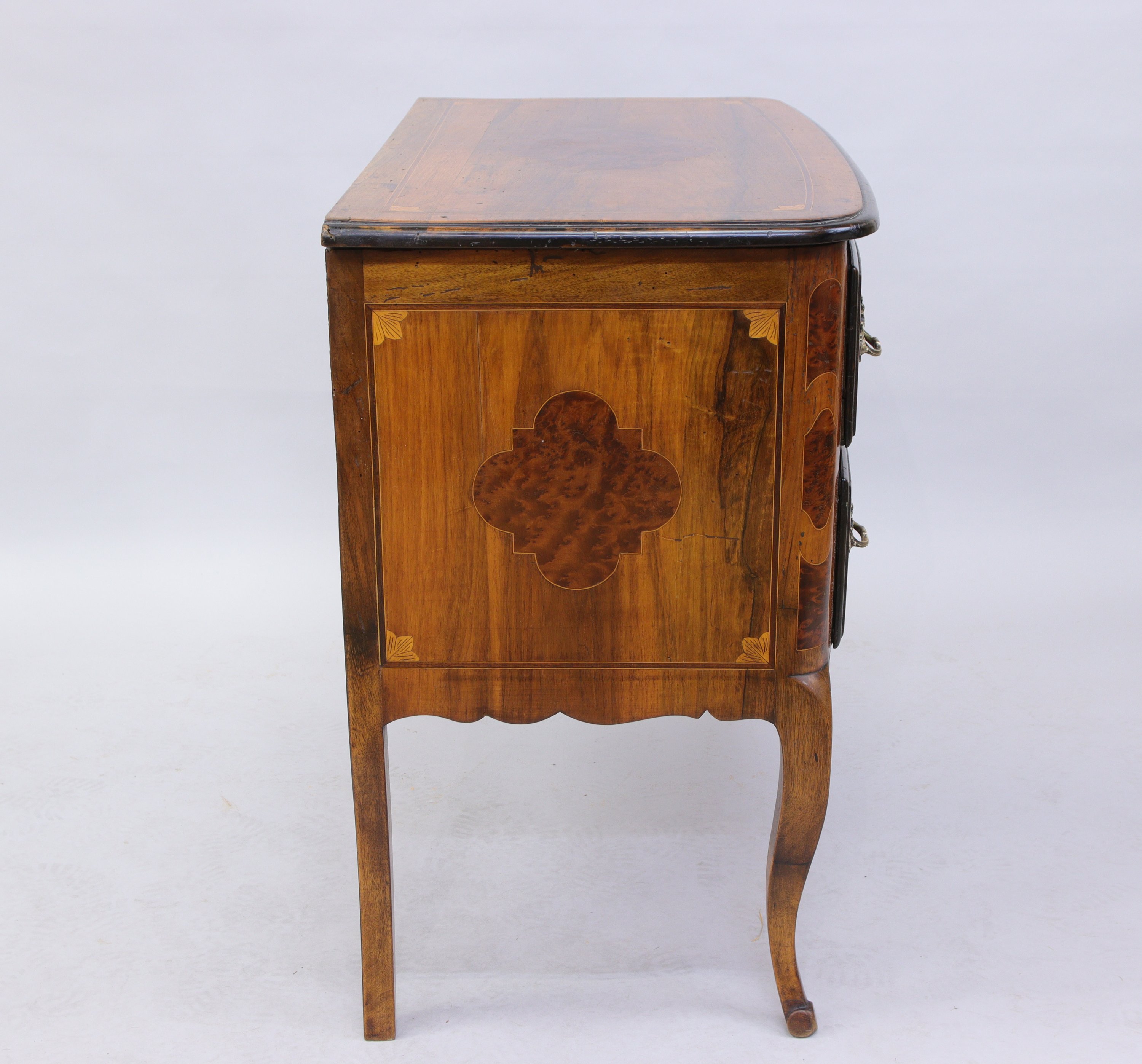 A walnut, elm burl and boxwood veneered commode. Bronze ornementation.