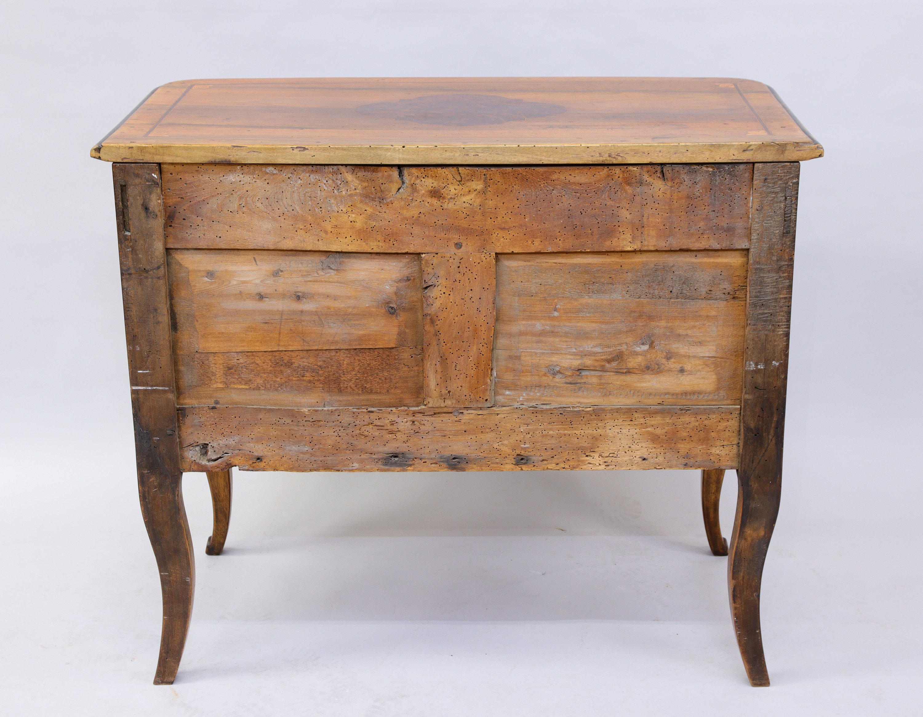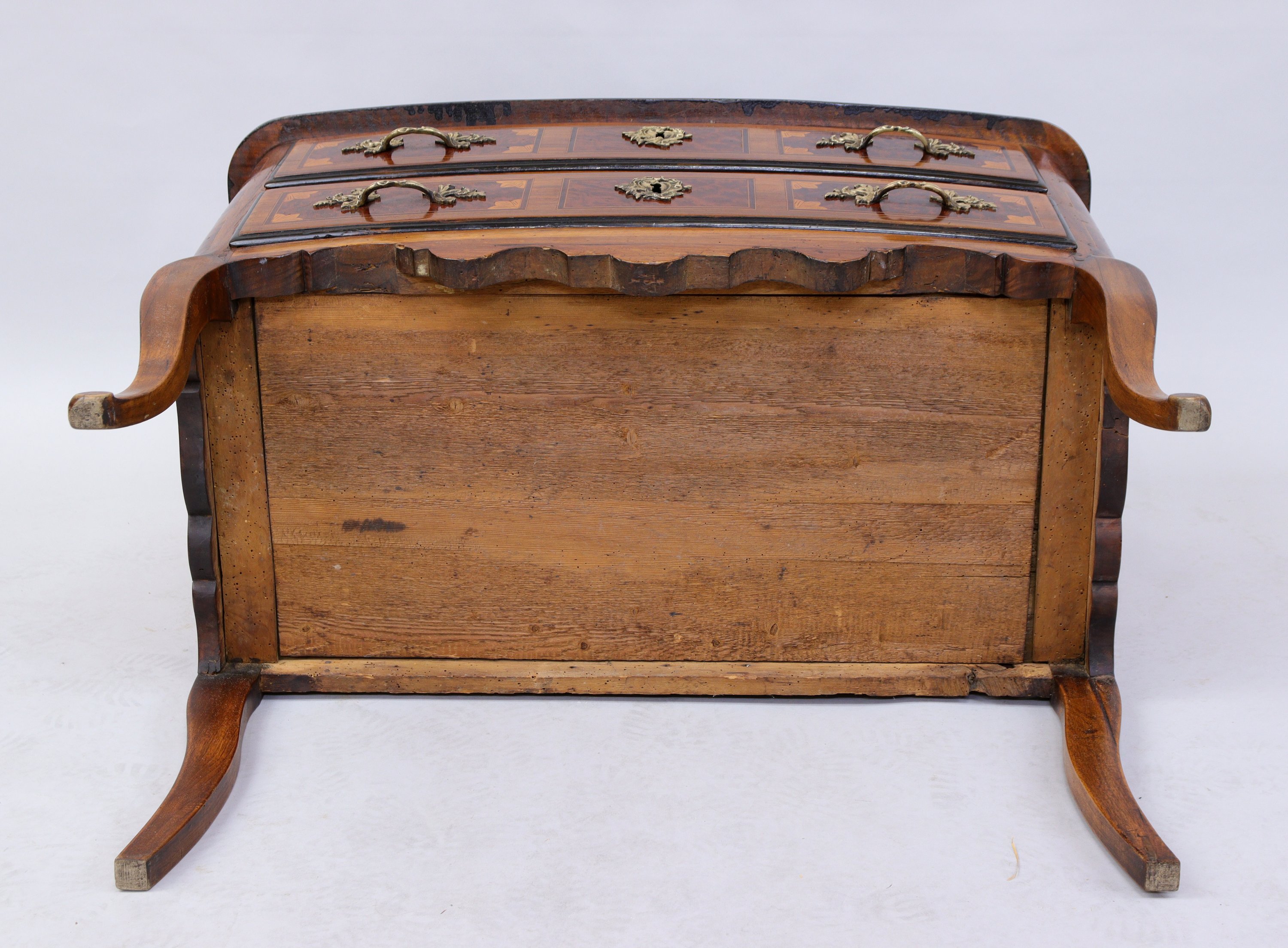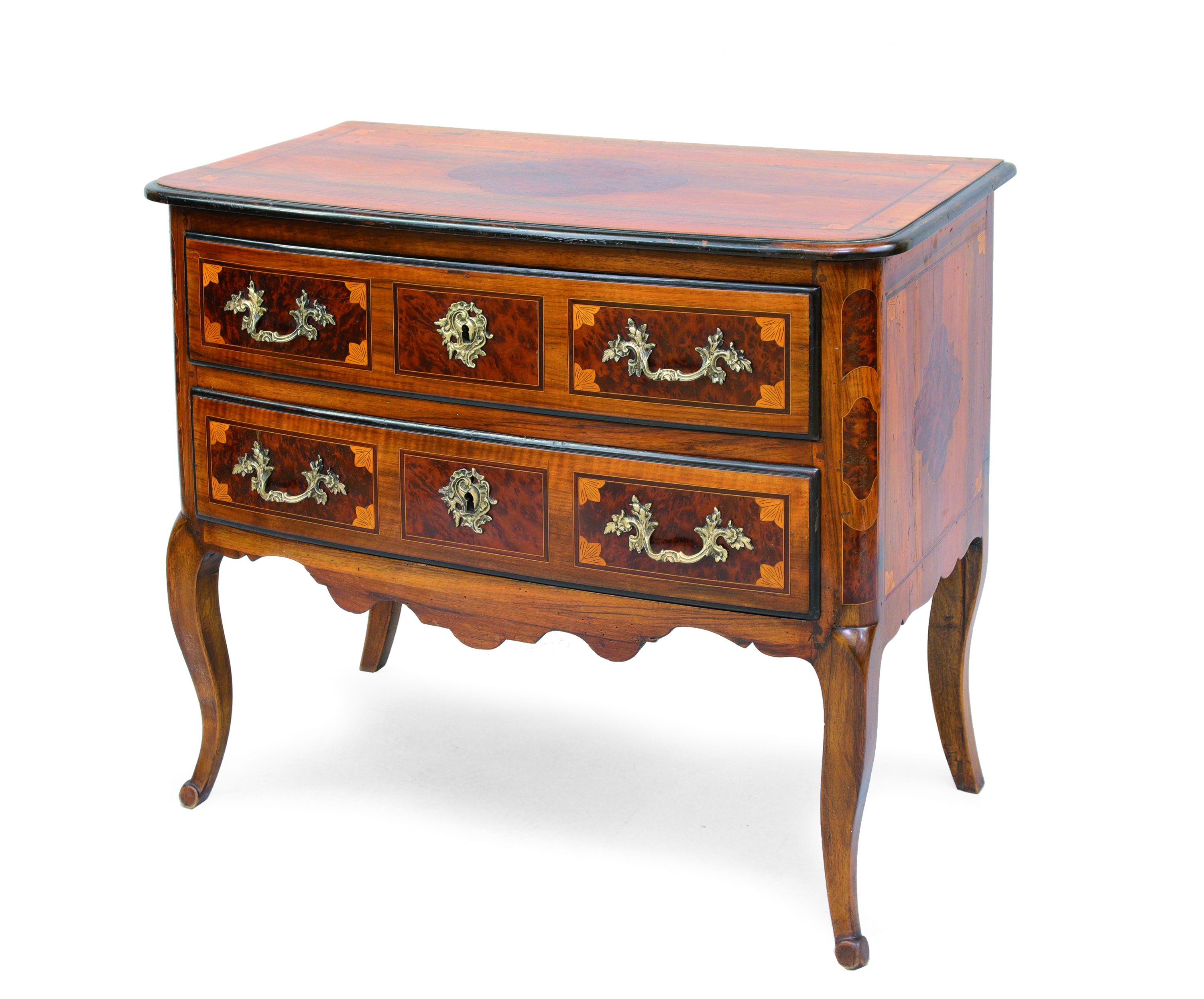 en placage de noyer, loupe d'orme et buis sur fond de bois fruitier. Le plateau à décor d'un médaillon polylobé cerné d'un filet à écoinçons. Elle ouvre en façade par deux tiroirs séparés par une traverse. Ils sont ornés de trois réserves, dont deux à écoinçons. Le tablier de forme chantournée. Elle repose sur quatre pieds cambrés, les antérieurs à pastille.