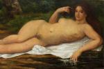 A ca. 1869 painting of a Bather (Female Nude on the Shore) by Gustave Courbet. Oil on original canvas. Signed « Gustave Courbet. » on the lower left corner.