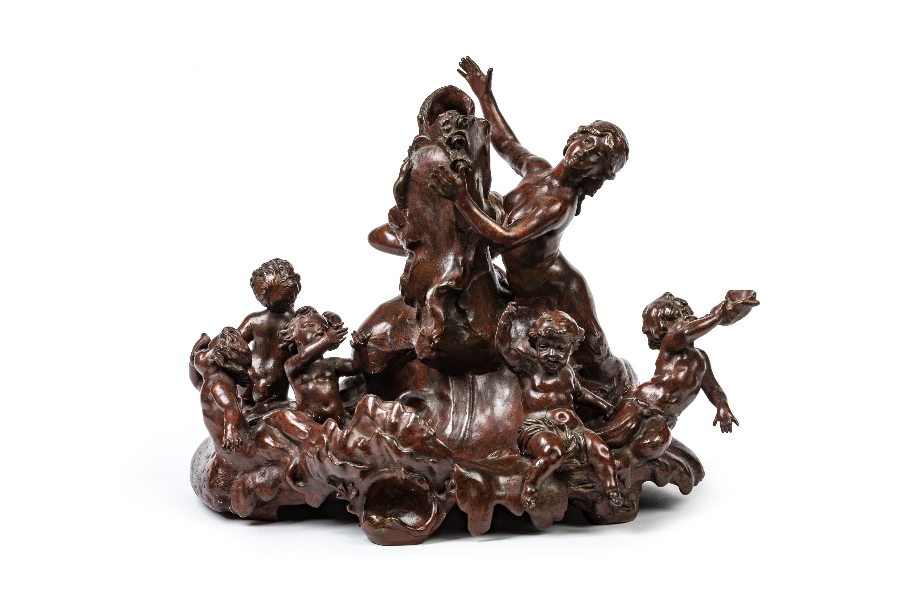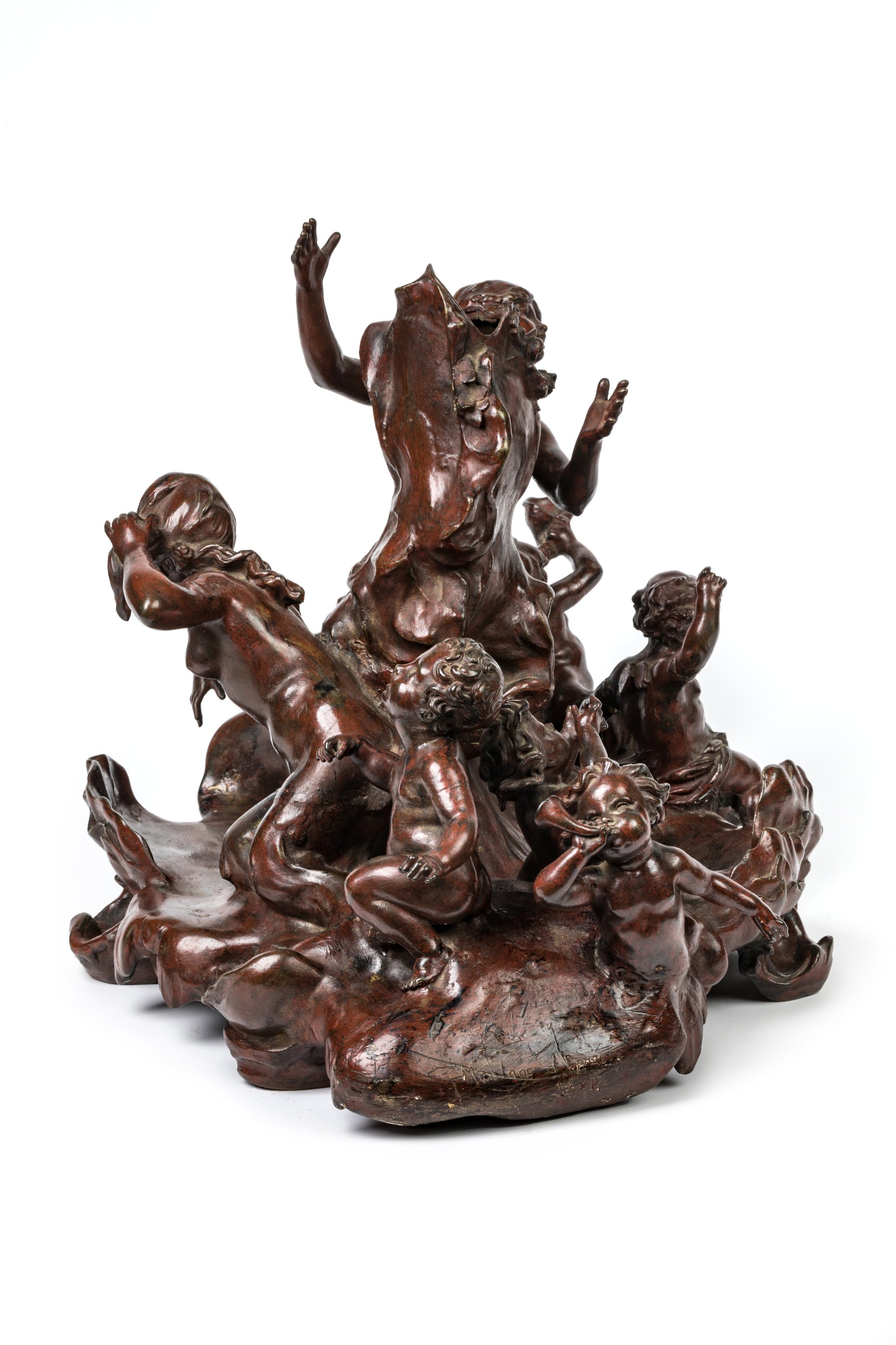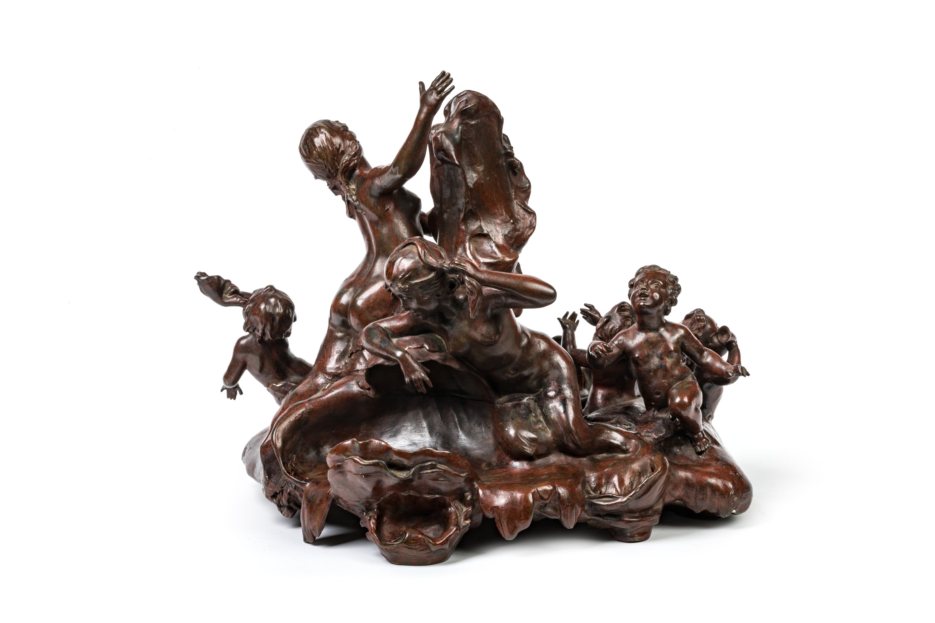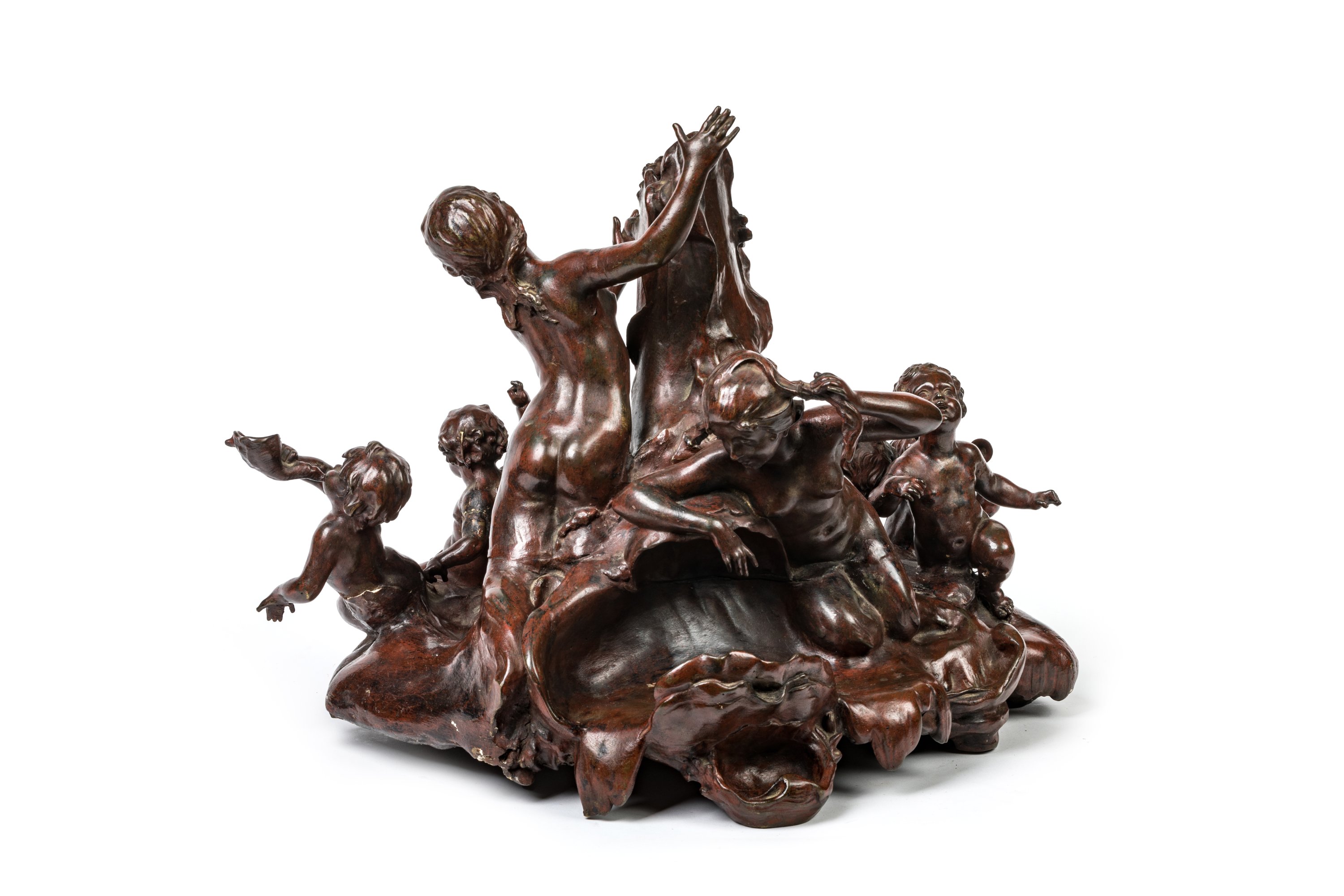 Second au prix de Rome 1886, François-Raoul Larche expose au Salon de 1884 à 1910, recevant une médaille d'or à l'occasion de l'Exposition Universelle de Paris en 1900. Travaillant avec le fondeur Siot-Decauville, il réalise de nombreux groupes et surtouts de table édités en argent, bronze ou étain, mêlant jeunes femmes alanguies et putti potelés dans l'esprit Art Nouveau. Notre fontaine reprend tant le thème aquatique que la structure pyramidale de son surtout de La Mer (vers 1894) et de son groupe Le Chant des sirènes, édité par Susse. En 1910, il présente son projet d'un Miroir d'eau qui sera achevé après son décès accidentel dans le marbre devant le Grand Palais à Paris. Notre groupe pourrait avoir été un travail préparatoire à cette fontaine, intitulée La Seine et ses affluents, qui s'inscrit dans l'histoire des grands monuments parisiens 1900 dont l'acmé est l'inauguration du Pont Alexandre III en 1900 avec son cortège de nymphes fluviales, génies et néréides maritimes.