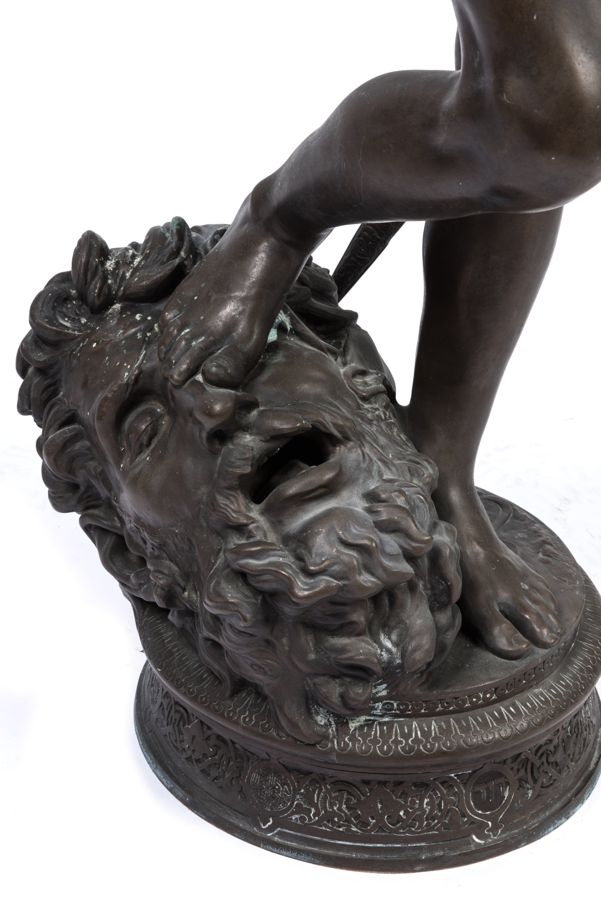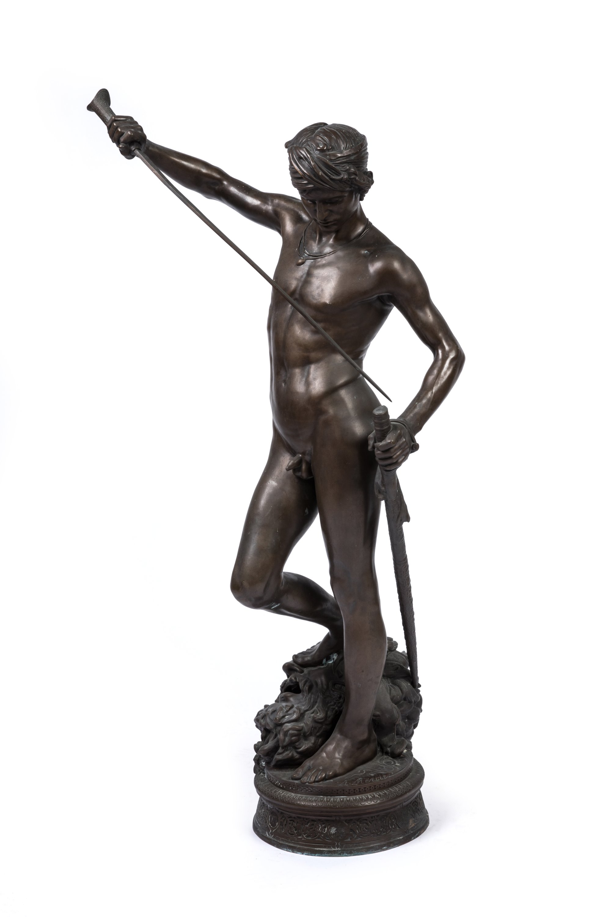 A rare 1869-70 brown patinated bronze figure of David victorious by Antonin Mercié. Barbedienne Foundry stamp. On sculptures cast at a later date, a loincloth was added to cover up David's groin.