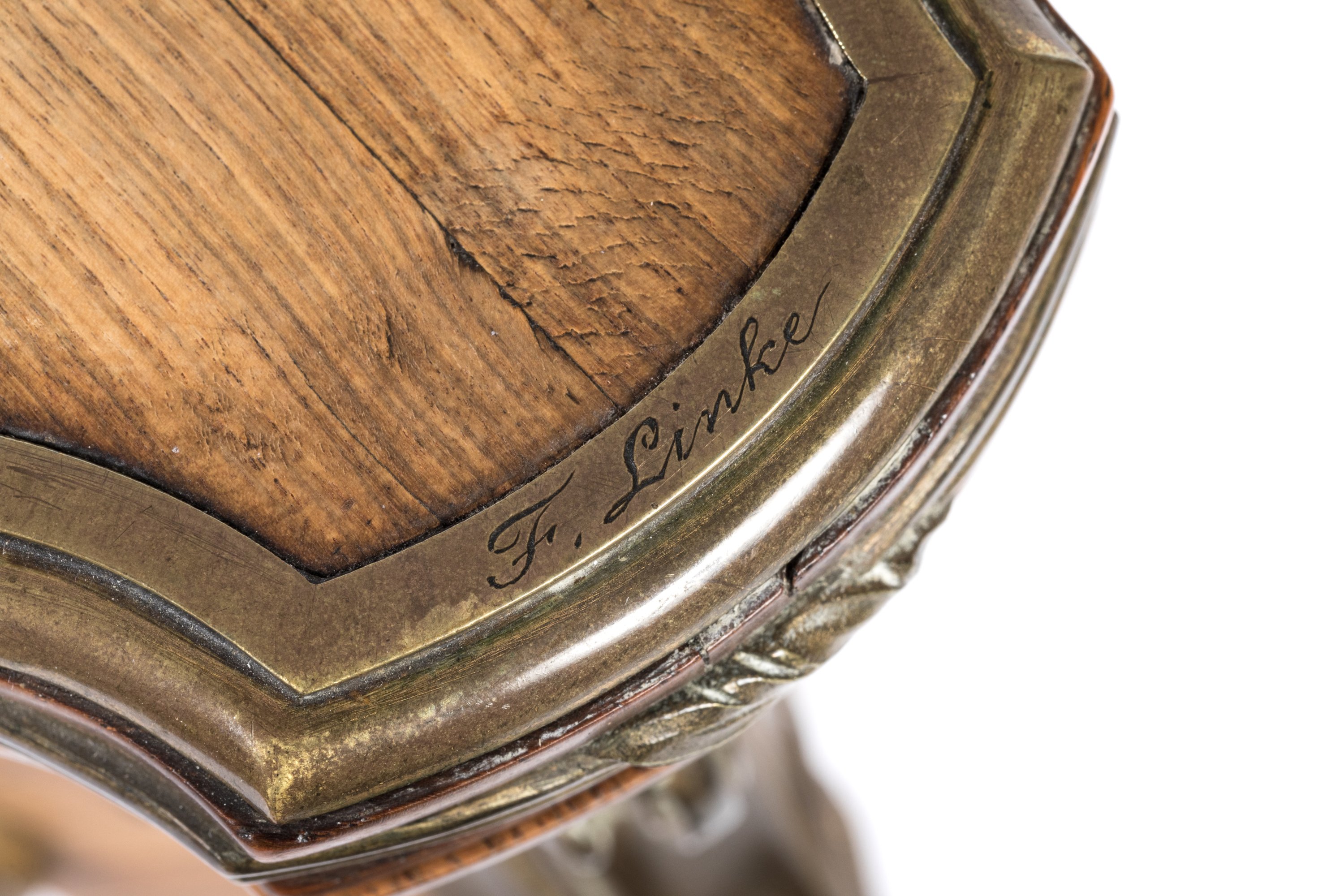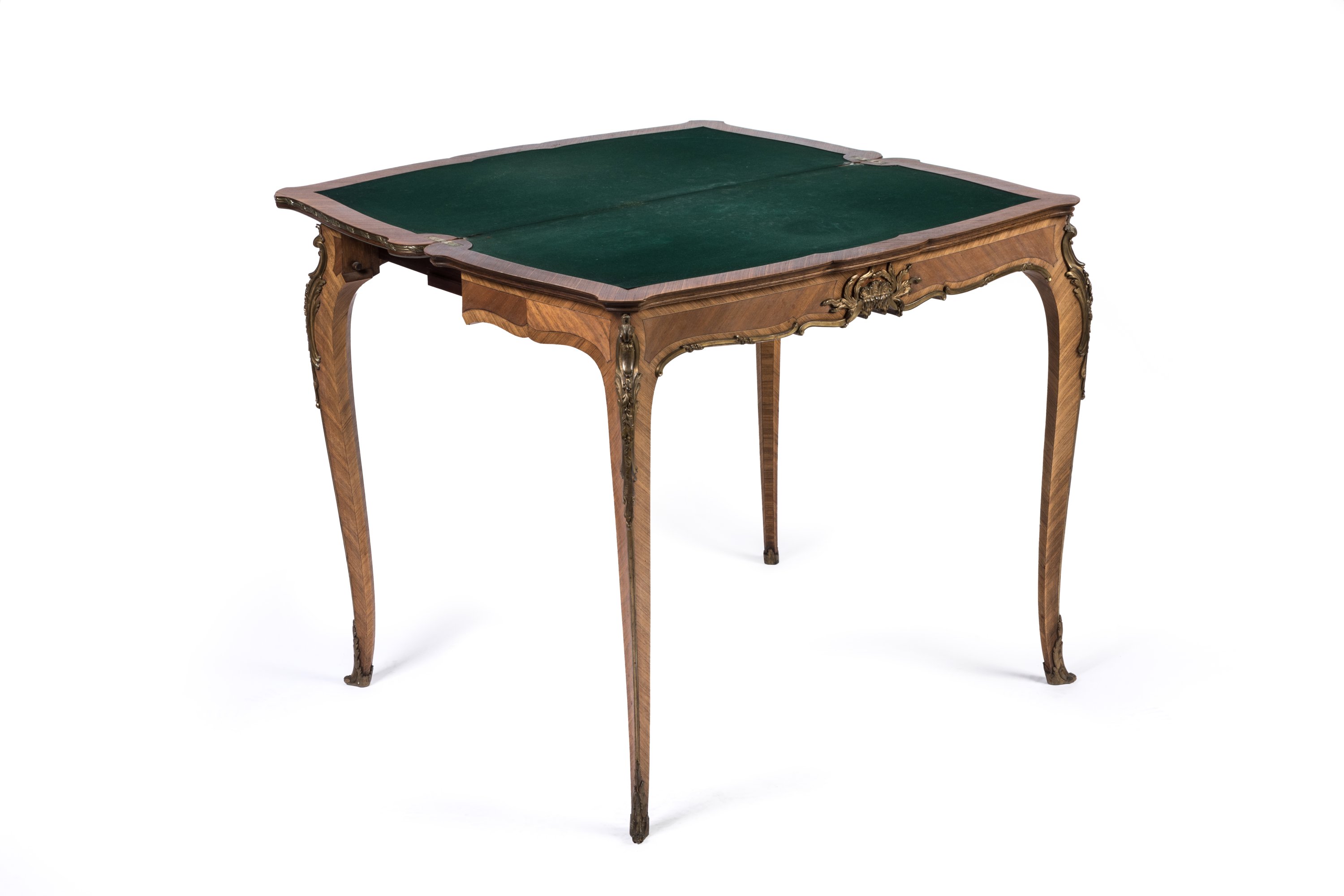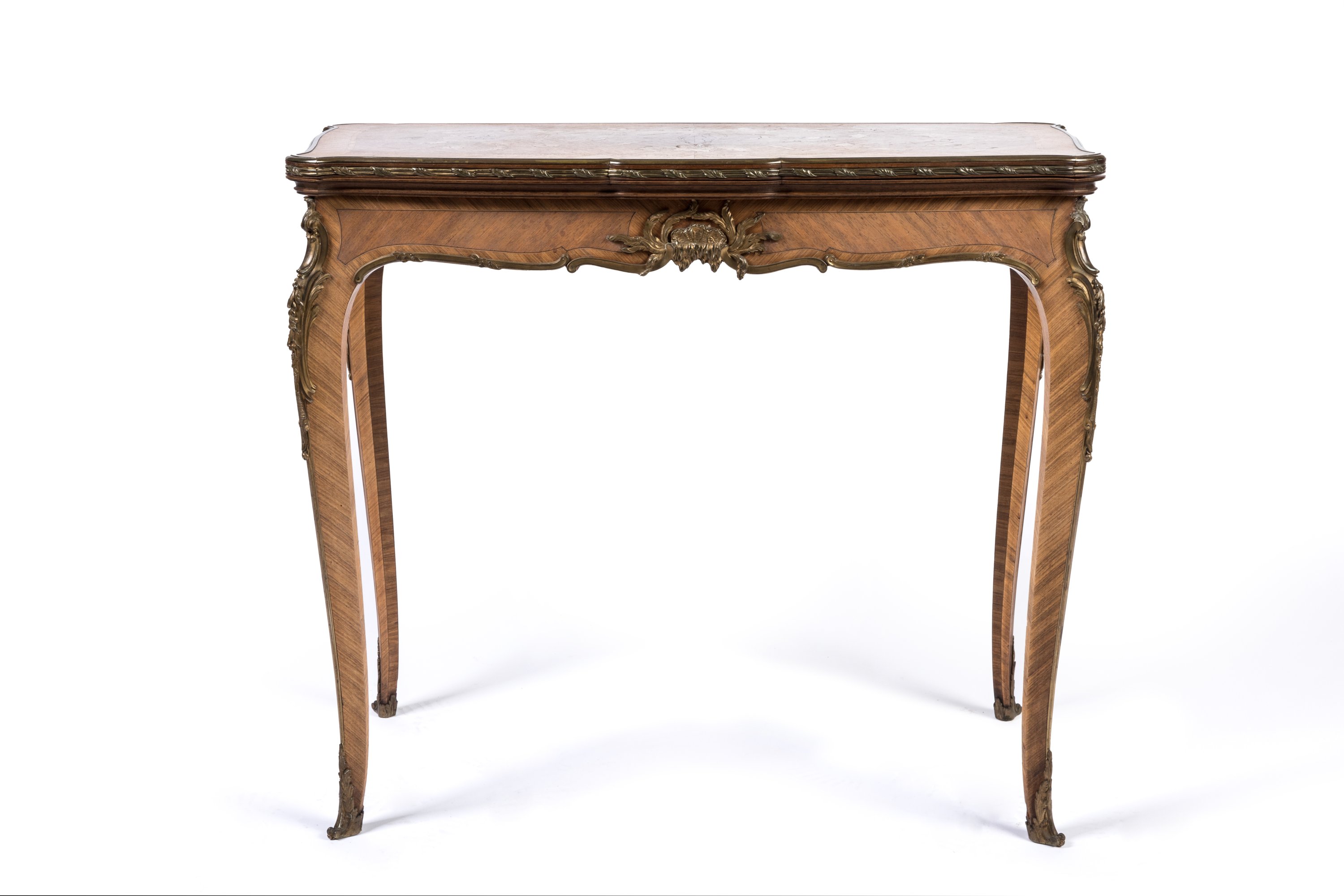 A Louis XV-style rosewood veneered games table by François Linke. Bronze rococo ornaments. Signed.