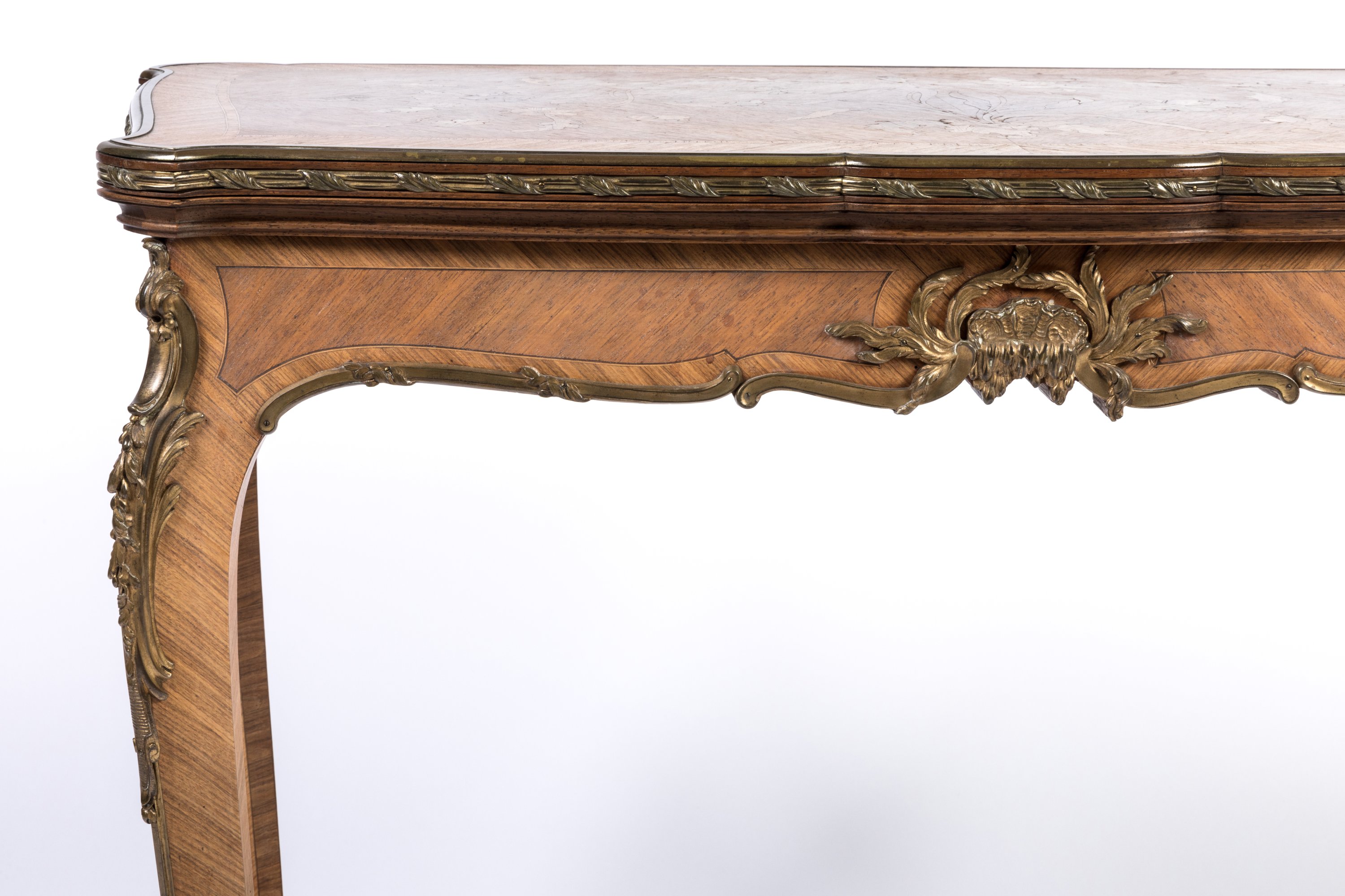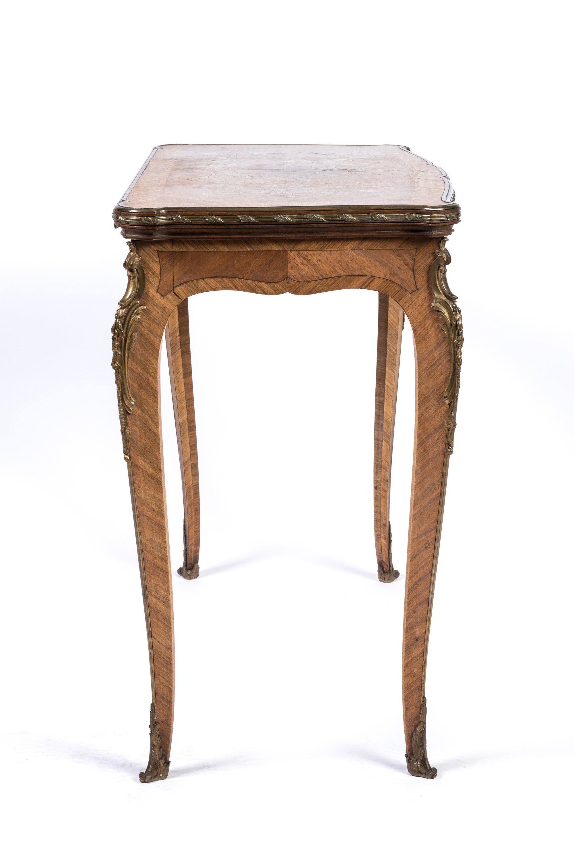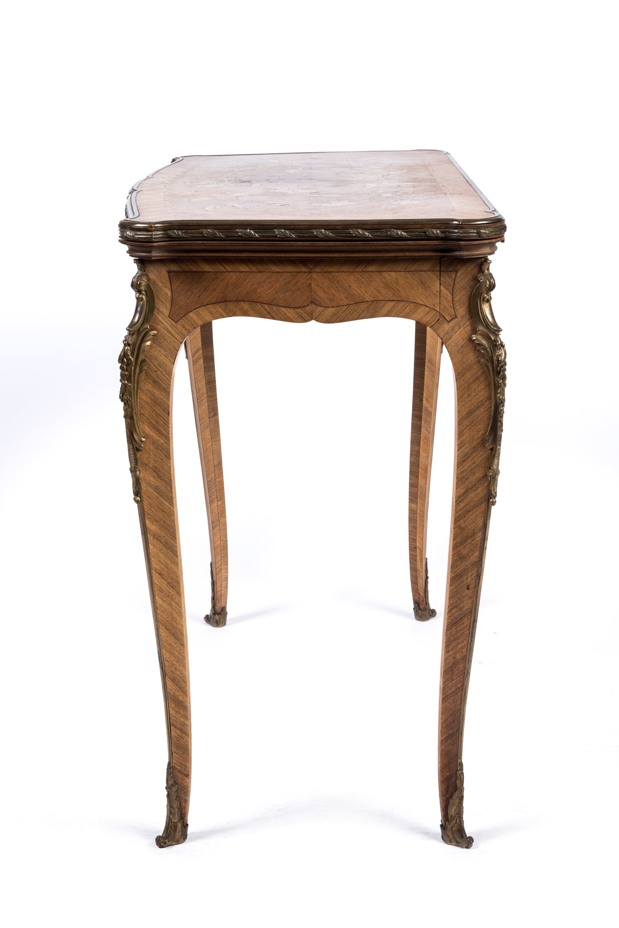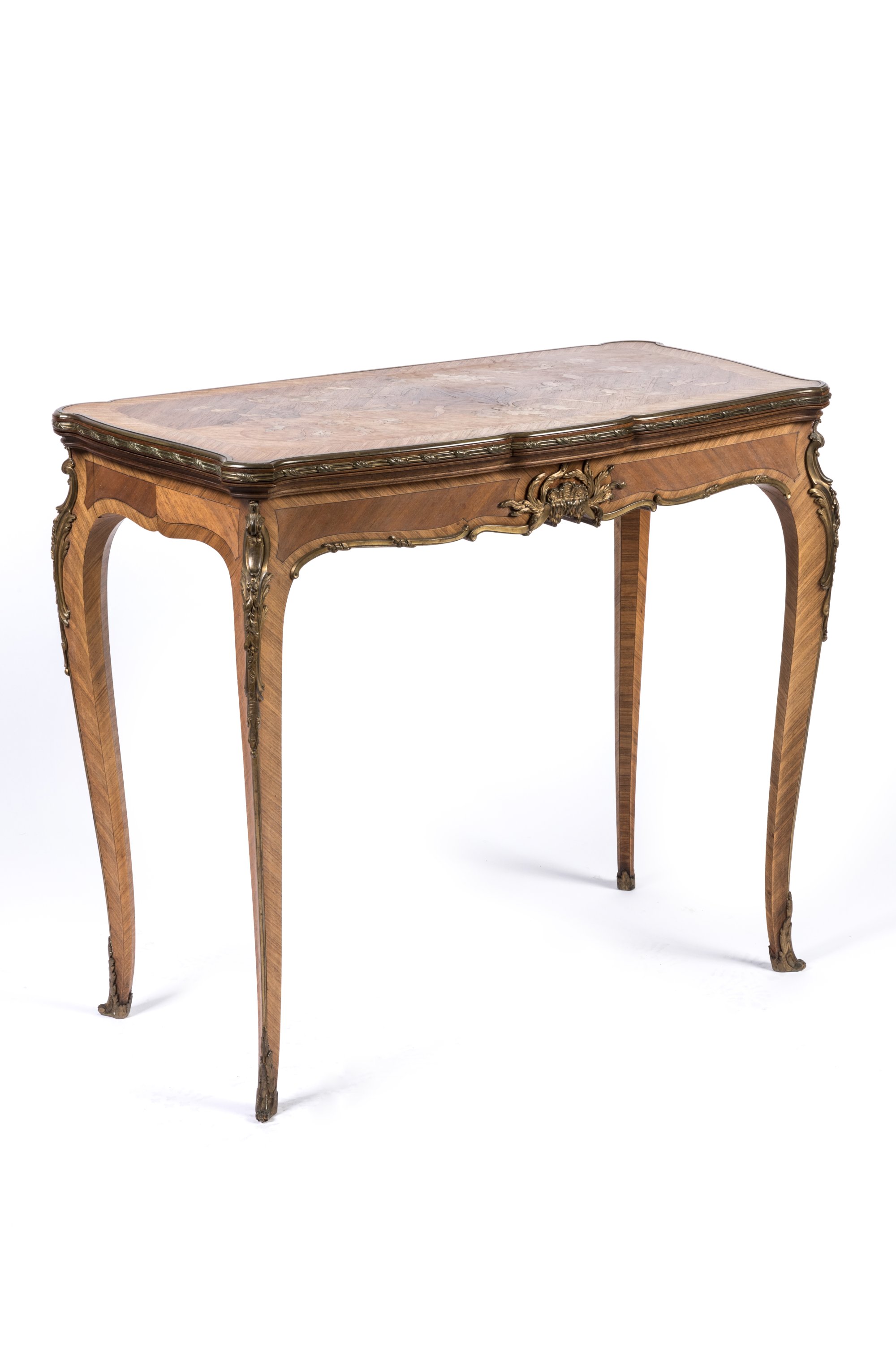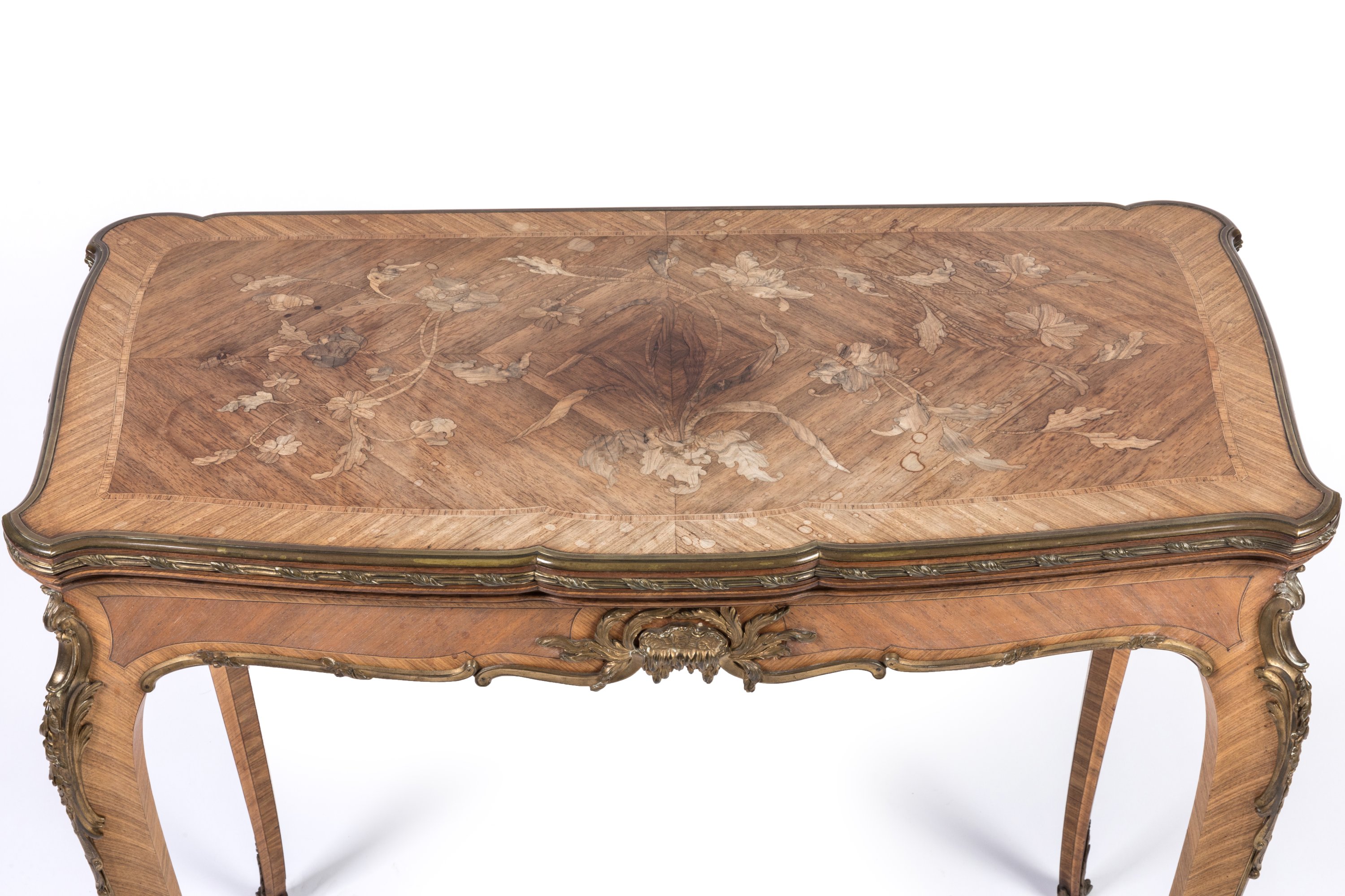 en marqueterie sur fond de bois de rose. Le plateau dépliant de forme mouvementée souligné d'une lingotière est décoré d'une marqueterie figurant un bouquet d'iris en bois de violette et bois de bout. L'intérieur est garni d'un feutre vert. La ceinture chantournée se prolonge par quatre pieds cambrés. Riche ornementation de bronze de style rocaille comme cul de lampe, chutes d'angle, astragales et sabots.