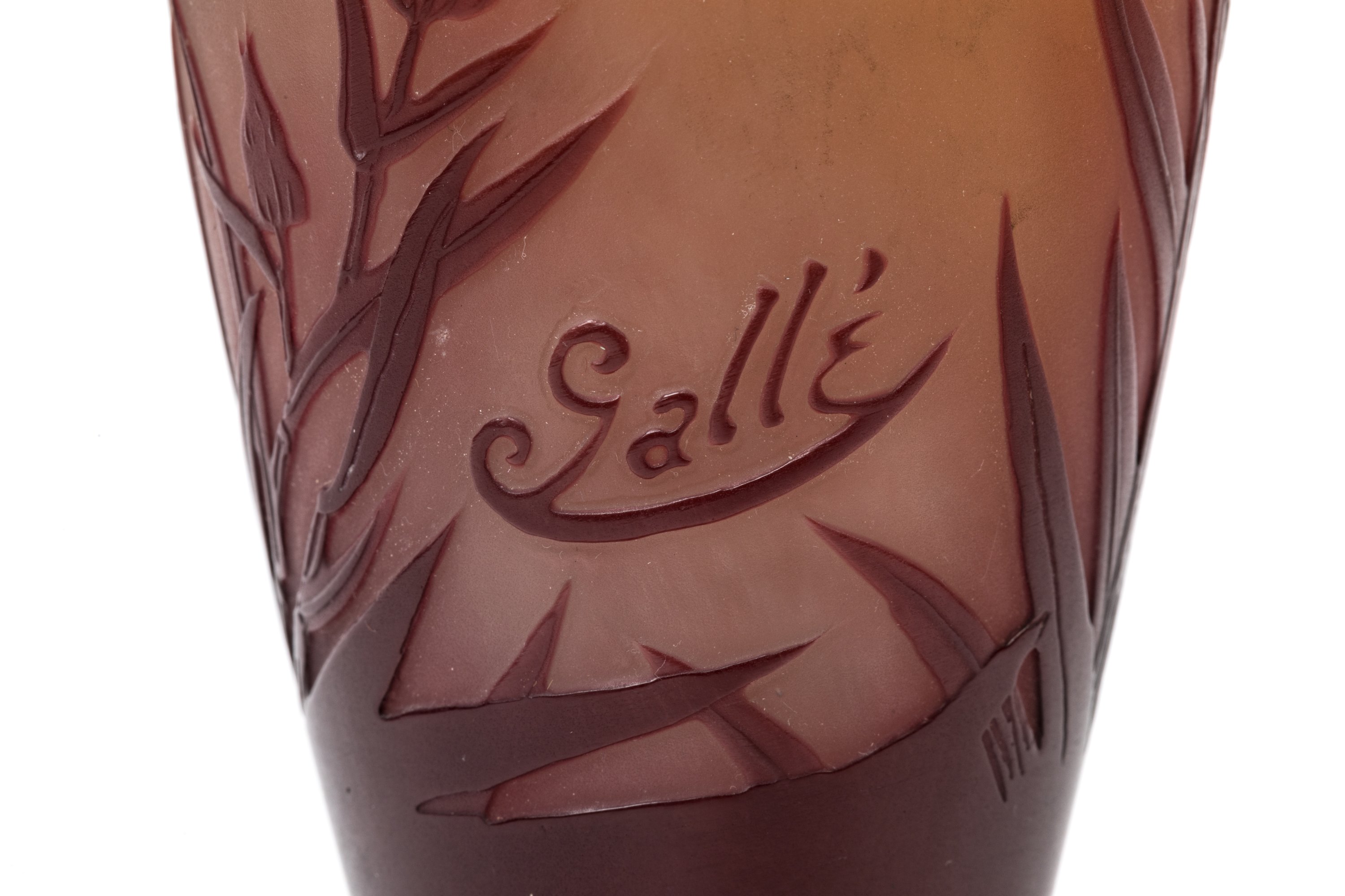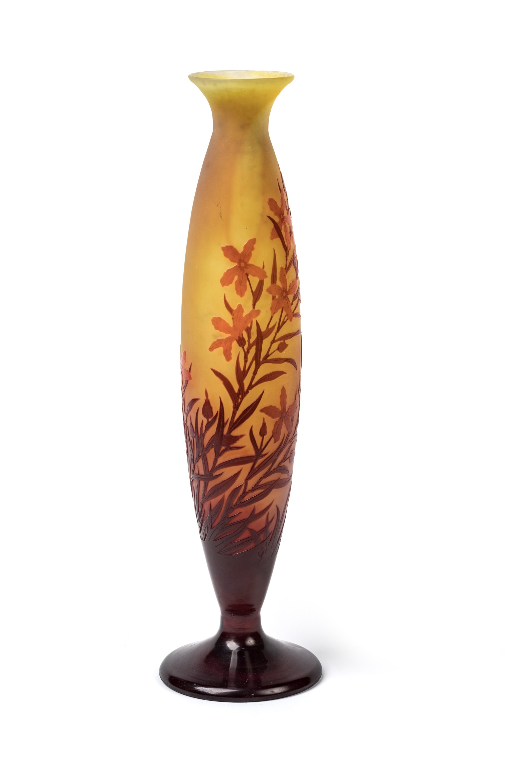 A baluster glass vase by Établissements Gallé decorated with red clematis on a yellow background.
