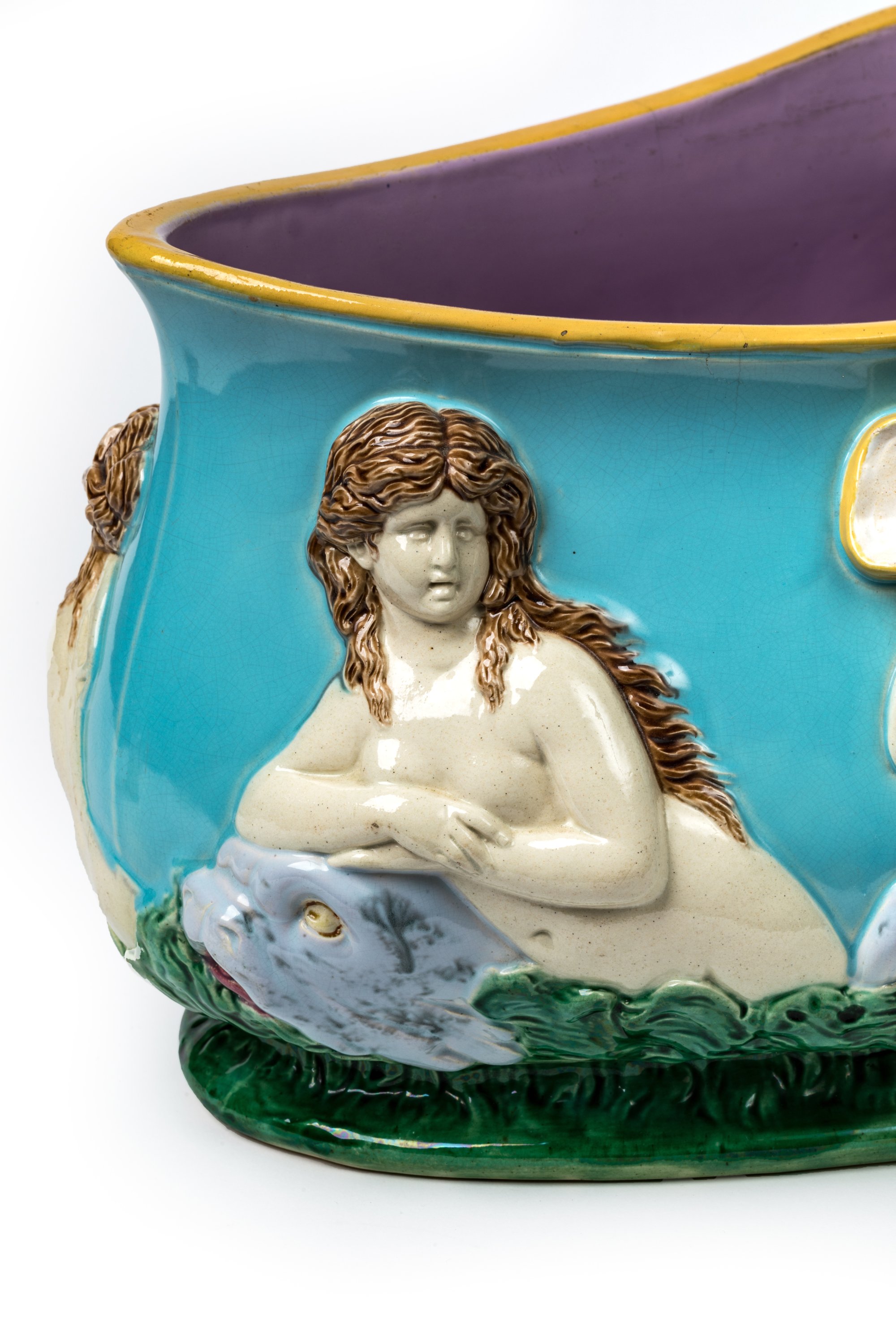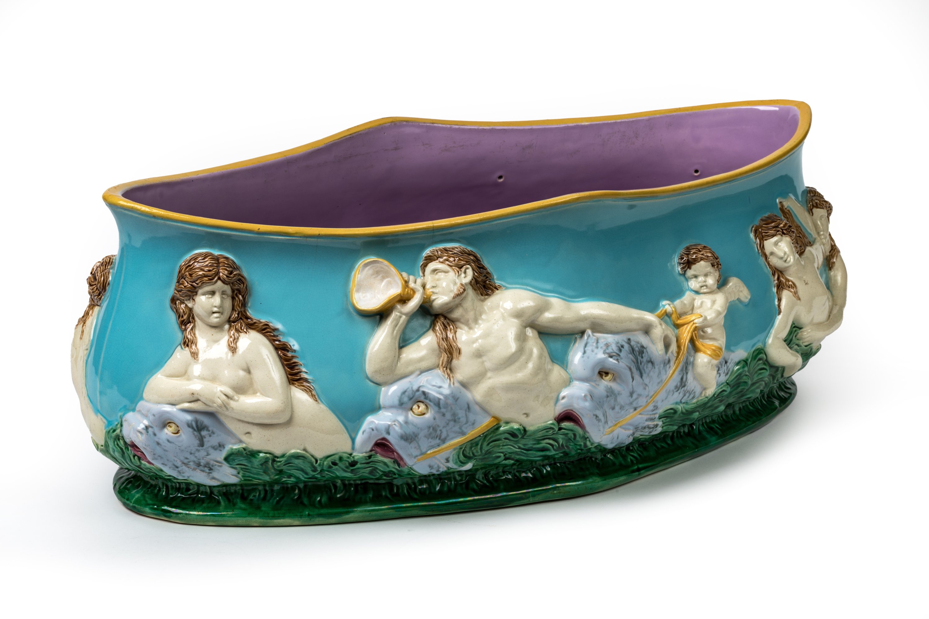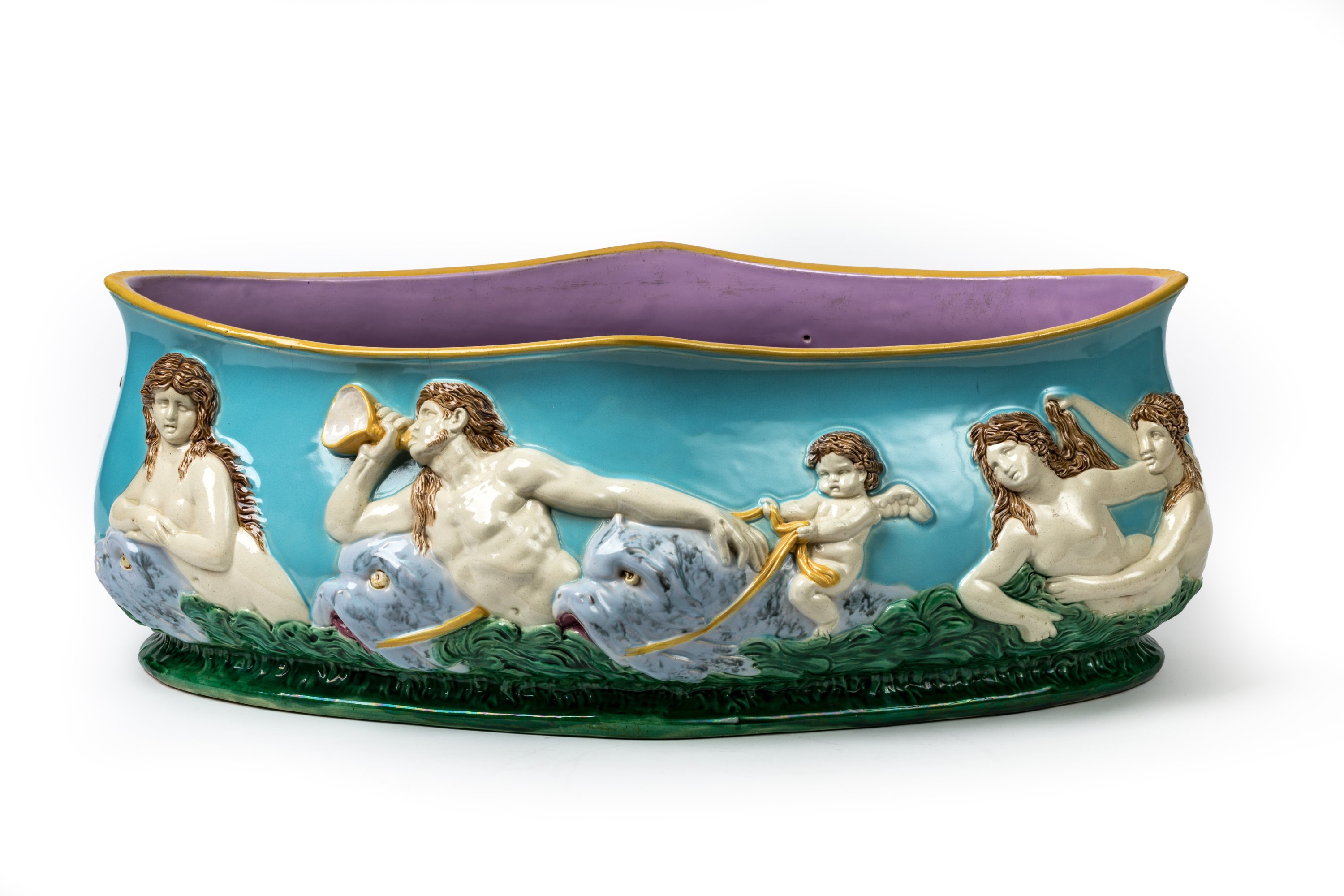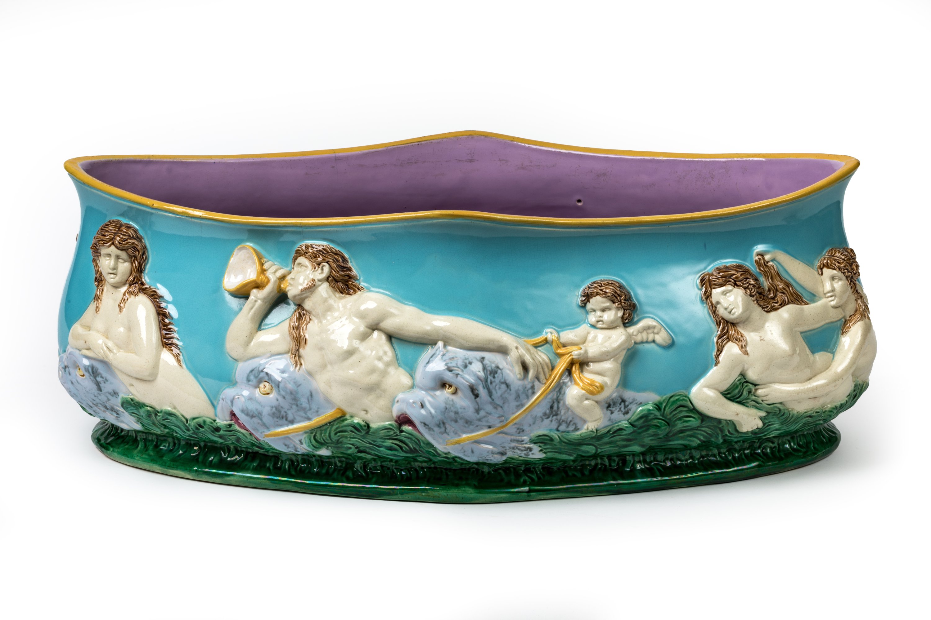 A ca. 1861-1873 majolica centerpiece bowl from George Jones' Trent Pottery at Stoke-On-Trent. Molded with a continuous frieze of nereids and tritons, a Neptune figure blowing a conch shell and leading a team of dolphin harnessed by a putto.