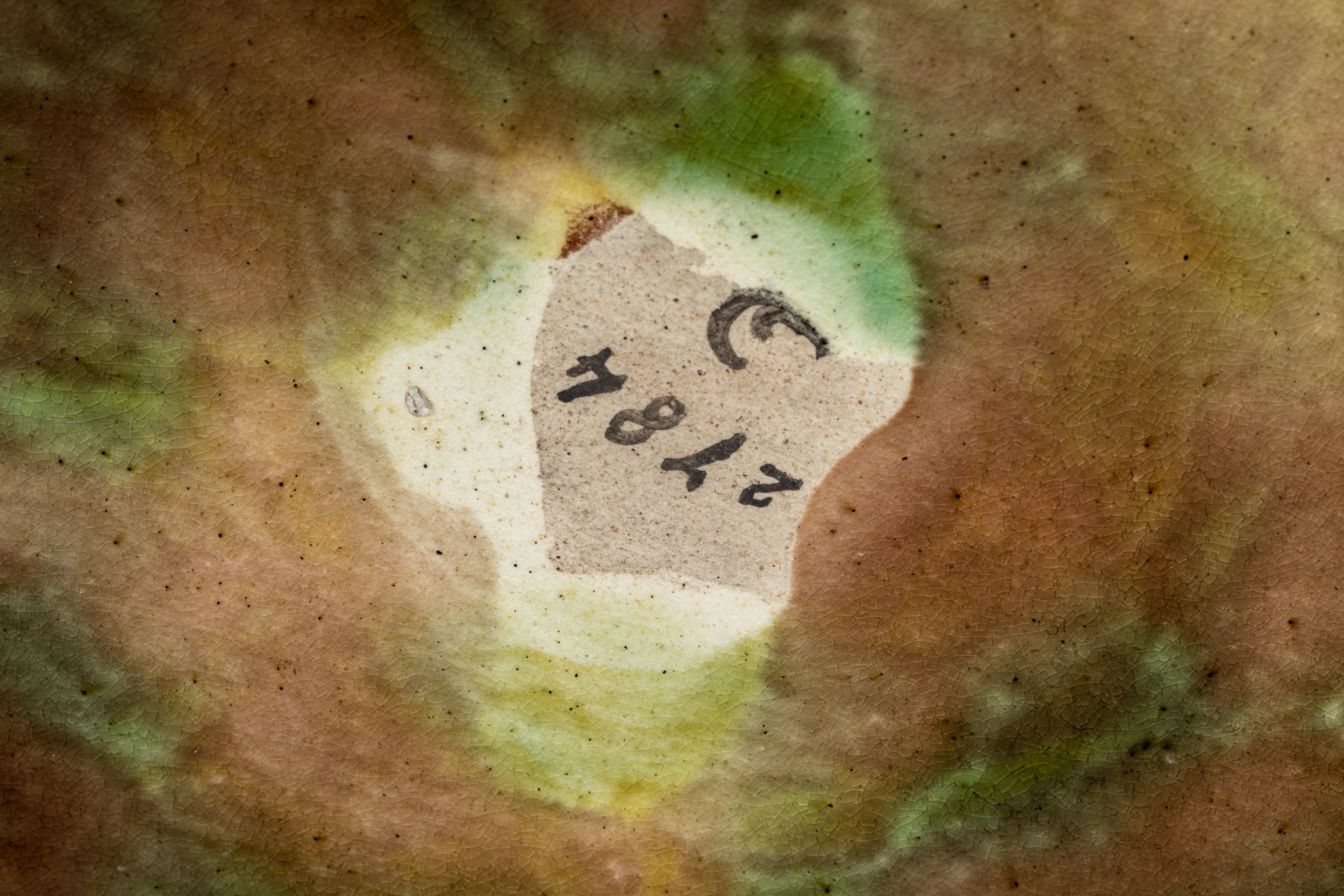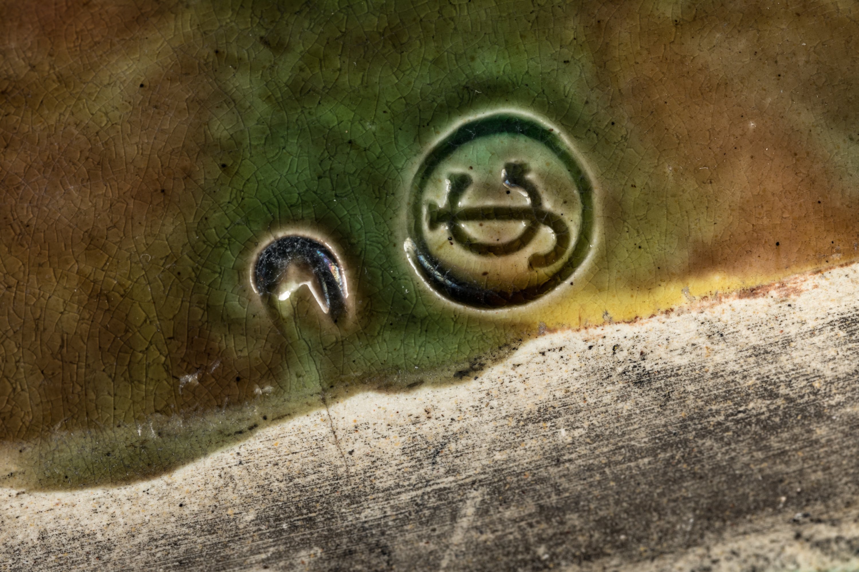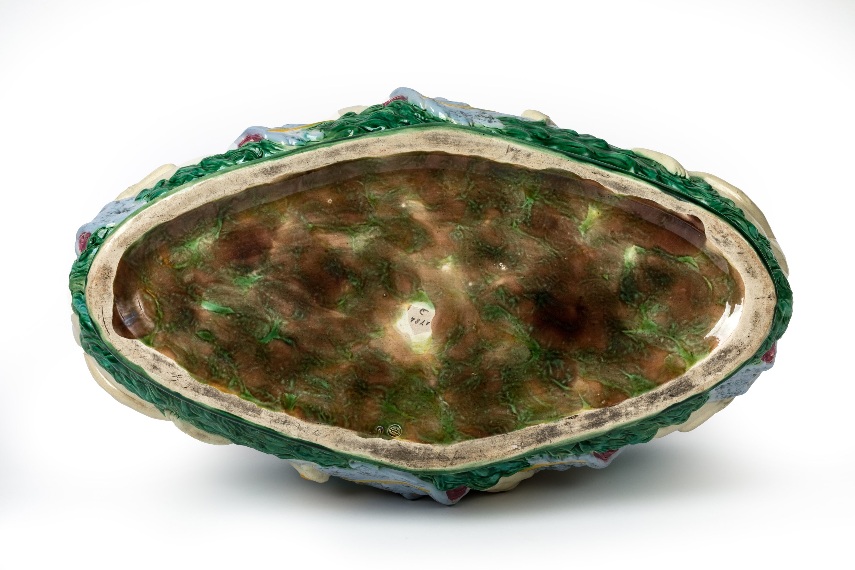 en majolique. La lèvre est soulignée d'un liseré jaune, le corps est orné d'un décor tournant en relief figurant des Naïades et Tritons accompagnés d'un putto conduisant un couple de dauphins. L'intérieur de couleur parme, le revers marbré brun et vert.