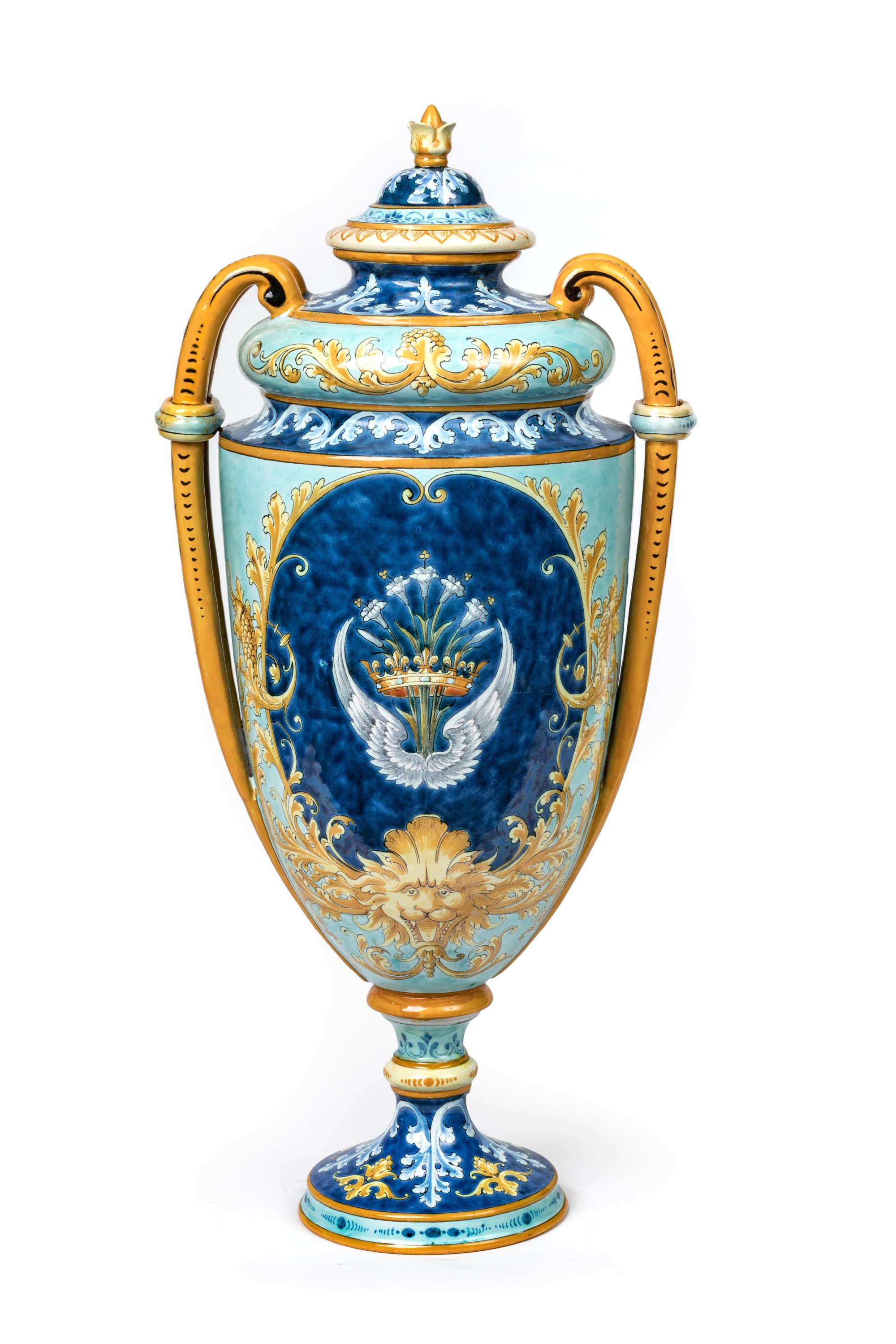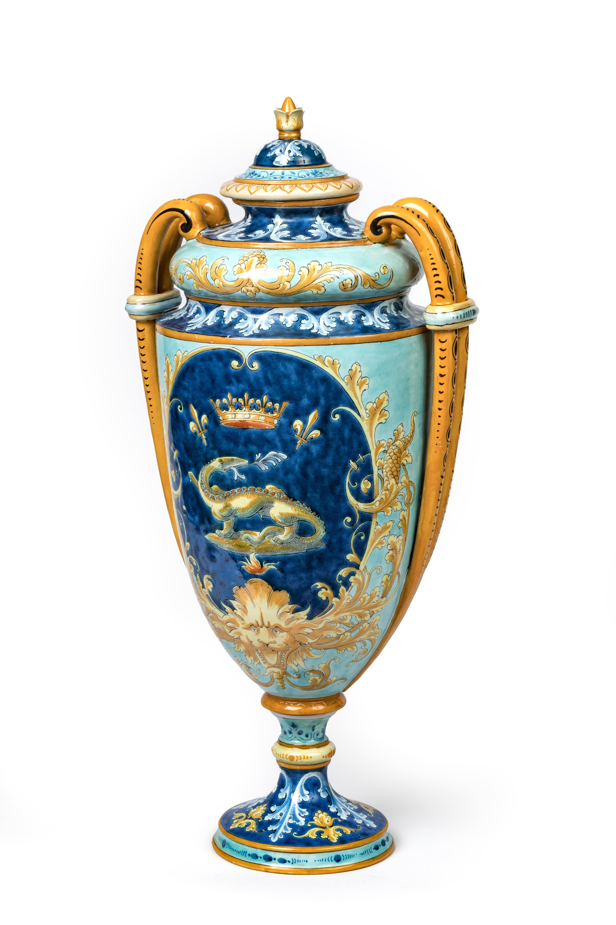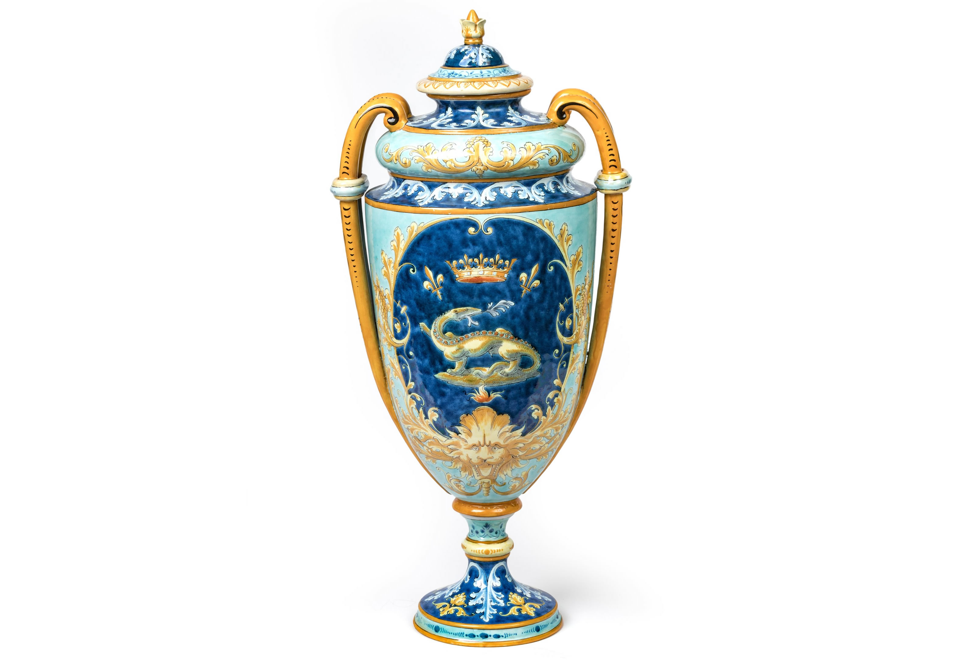 Early 20th century. A polychrome majolica covered vase by Ulysse Balon decorated with a crowned salamander and two bird wings linked by a string, emblems of King Francois I and Louise of Savoy.