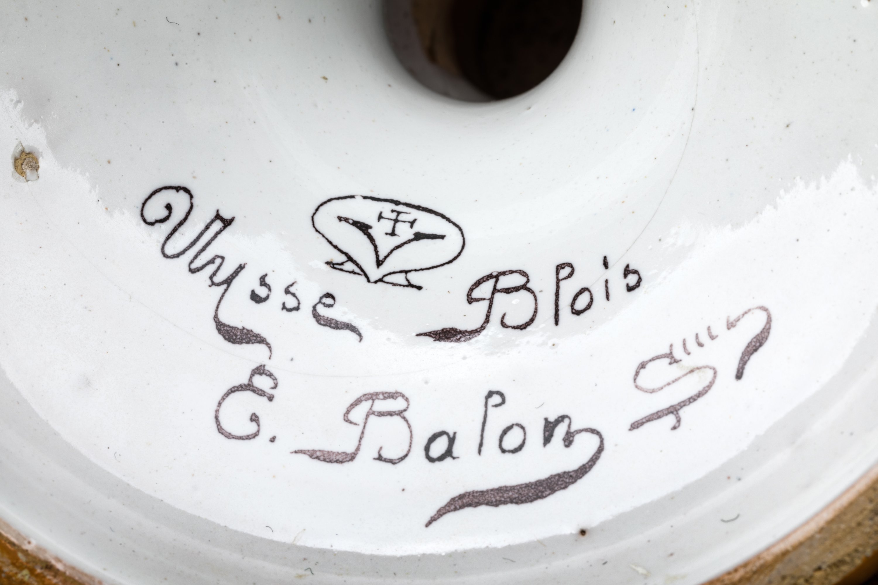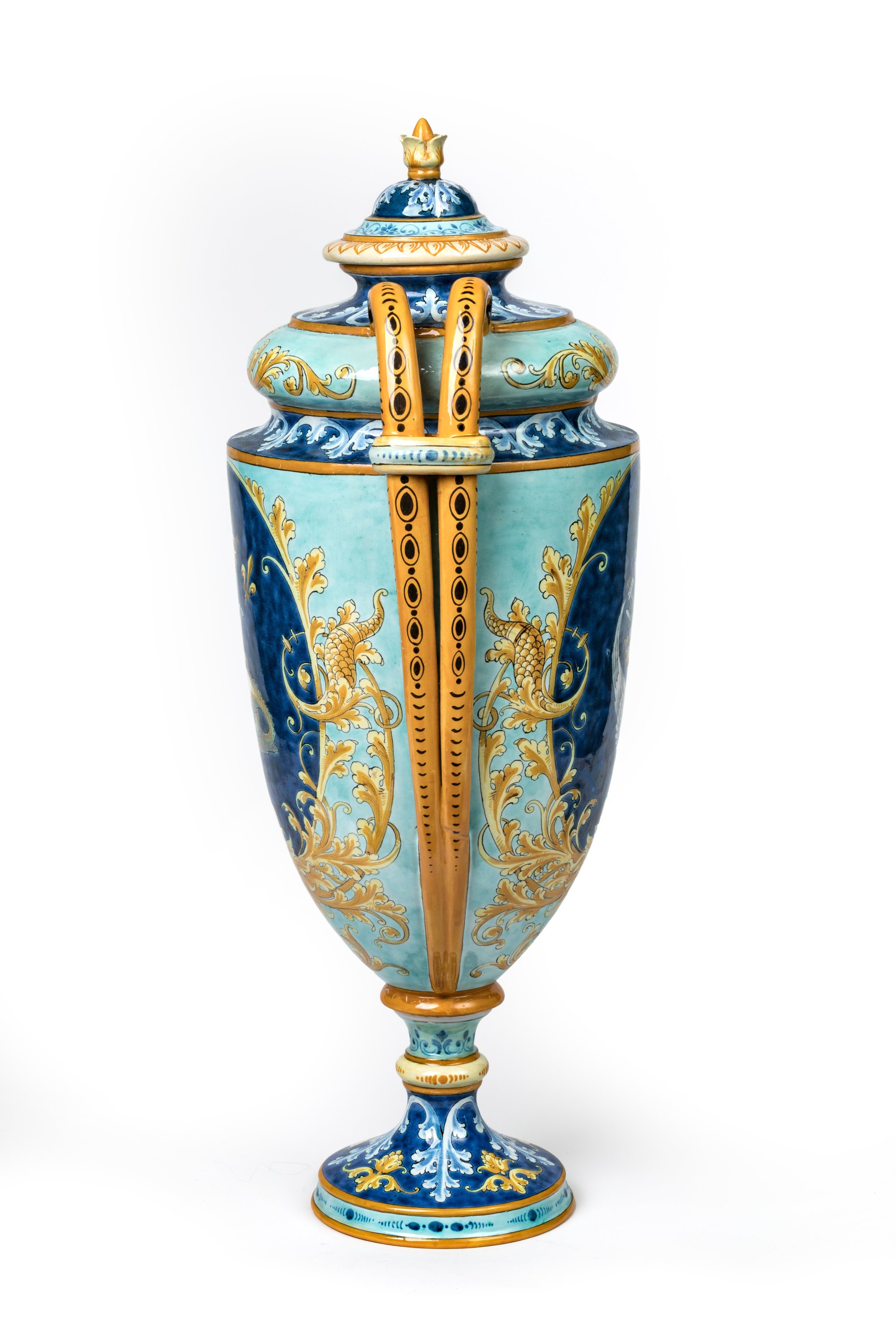 en faïence polychrome à décor de deux cartouches à fond bleu ornés aux centres d'une salamandre couronnée pour François Ier et de deux ailes d'oiseau reliés par une cordelette pour Louise de Savoie. Les deux anses ajourées à couverte jaune s'enroulent au sommet de la pièce.