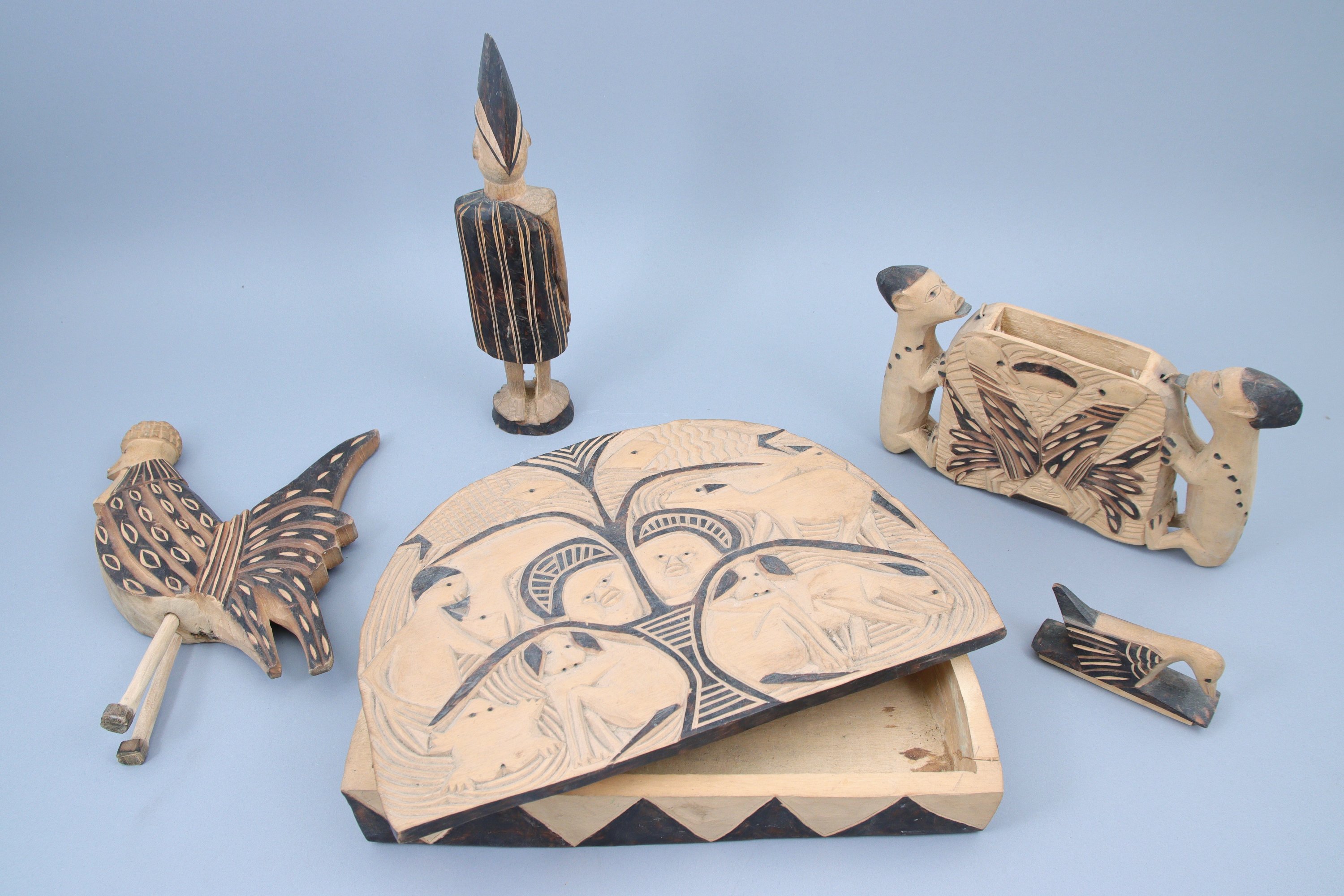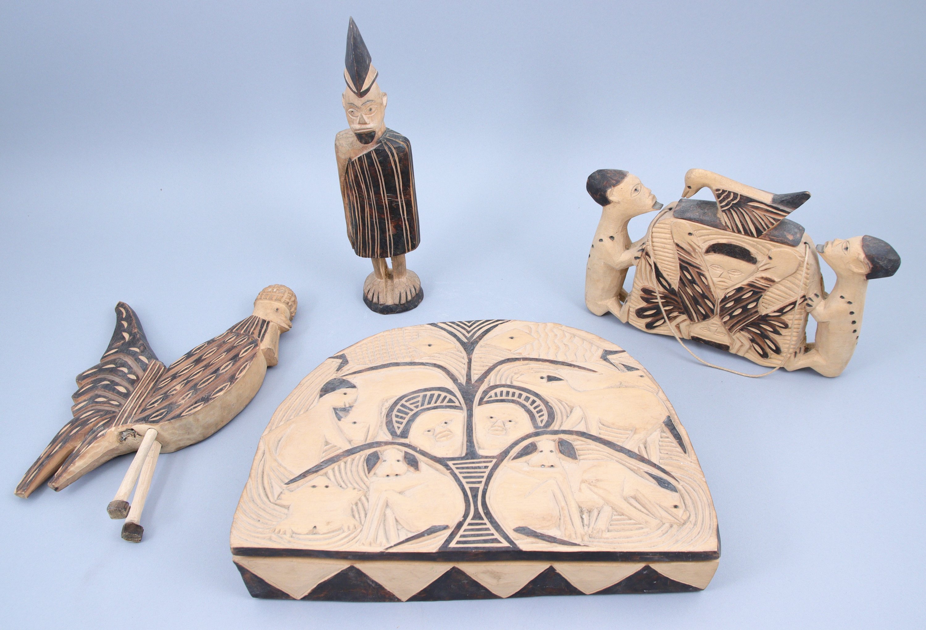 comprenant une boite couverte en forme de demi-lune, une boite couverte ornée de deux personnages, une statue représentant un personnage debout avec coiffure en crête centrale et une statuette de volatile.