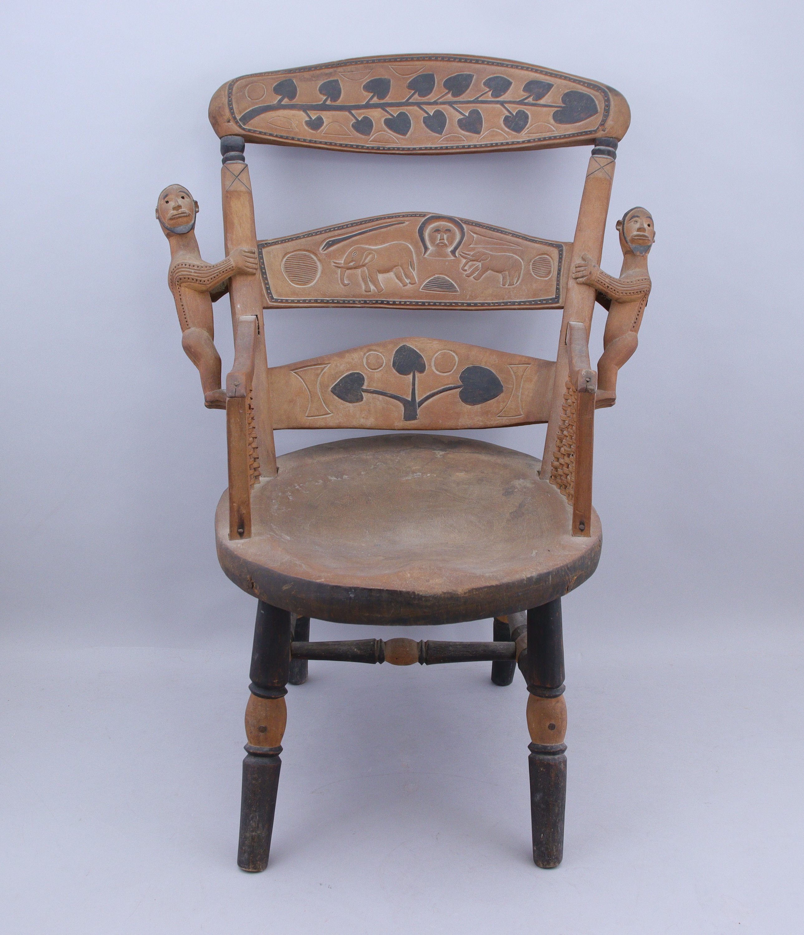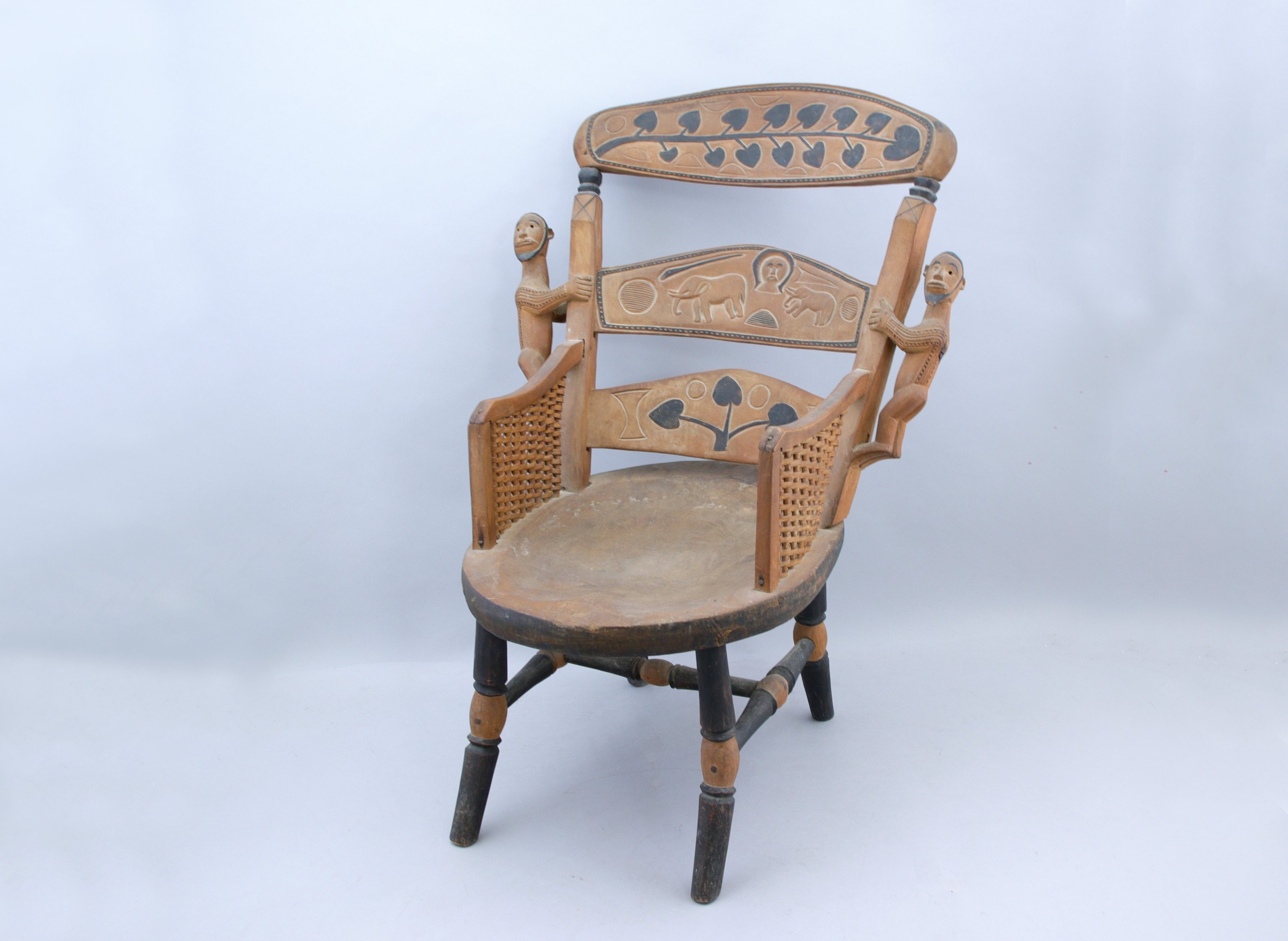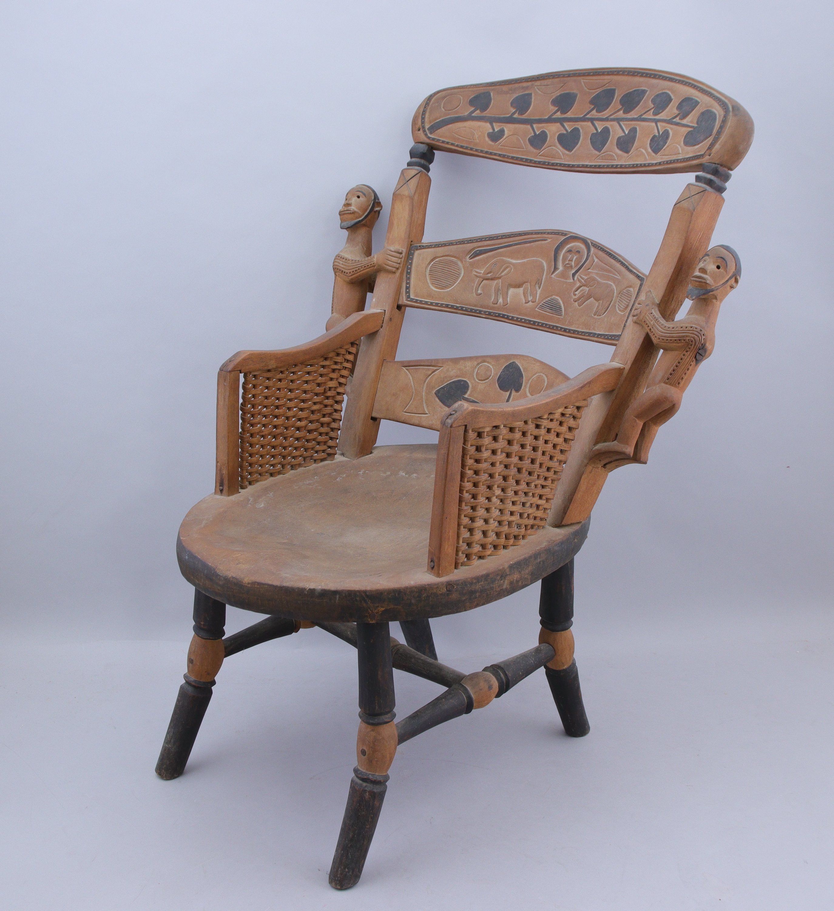 à l’usage des chefs coutumiers ou des cercles coloniaux. Inspiré des modèles occidentaux ce fauteuil est canné sous les accoudoirs, les montants du dossiers ornés de deux personnages et le dossier gravé de motifs floraux, de deux éléphants et d’une tête humaine.