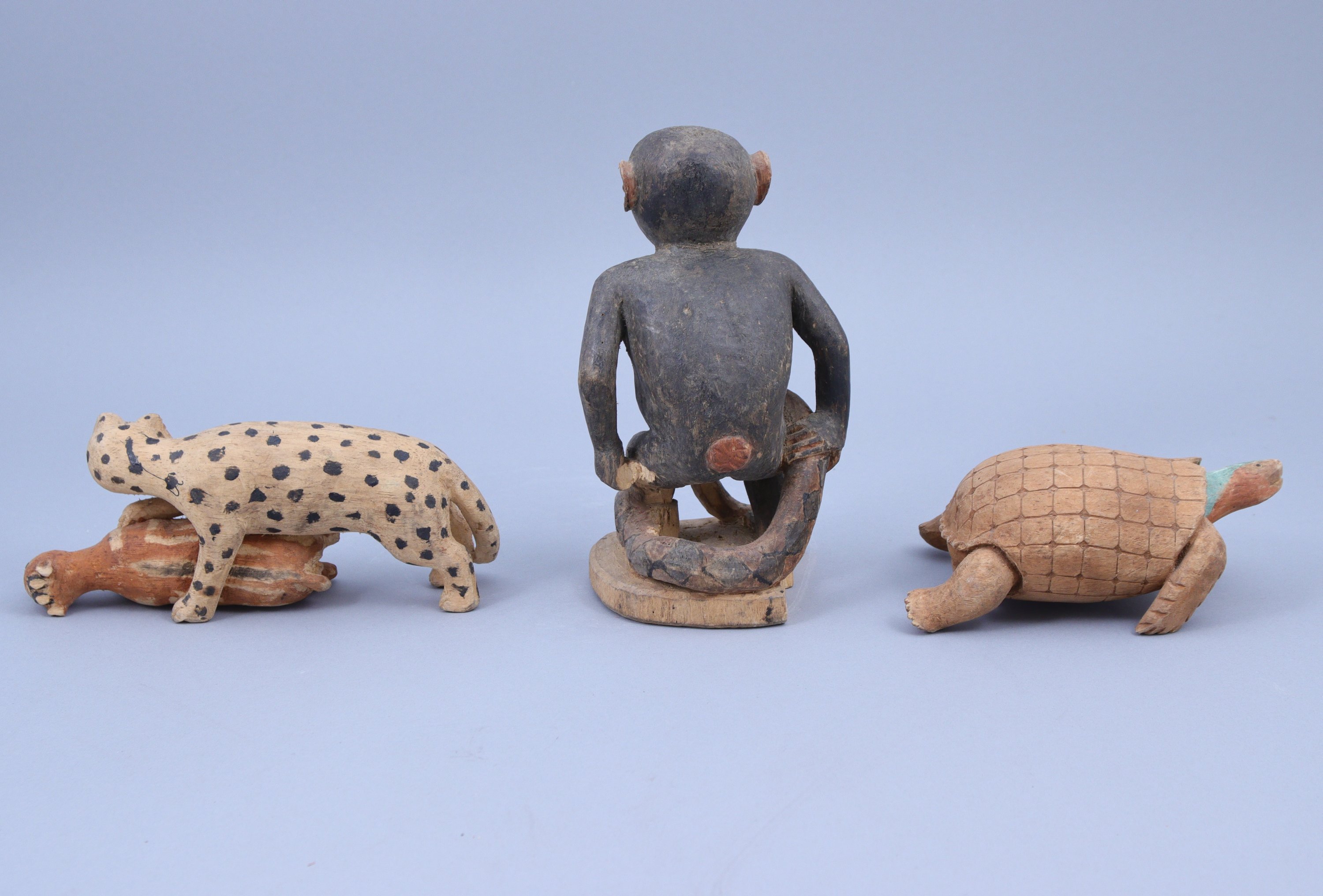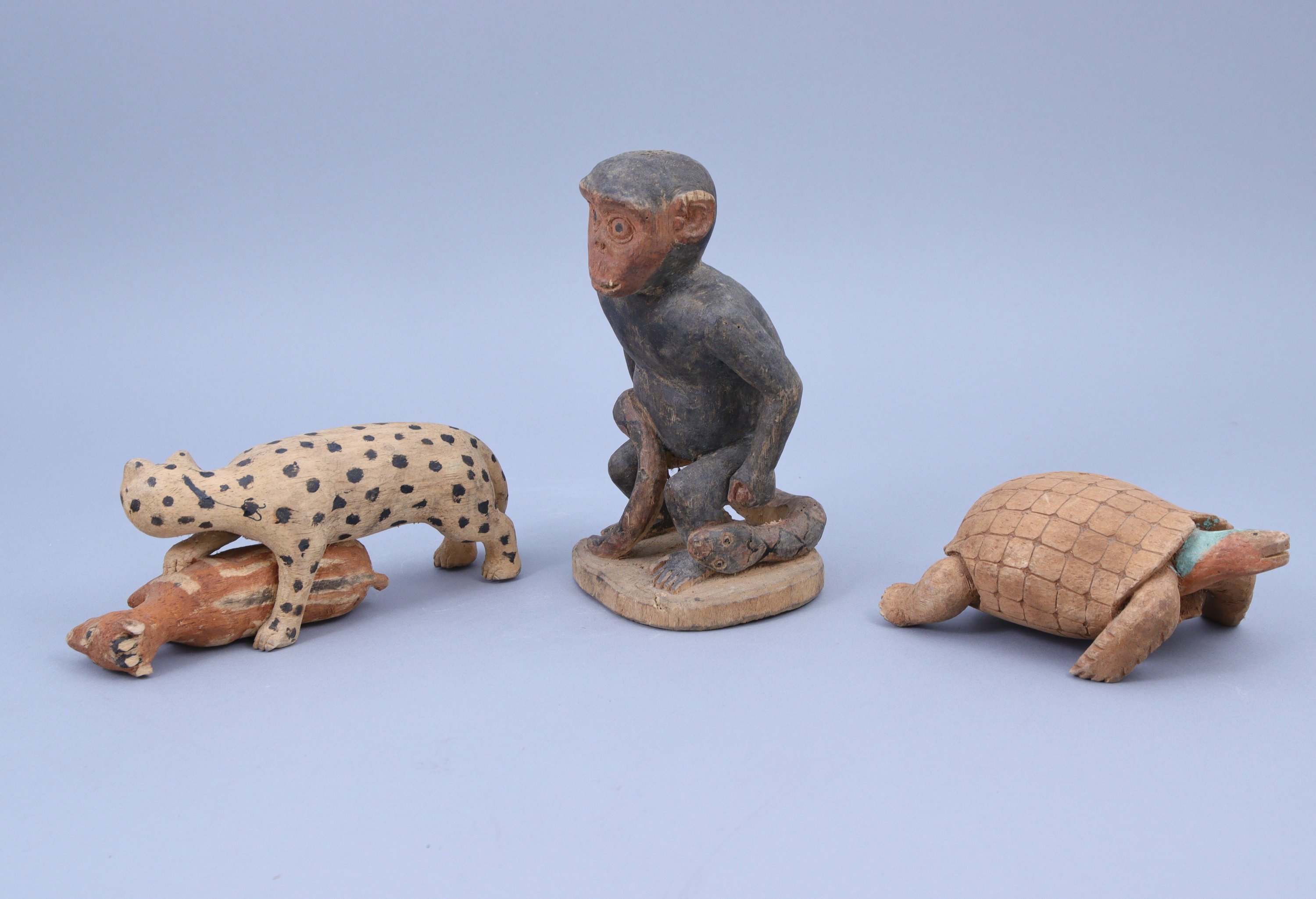 représentant une tortue, un léopard et sa proie (gazelle) et un singe debout au serpent.