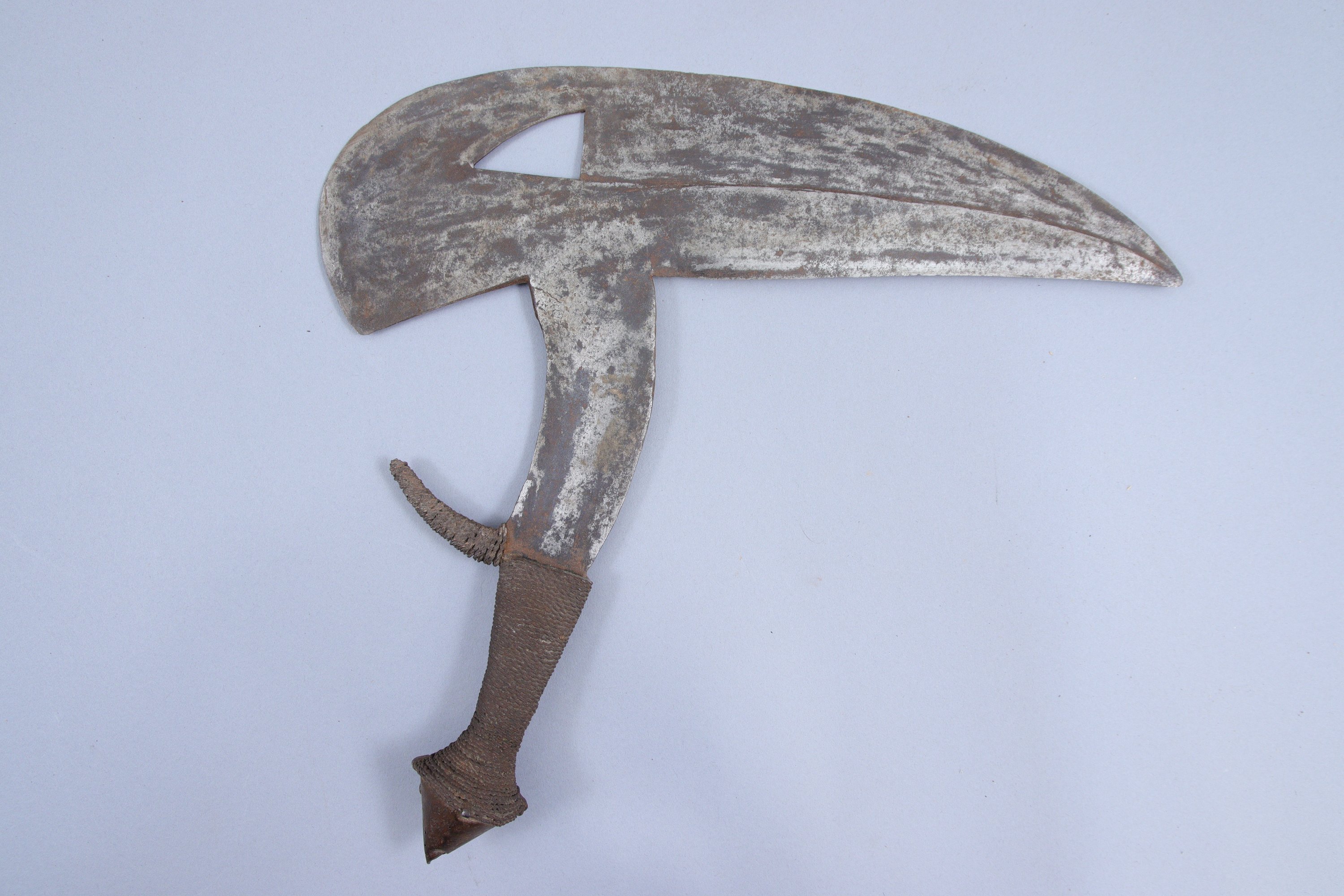en forme de tête de toucan. La lame est percée dun orifice triangulaire caractéristique et un fil de métal est enroulé en spirale autour du manche.