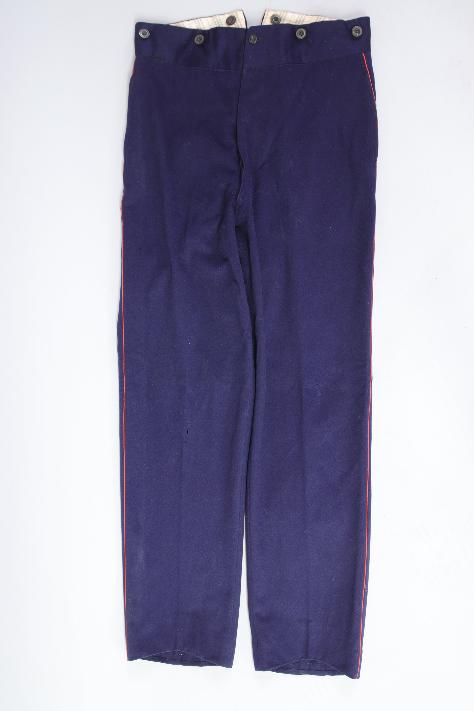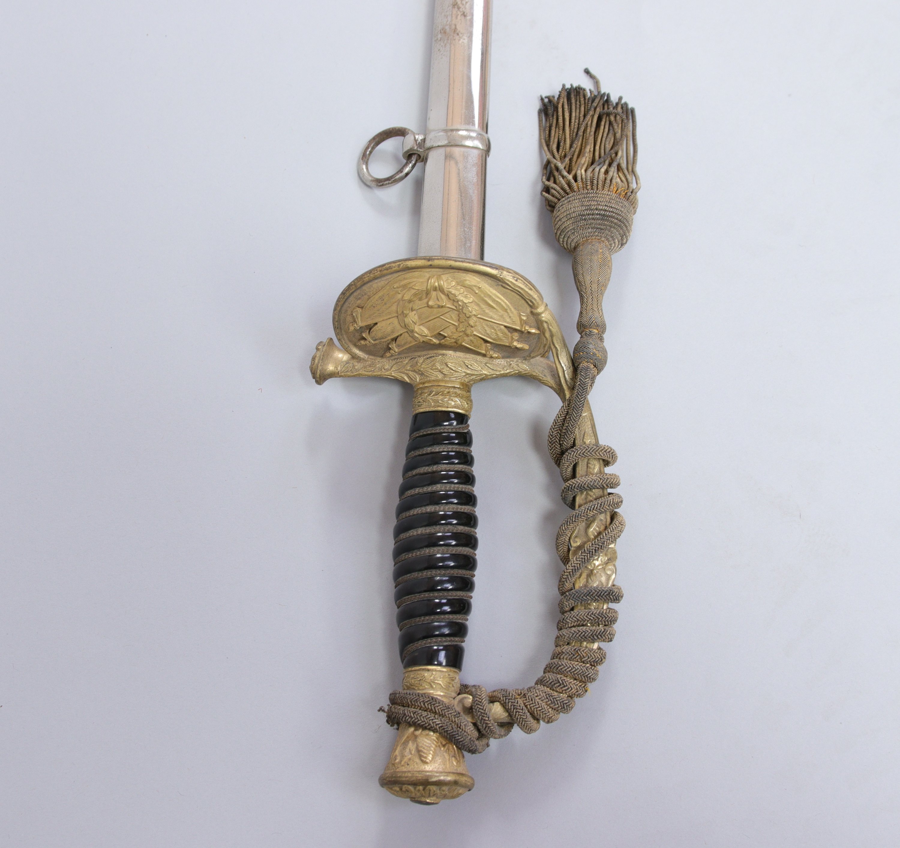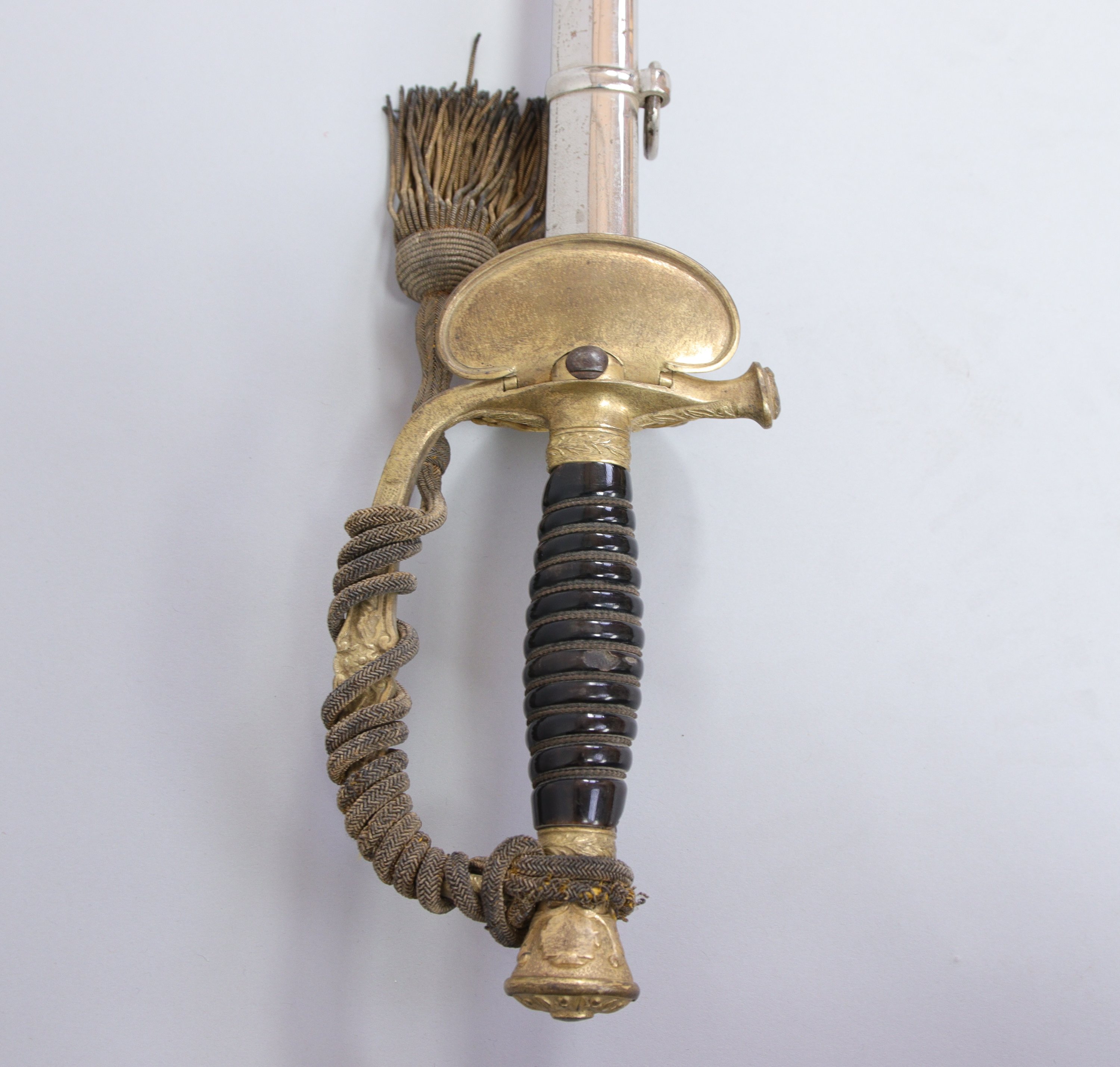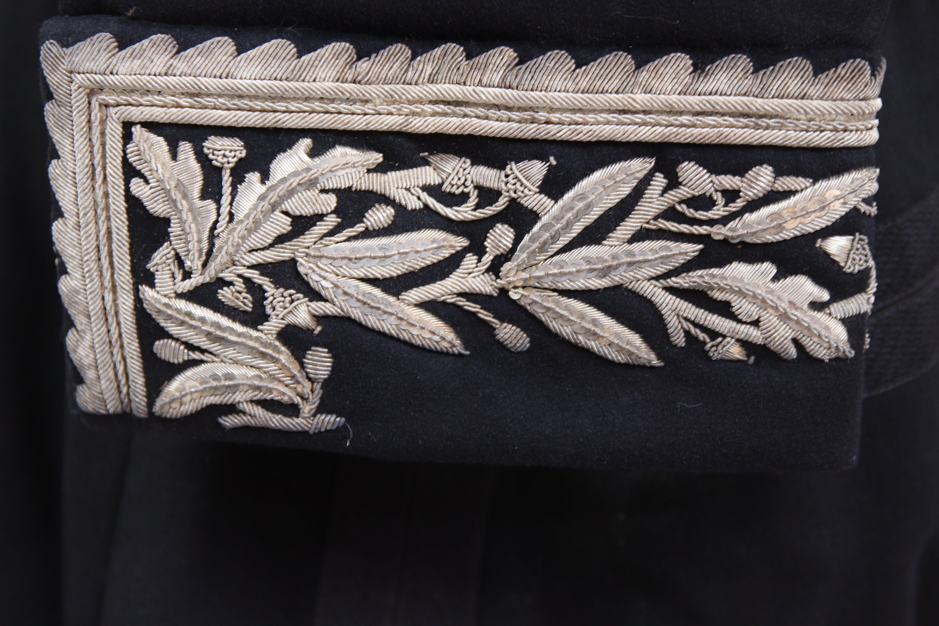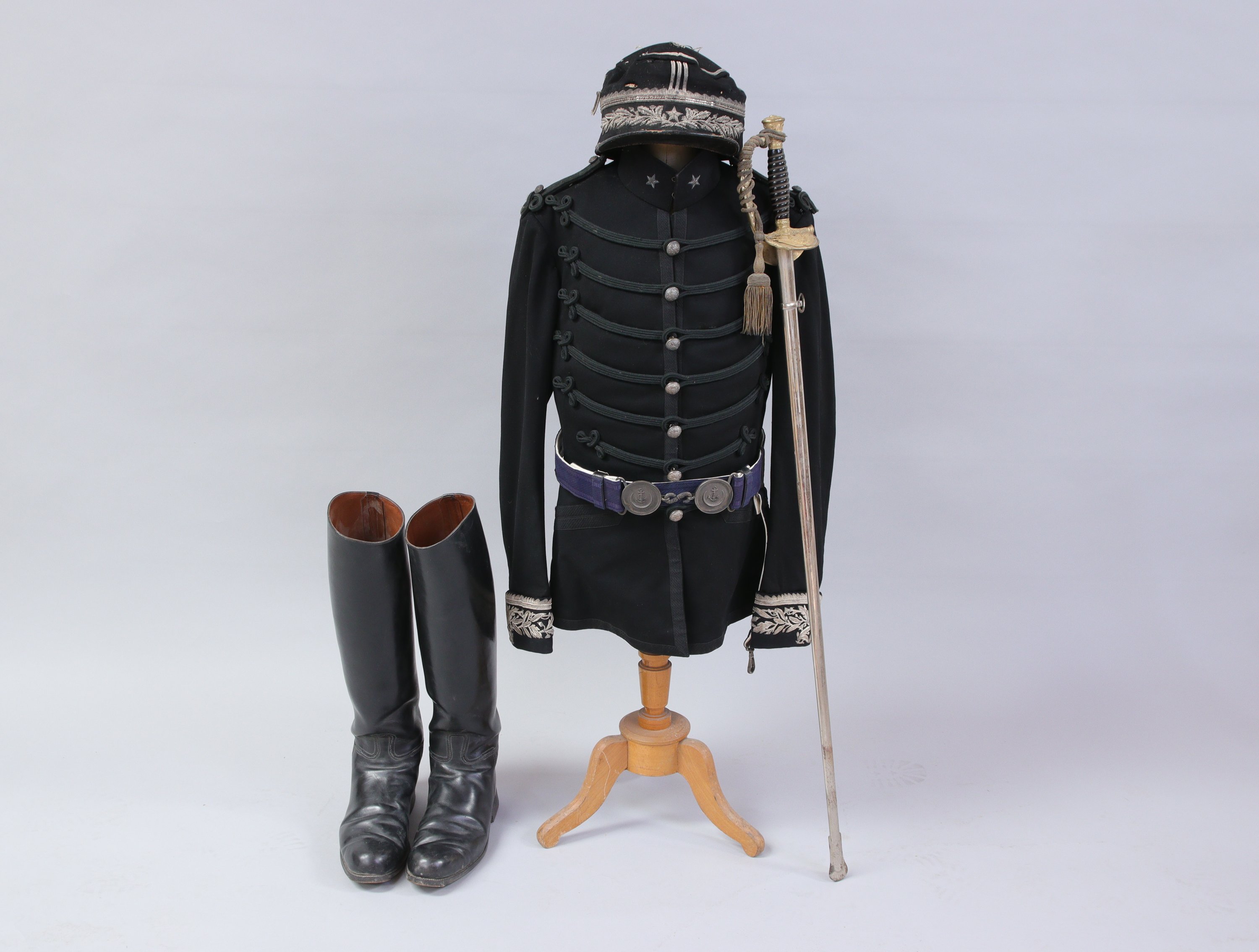 composé d'une veste d'officier et d'un képi en drap noir et galons argents, brodé de feuilles de chêne, d'un ceinturon, d'un pantalon de drap bleu et rouge, d'une paire de bottes et d'une épée en acier et laiton, la fusée en corne torsadéé.