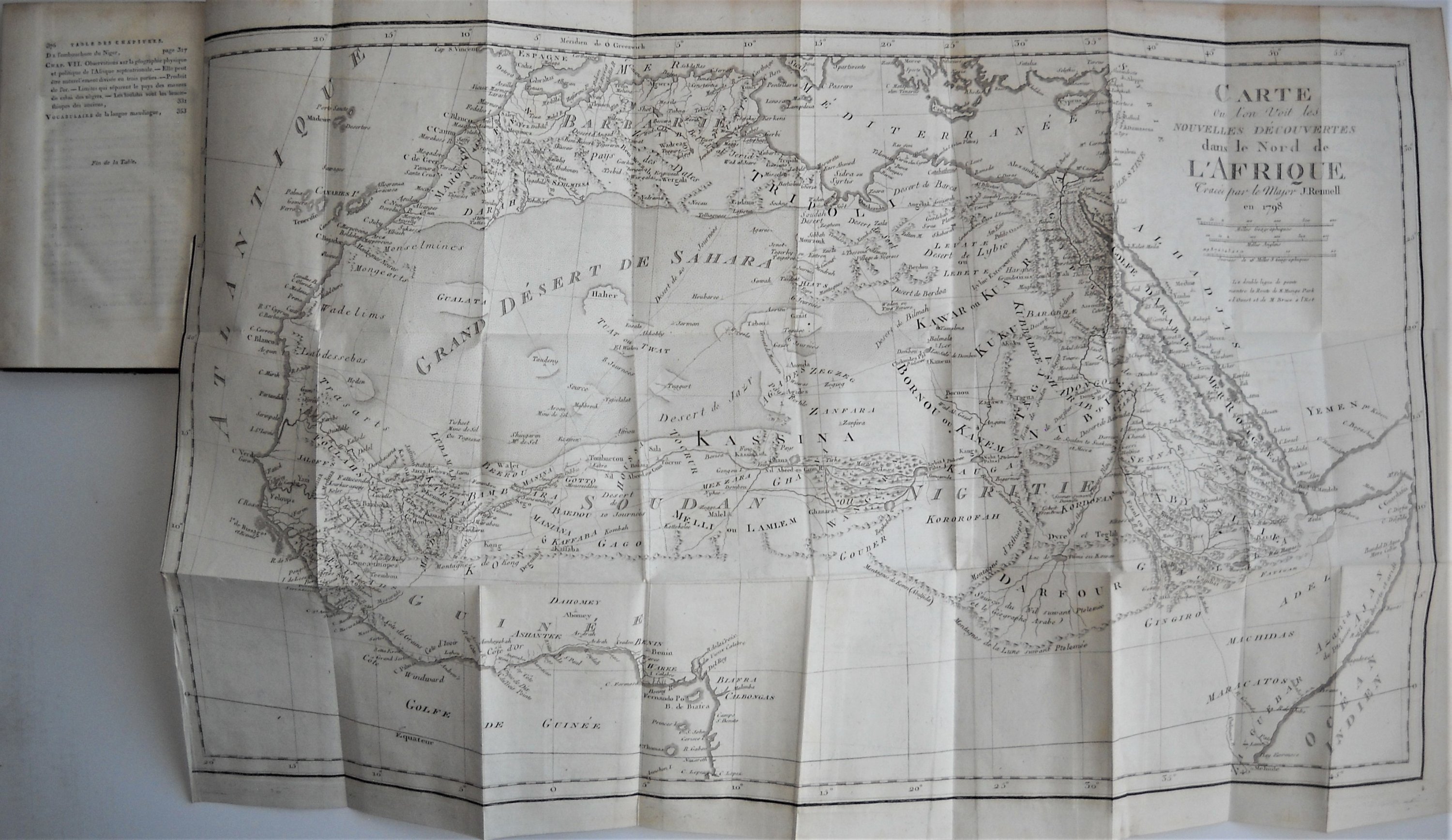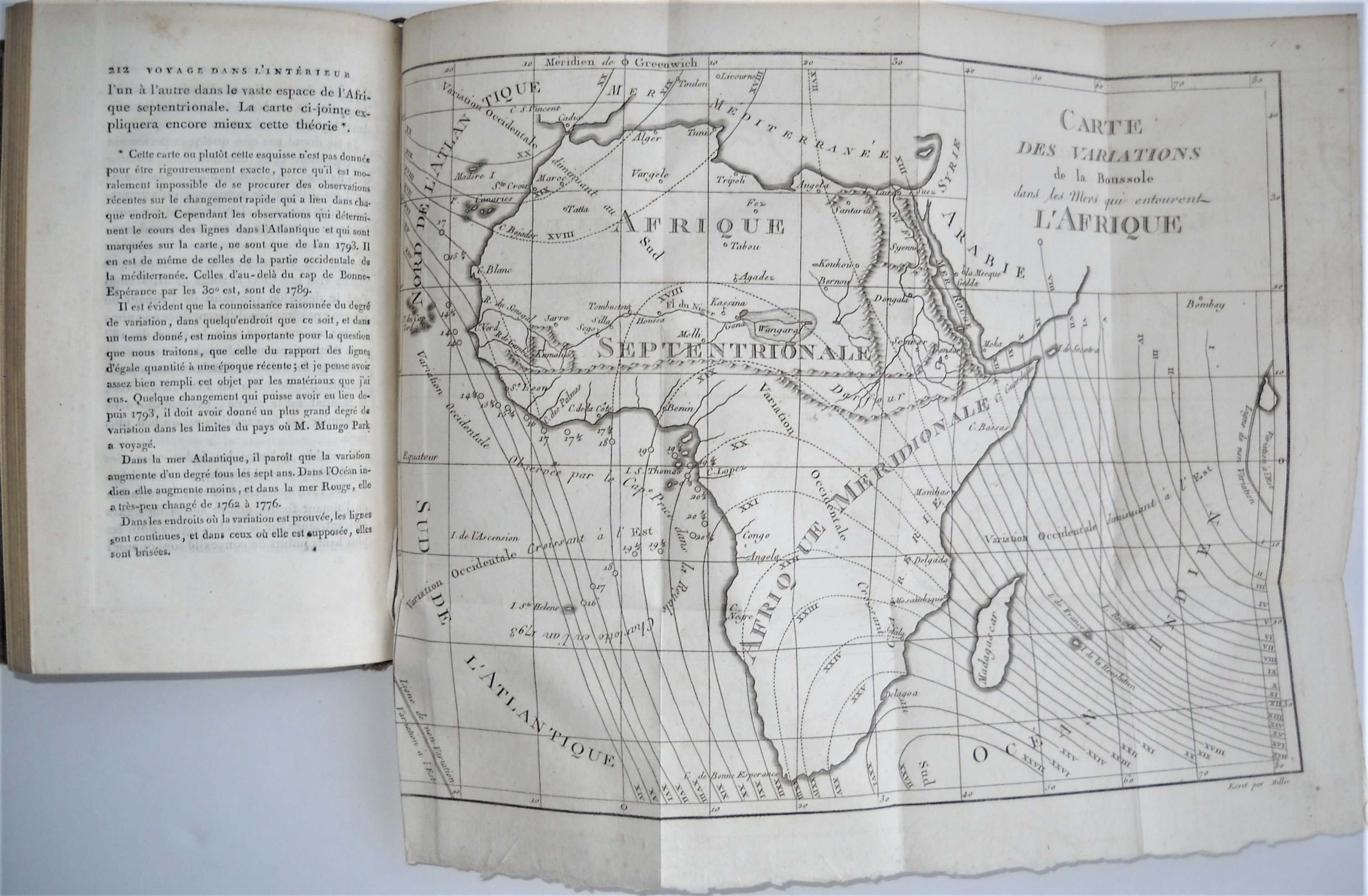 Tome I : frontispice, XII-411 pp. avec une carte dépliante (Route de Mungo Park de Pisania jusqu'à Silla) et 3 planches hors texte ;