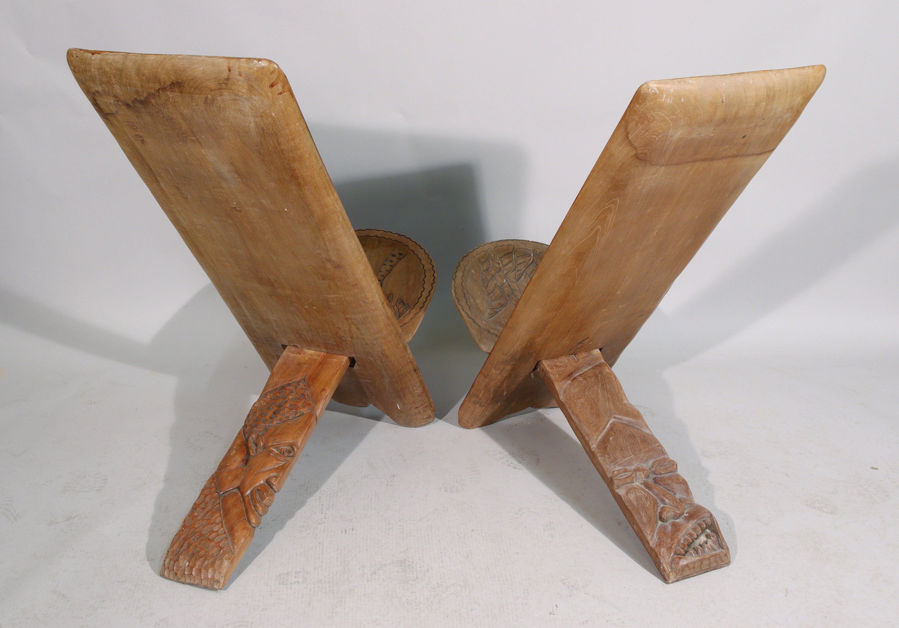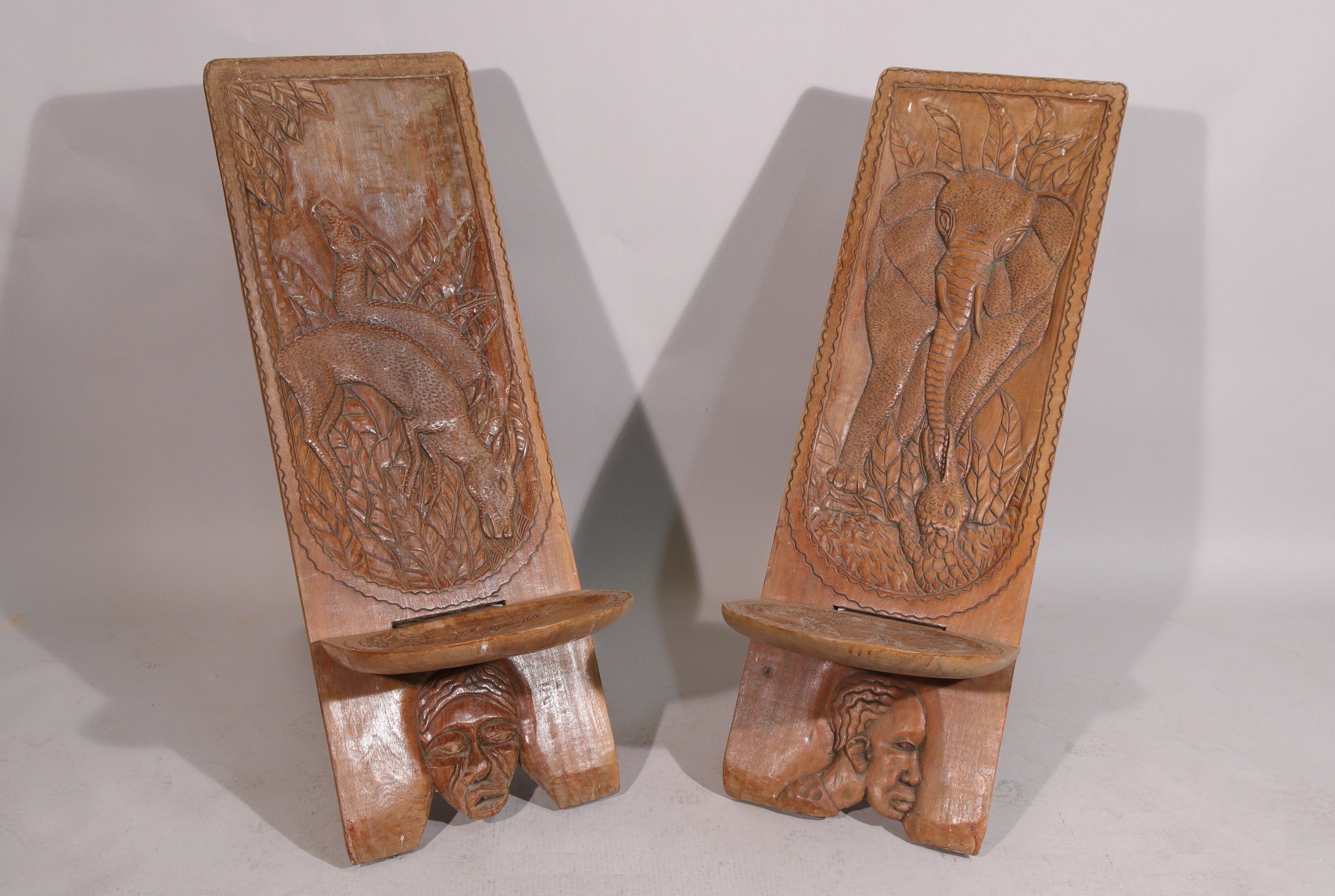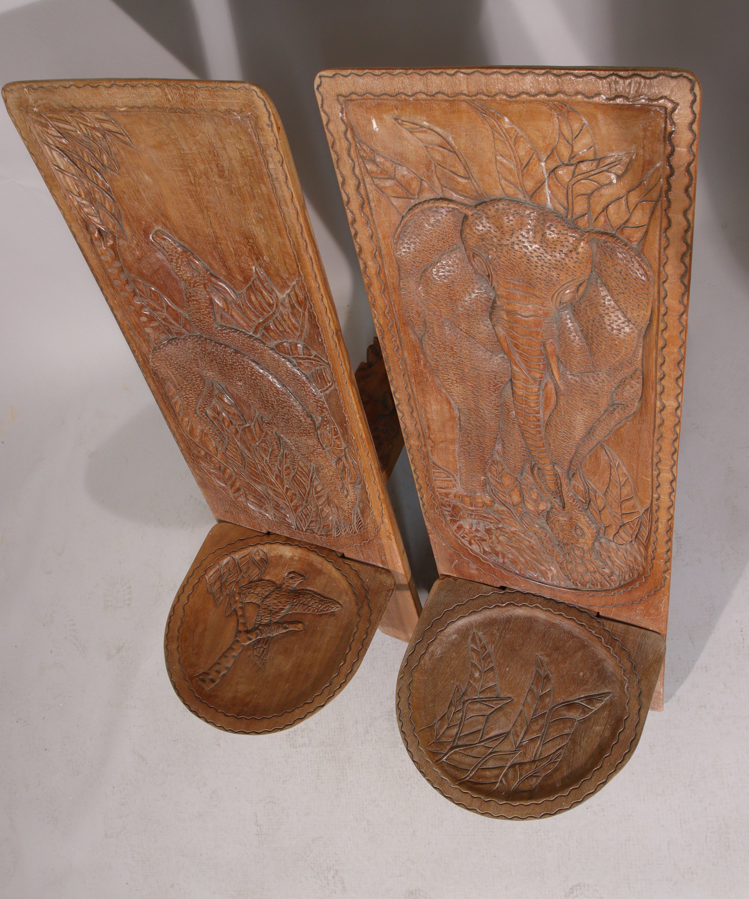 en bois assemblé, gravée pour l'une d'un décor d'antilopes et d'oiseau, et l'autre figurant un crocodile attaquant un éléphant.