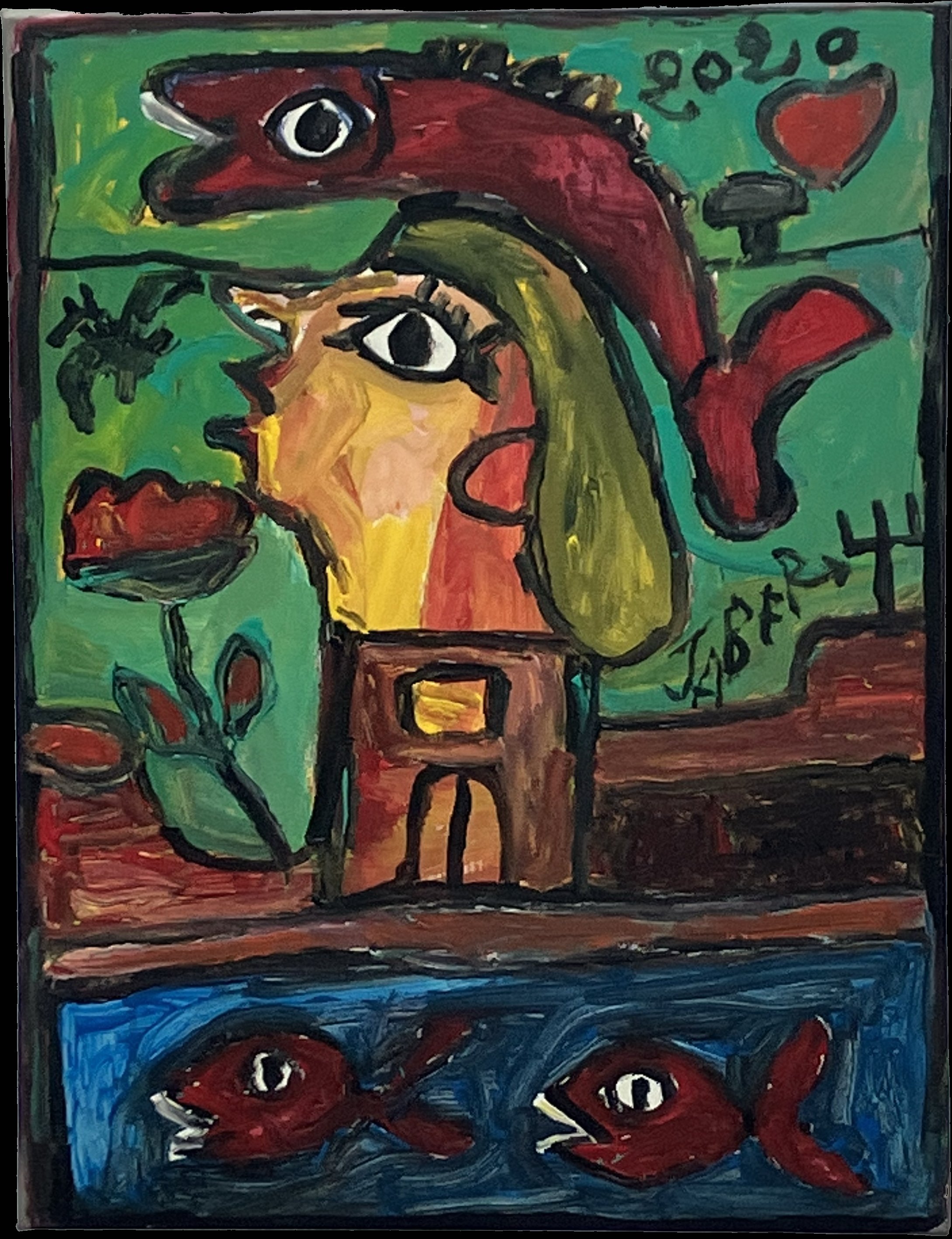 Jaber (Tunisien, 1938-2021), Jaber El Mahjoub, ditFemme aux poissons, 2020	Acrylique...