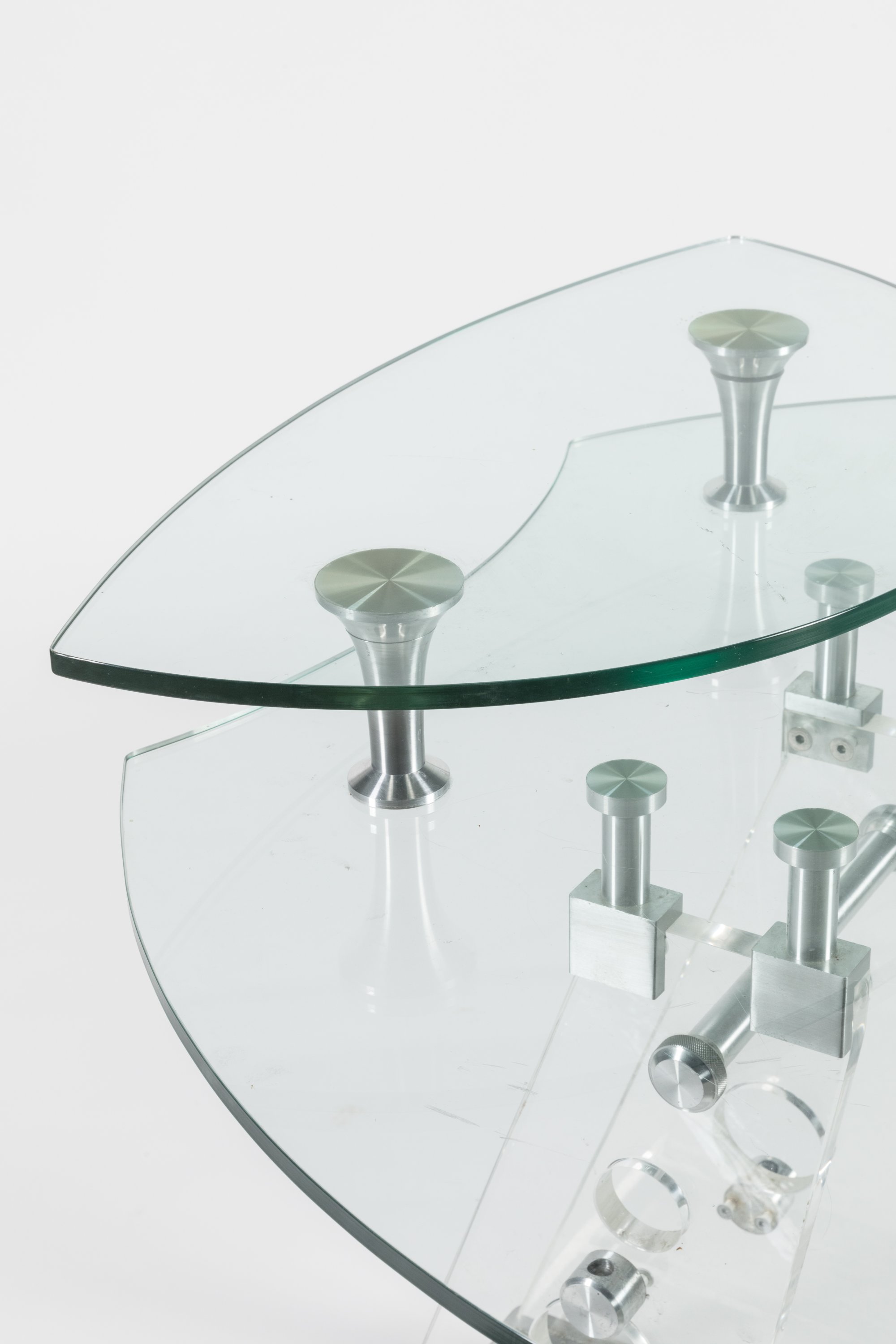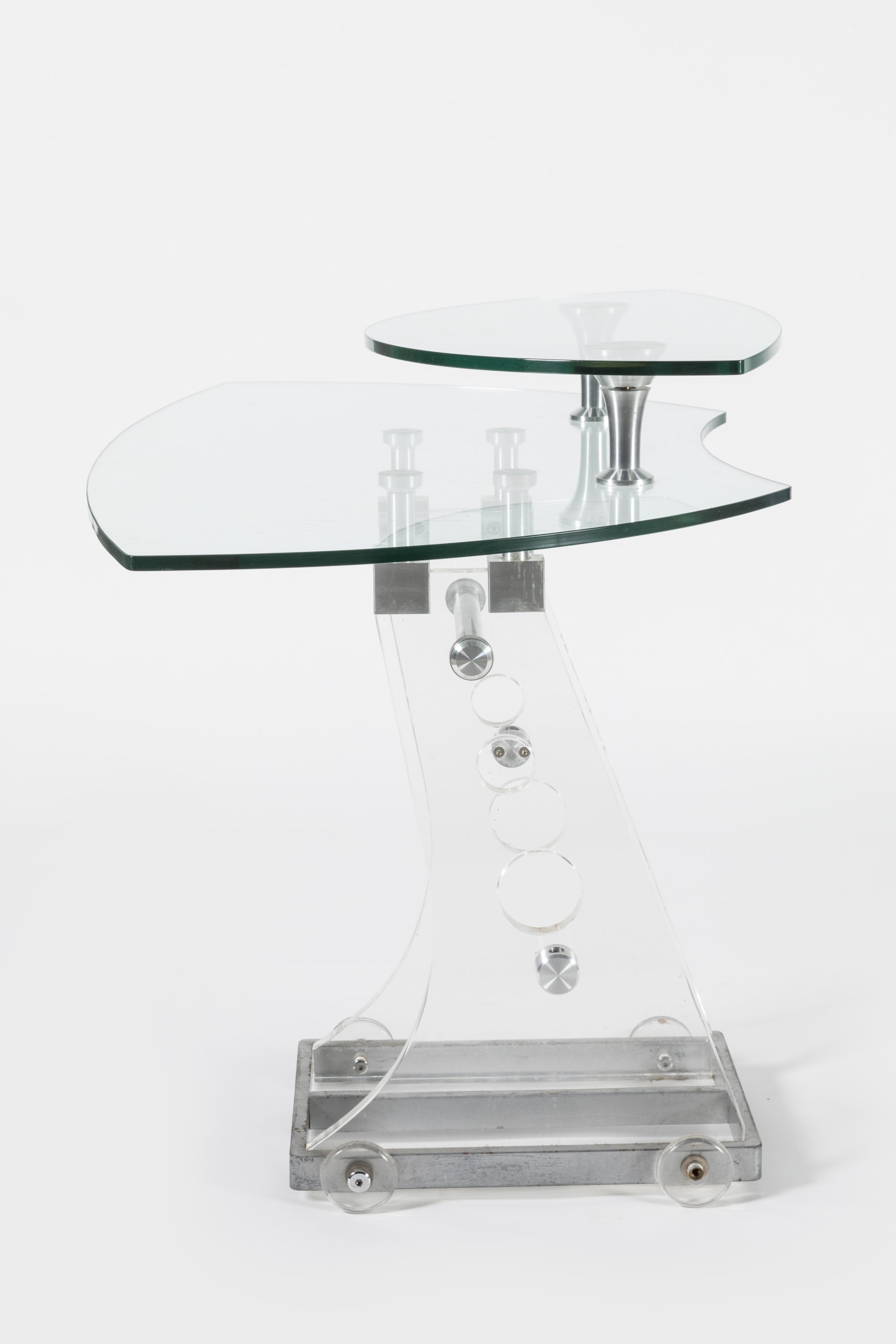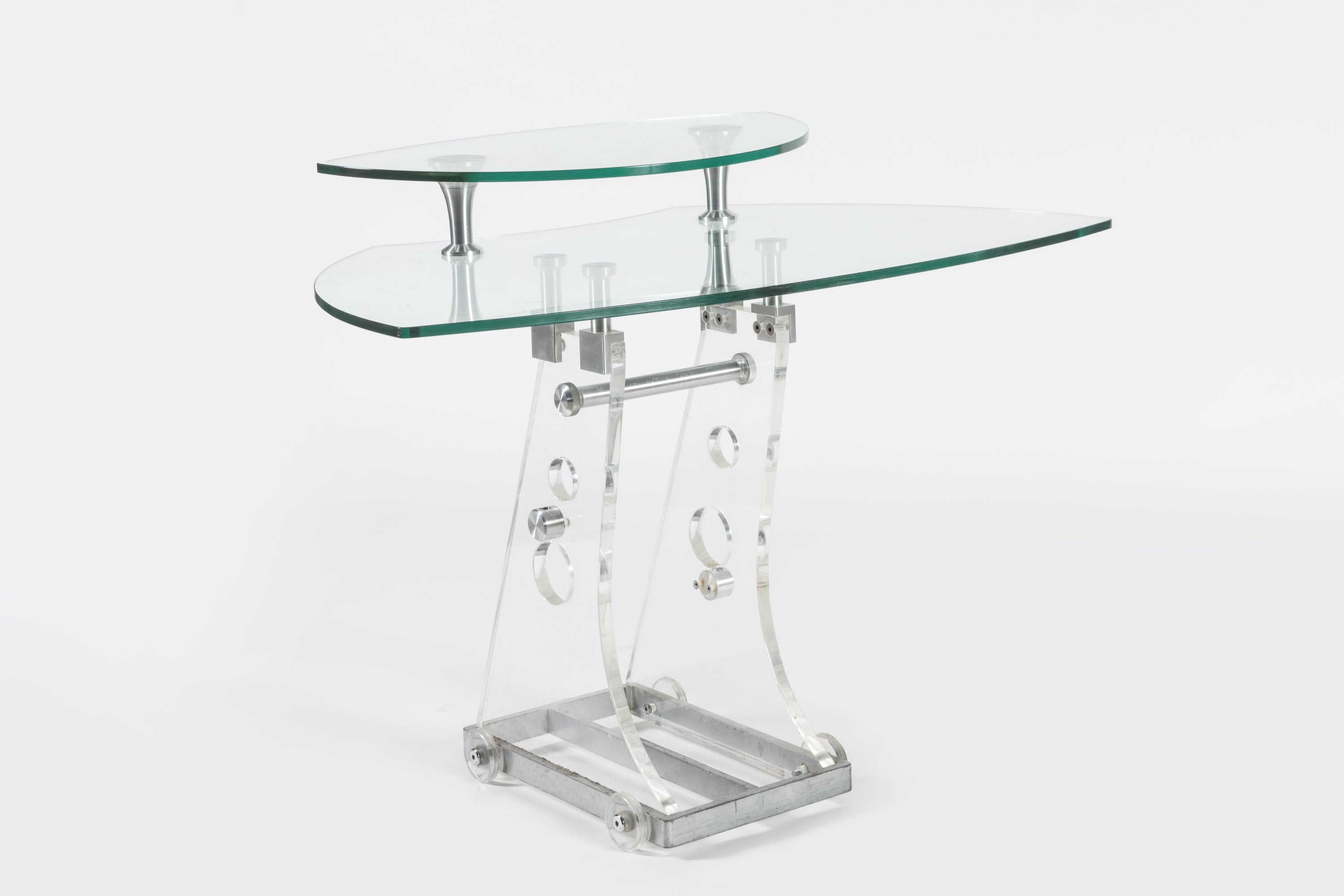 à double plateau en verre de forme libre. Le piétement en plexiglass reposant...