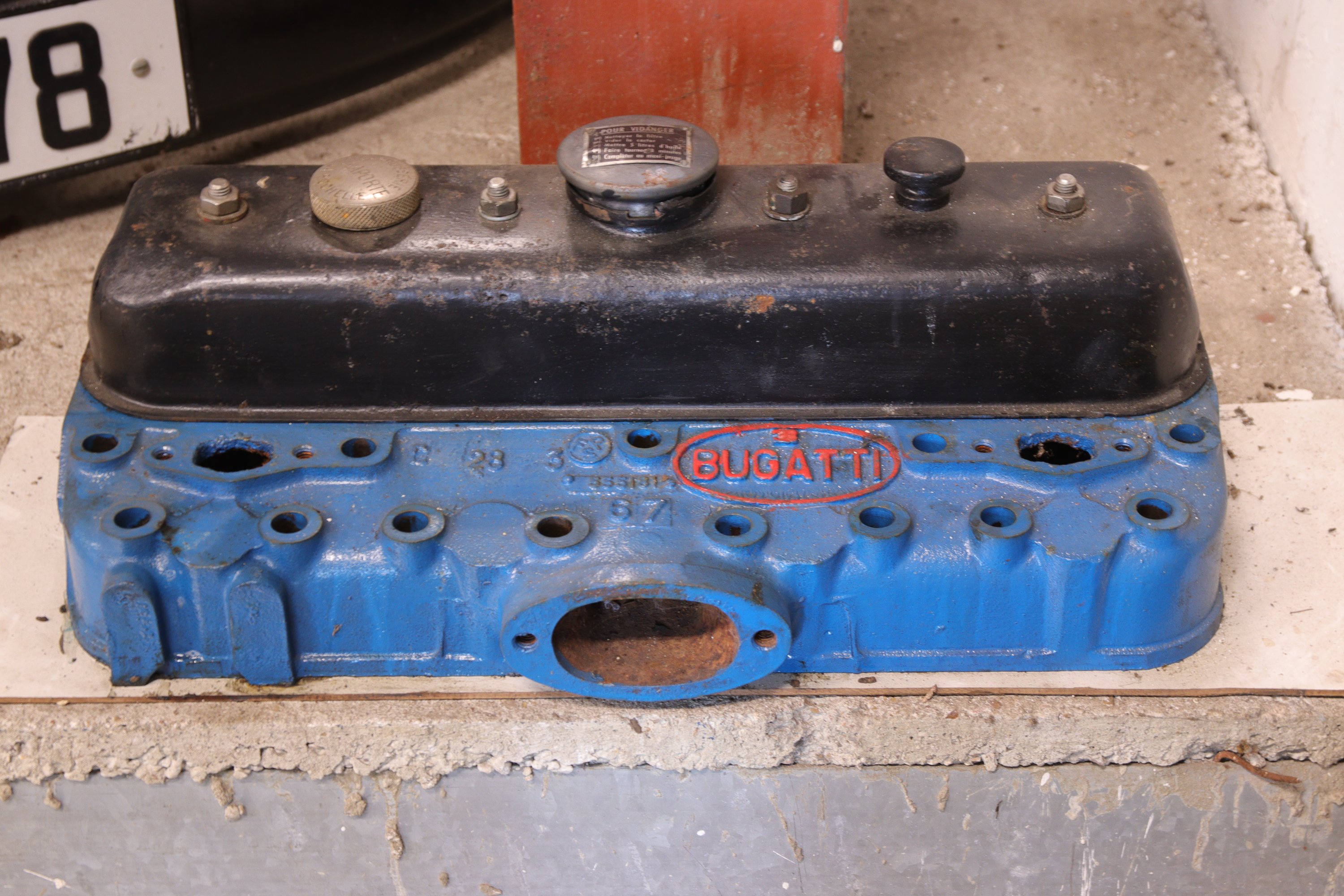 Cache culbuteur peint et embossé « Bugatti », bouchon gravé « Carrosserie E. Laporte, La Rochelle ».