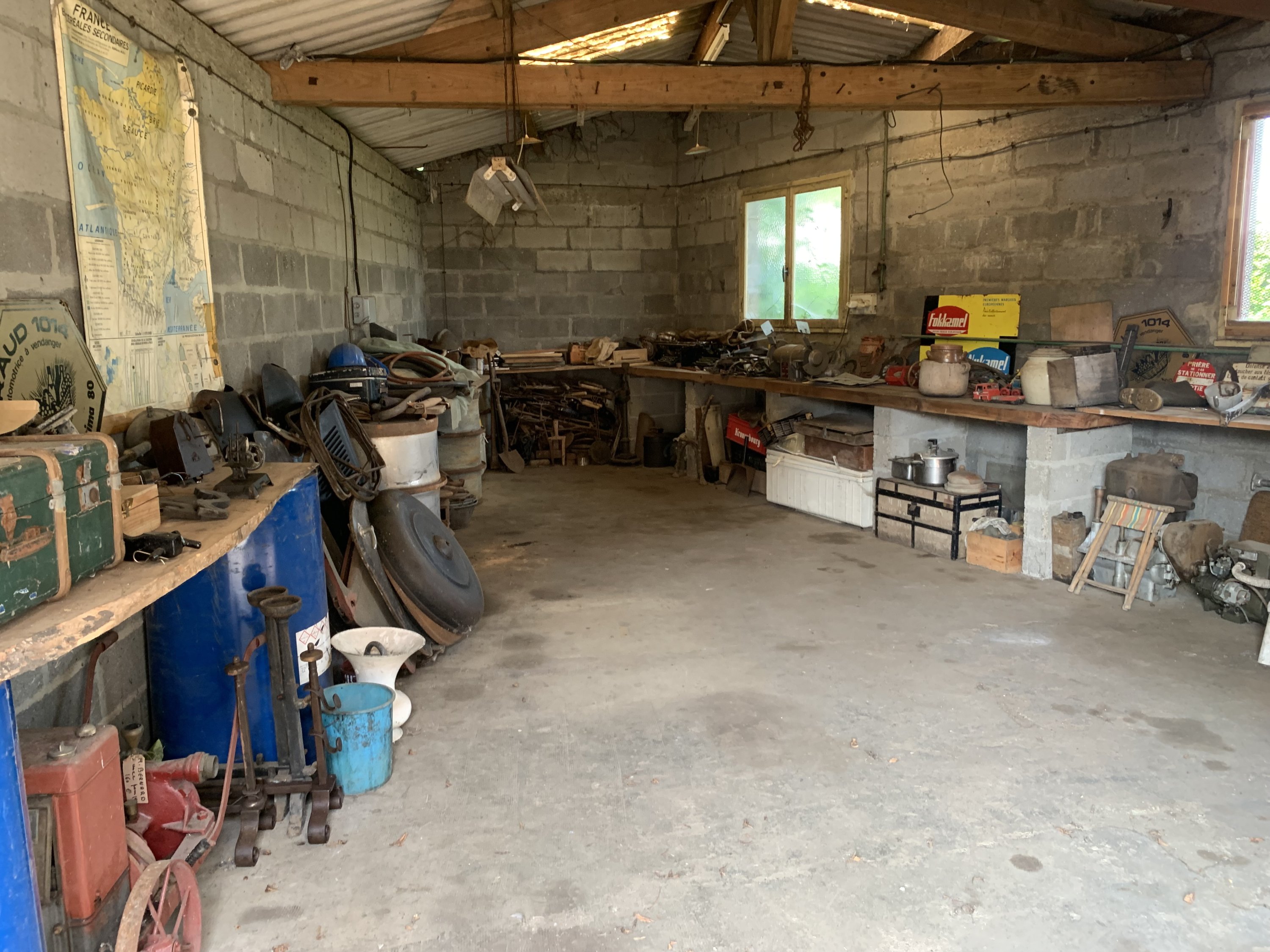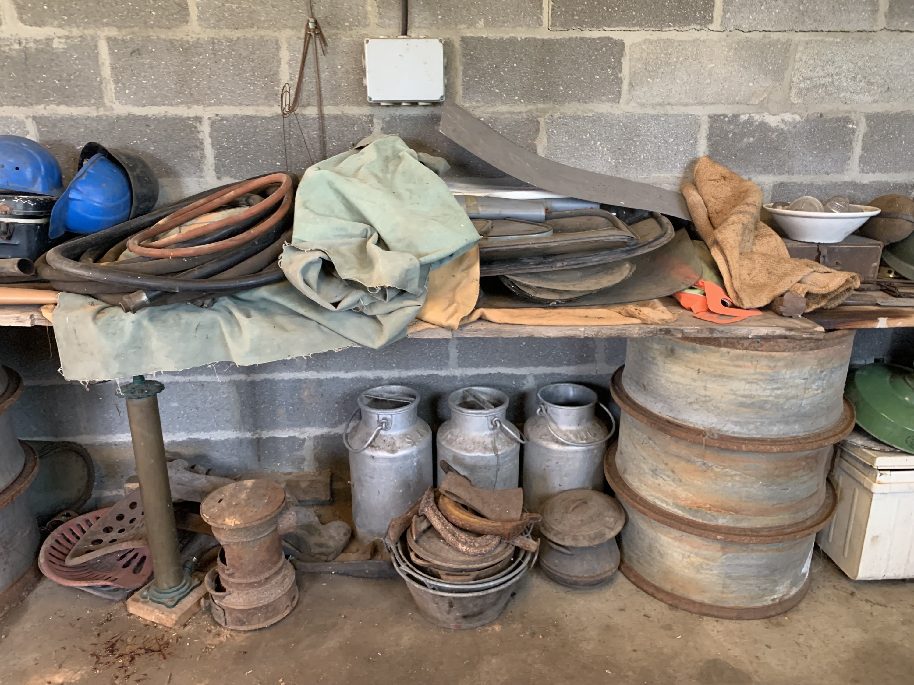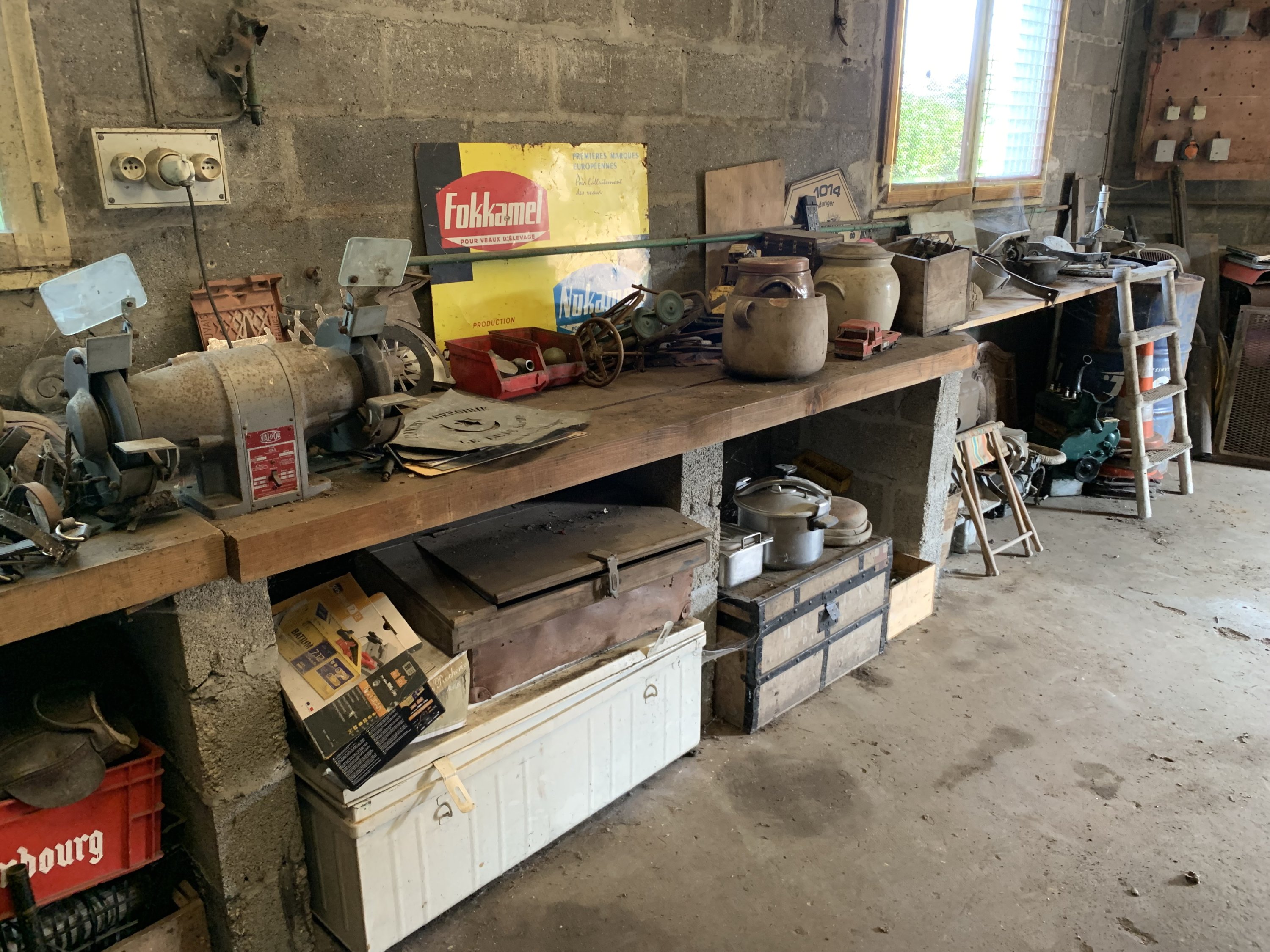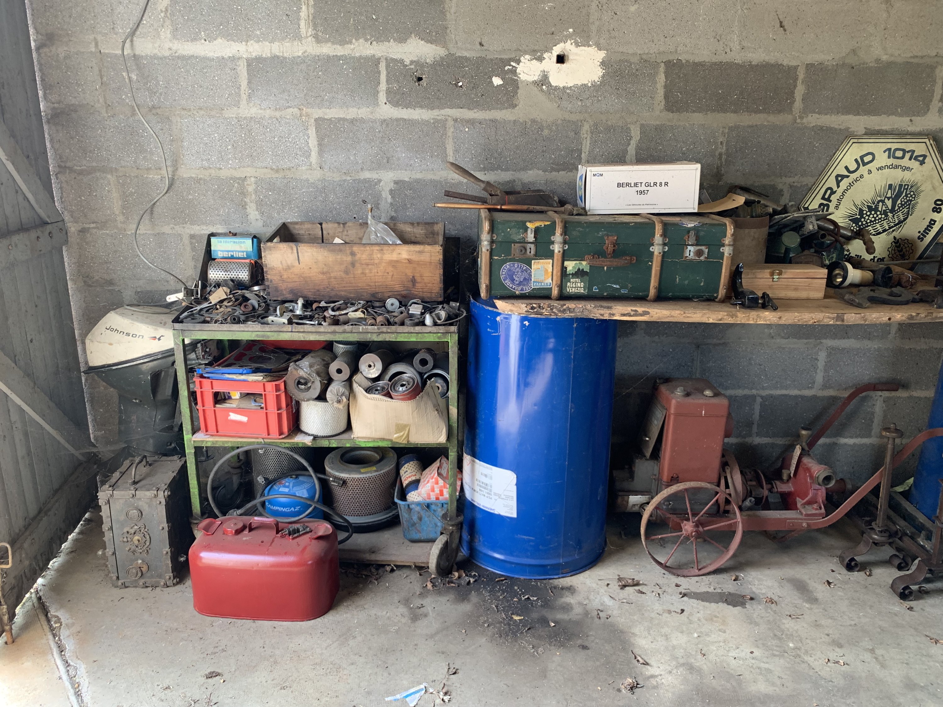 En un seul lot : important stock d'objets diverses et pièces automobiles, dont moteur hors-bord, souvenirs militaires, jouets anciens, machines à écrire, éléments de carrosserie, etc.