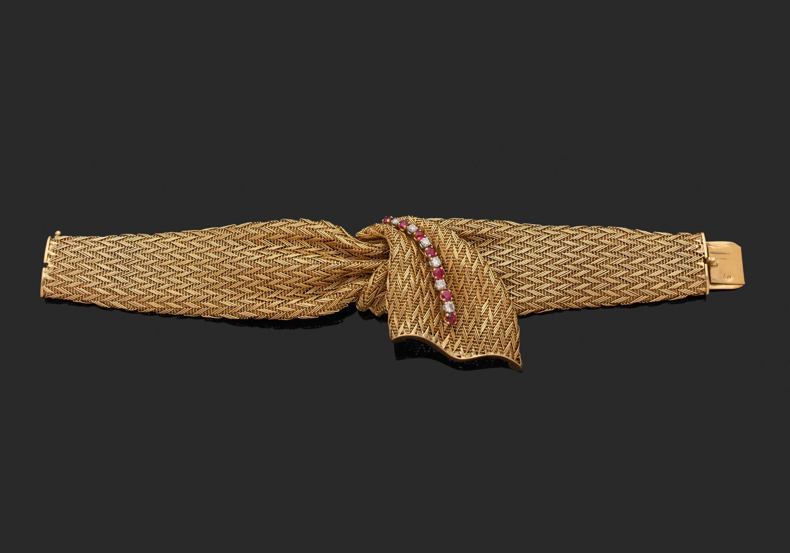 en or jaune 750 millièmes tressé, le centre orné d'un motif draperie serti d'une ligne de sept rubis env. 0.80/1.05 ct. et six diamants ronds alternés env. 0.60 ct.