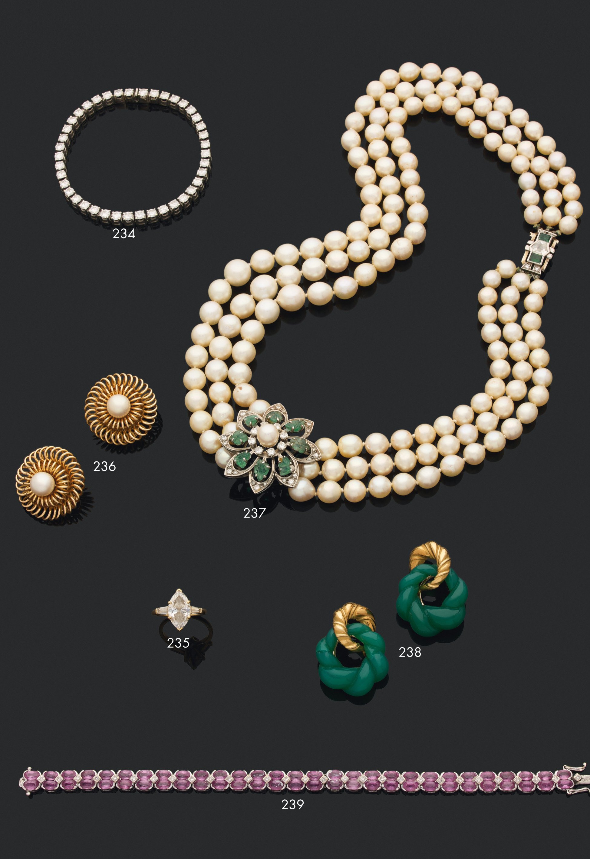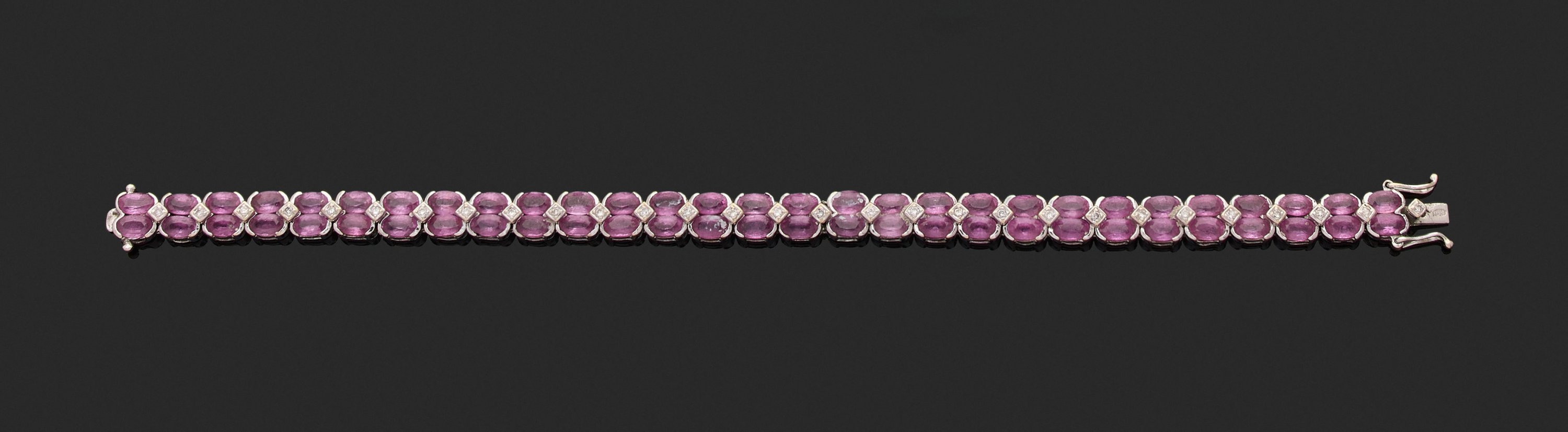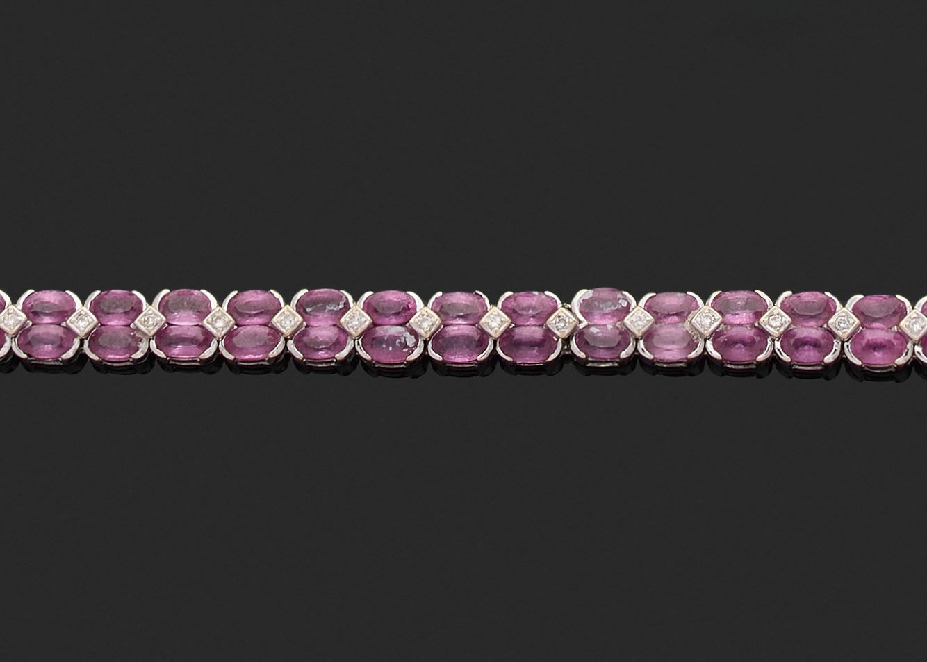 en or gris 750 millièmes composé de deux lignes de rubis roses de forme ovale alternés de petits diamants.