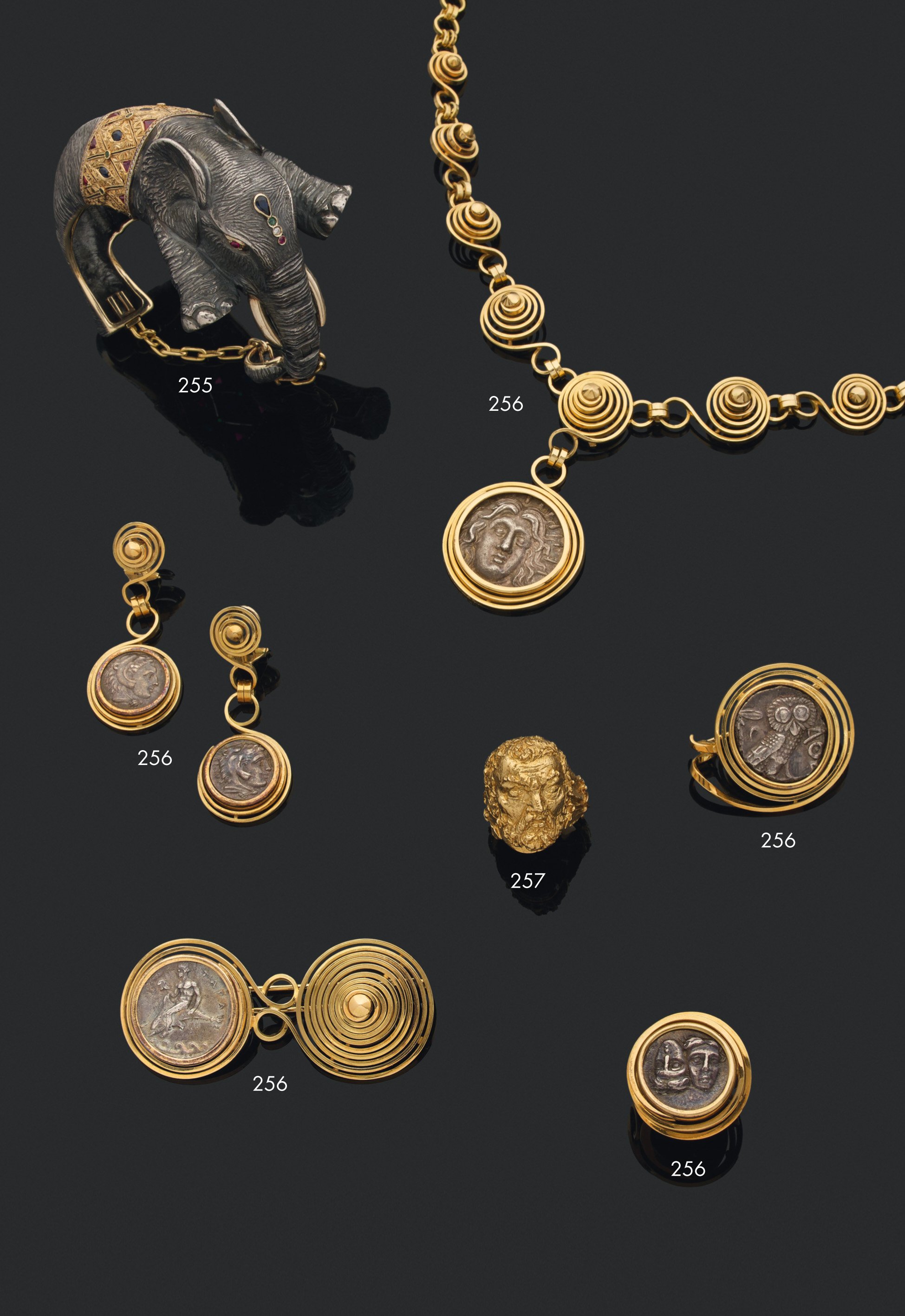 Ensemble à décor de spirales et orné de pièces gravées de style antique
