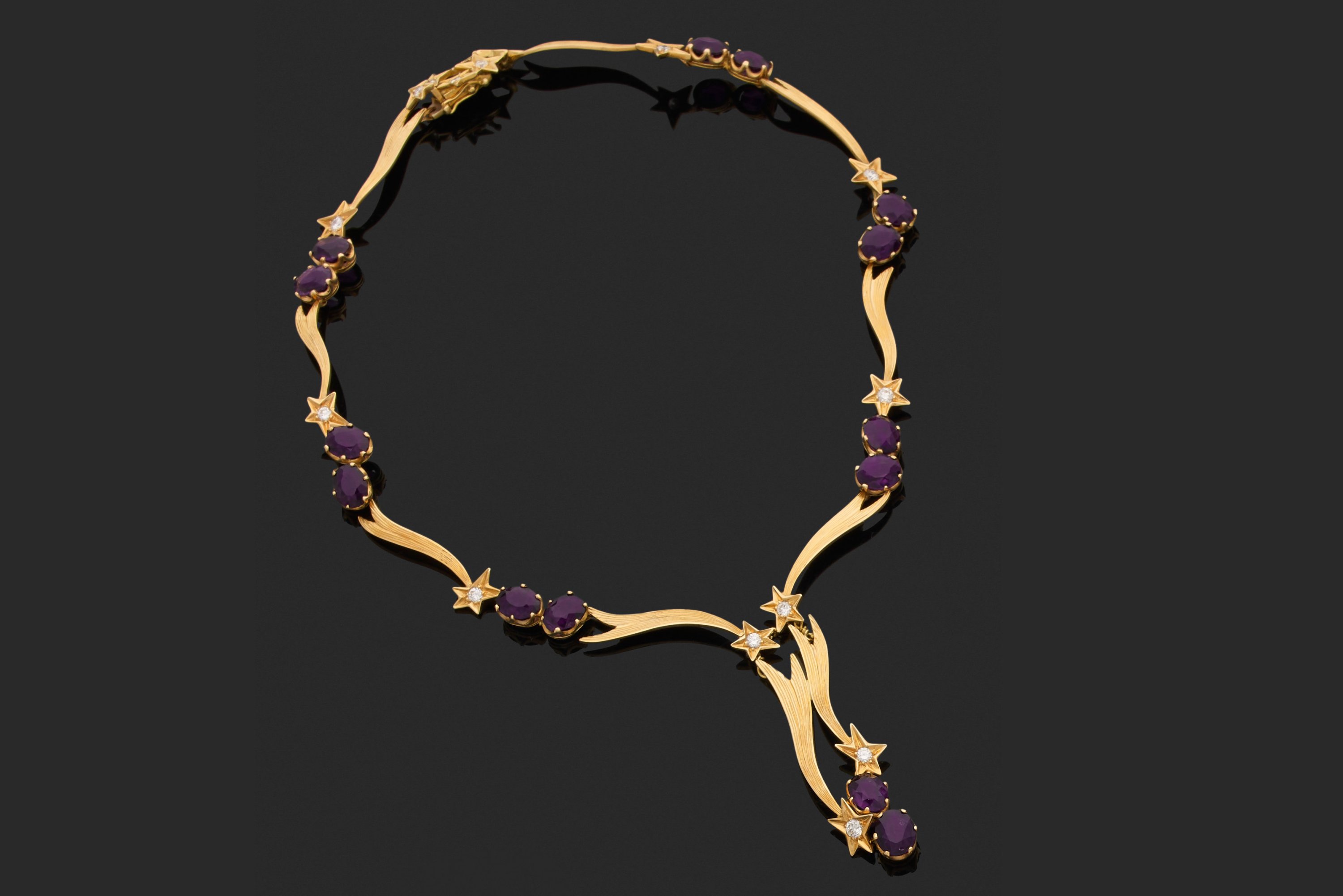 en or jaune 750 millièmes, les maillons figurant des étoiles filantes, chacune ornée d'un diamant rond de taille brillant alternés d'améthystes.