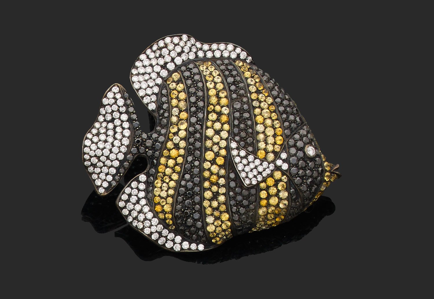 en argent 925 millièmes et or 750 millièmes noirci figurant un poisson entièrement pavé de saphirs jaunes et diamants ronds de taille brillant certains de couleur fantaisie noire.