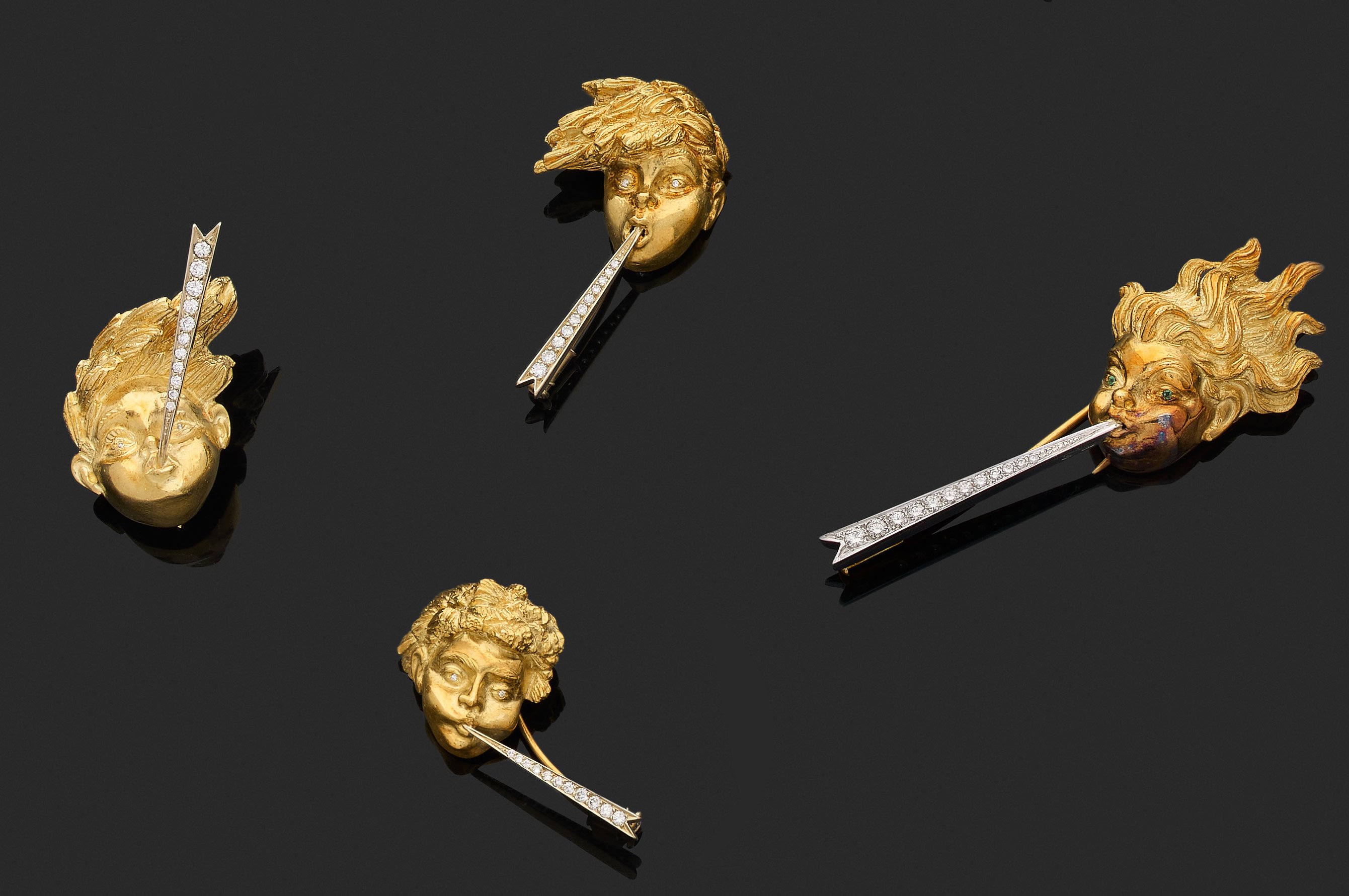 en or jaune 750 millièmes, chacune figurant une tête de putto jouant d'un instrument de musique orné de diamants ronds de taille brillant.