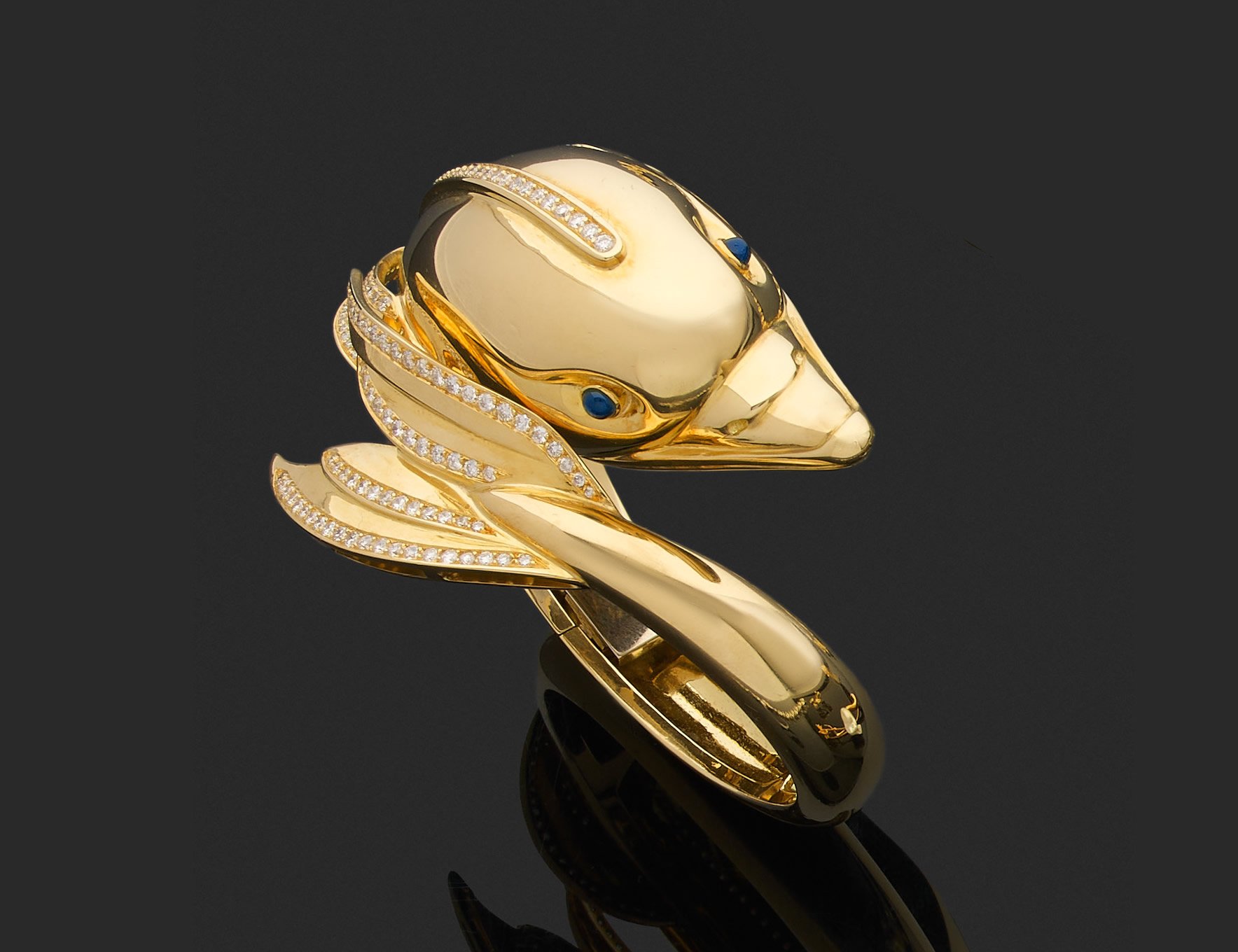 en or jaune 750 millièmes figurant un dauphin enroulé, la tête et les nageoires ornées de diamants ronds de taille brillant.
