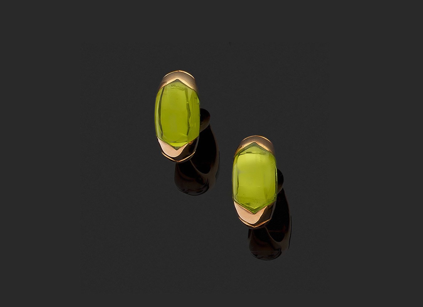 en or jaune 750 millièmes, chacune de forme bombée ornée au centre d'un péridot. Système à pince.