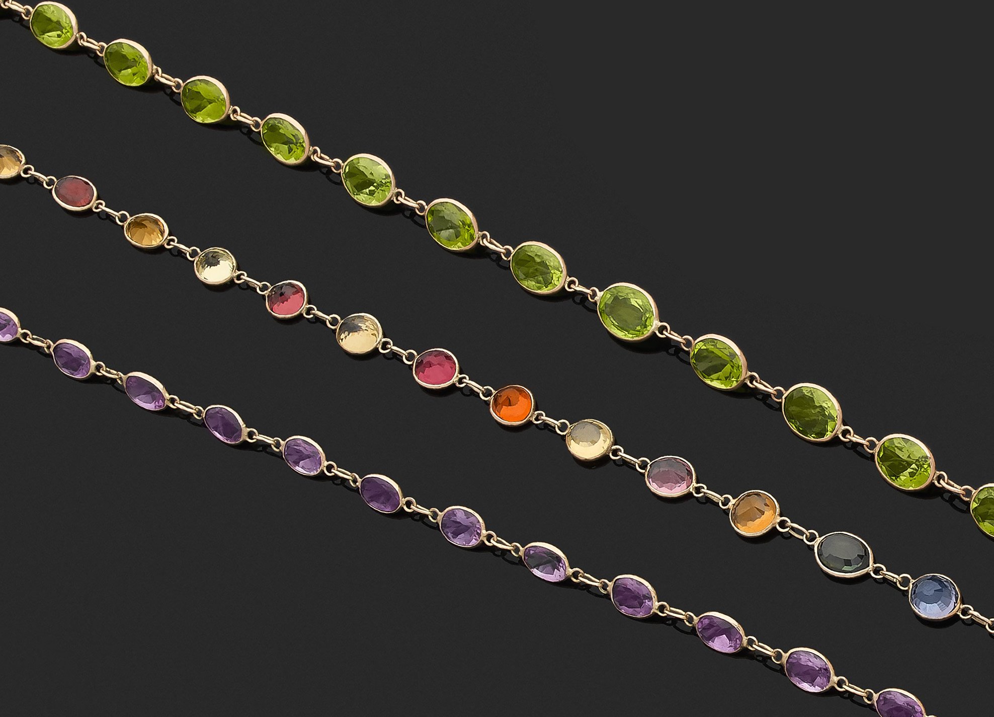 en or 375 millièmes chacun orné de pierres fines diverses (améthystes, péridots, aigues marines, tourmalines...).