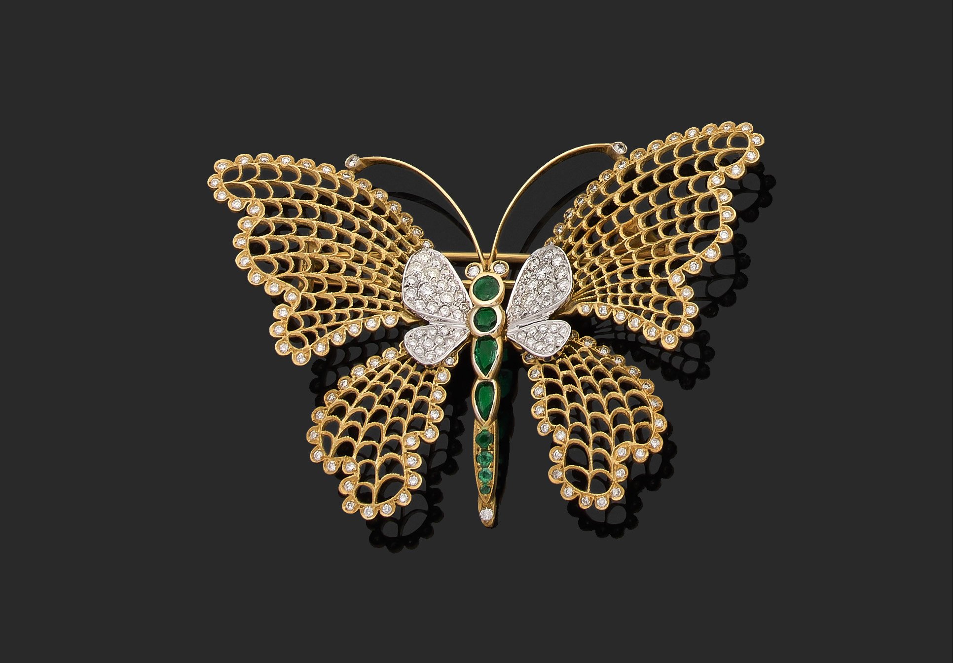 en or jaune 750 millièmes ajouré figurant un papillon, le corps orné d'émeraudes, les ailes partiellement serties de diamants ronds de taille brillant.