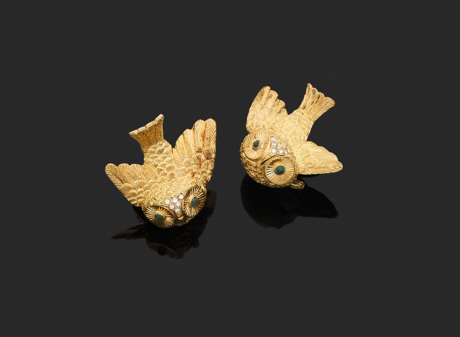 en or jaune 750 millièmes, chacune gravée figurant une chouette, le bec orné de diamants ronds de taille brillant, les yeux sertis d'émeraudes, système pour oreilles percées.