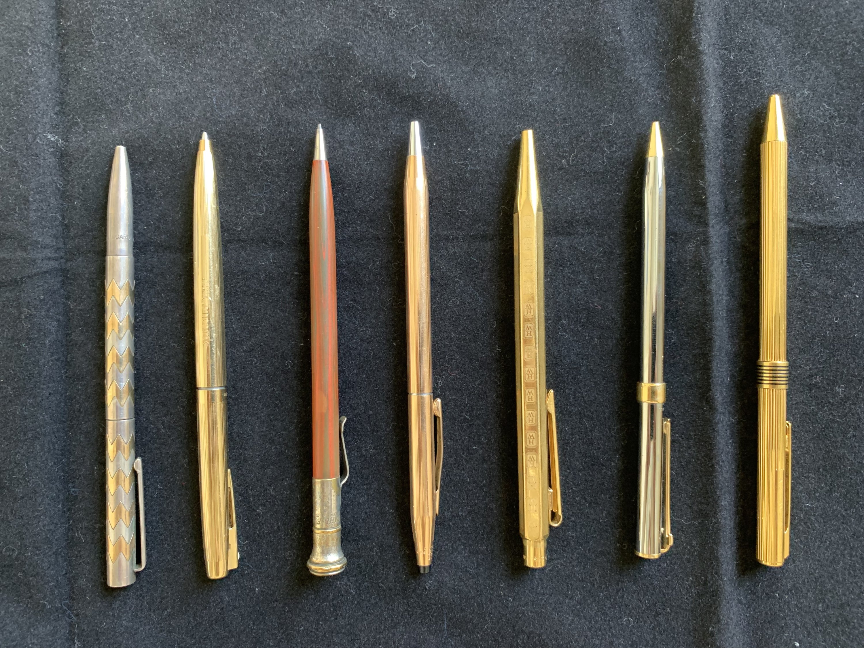 Ensemble de sept stylos en métal ou métal doré. (usures).