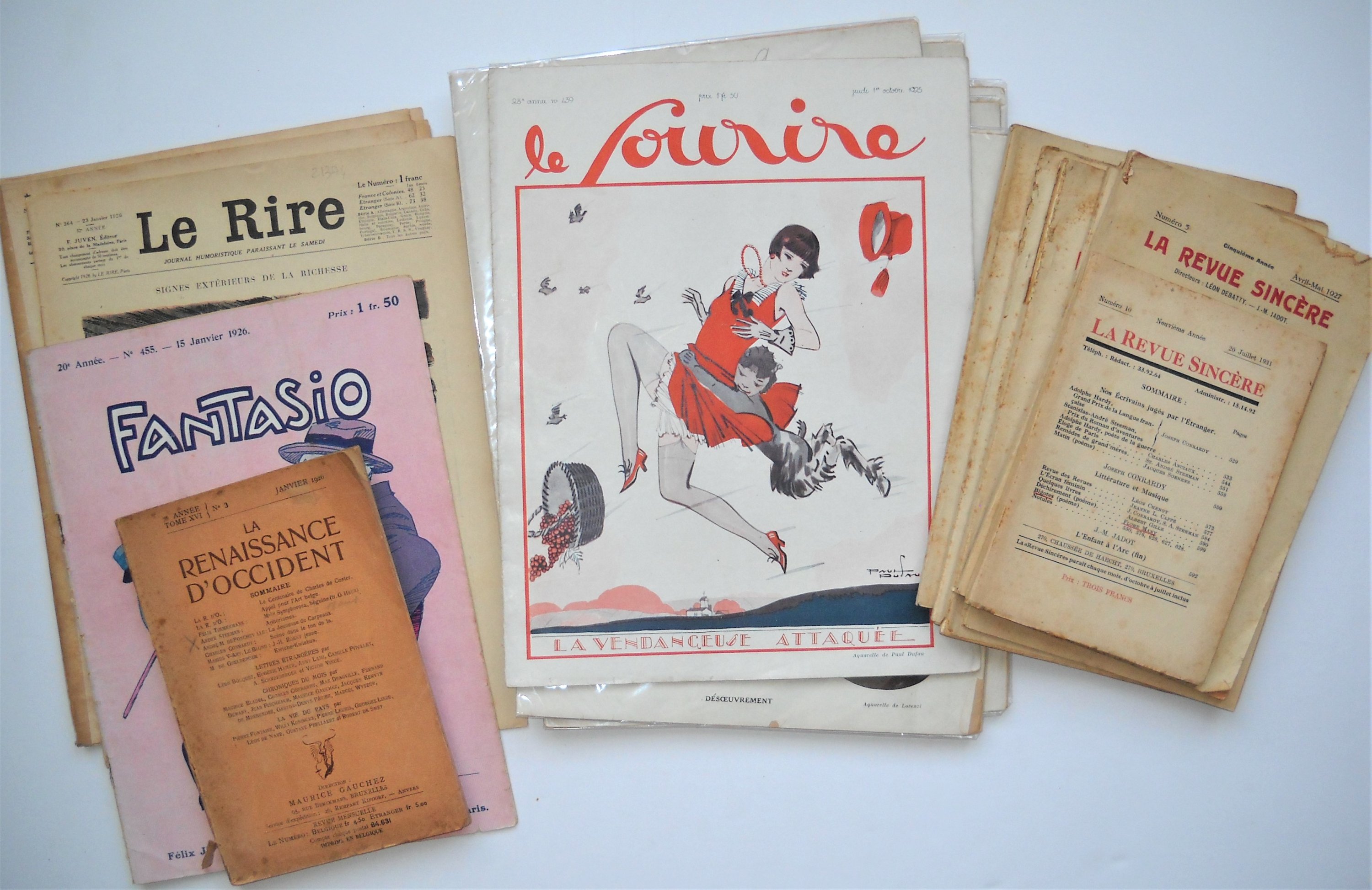 Revues : 7 ex. « Le Sourire » (1924-1925) ; 2 ex. « Le Rire » (1925-1926) ; 6 ex. « La Revue Sincère » (1926) ; « Fantasio » (1926) ; « La Renaissance dOccident » (1926) ; 4 ex. « La Gazette littéraire » (1933) ;
