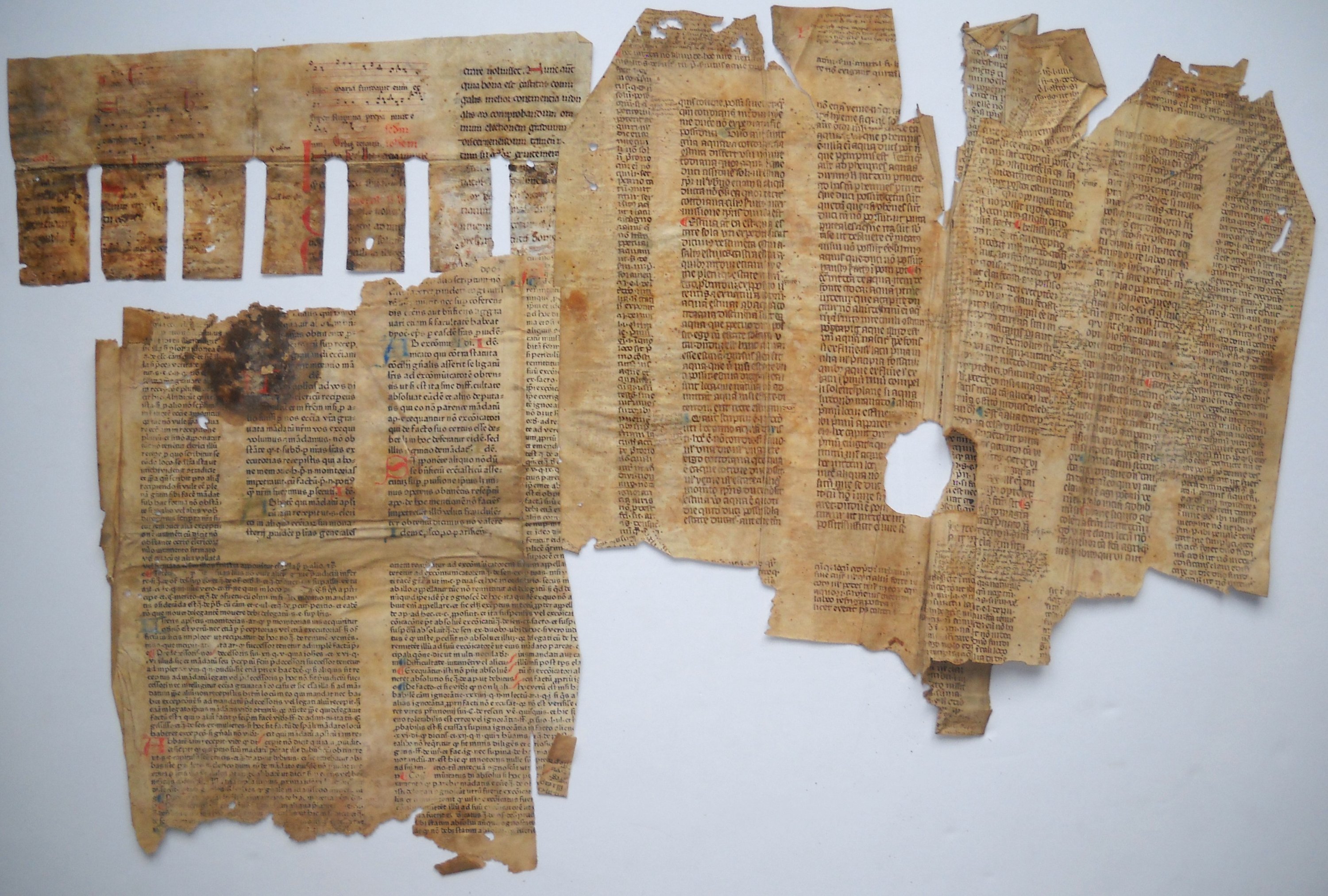 Réunion d’extraits et de fragments de pages manuscrites sur parchemin, de bréviaire, psautier ou missel, en l’état, et 2 actes notariés sur parchemins des 13e et 14e siècles.