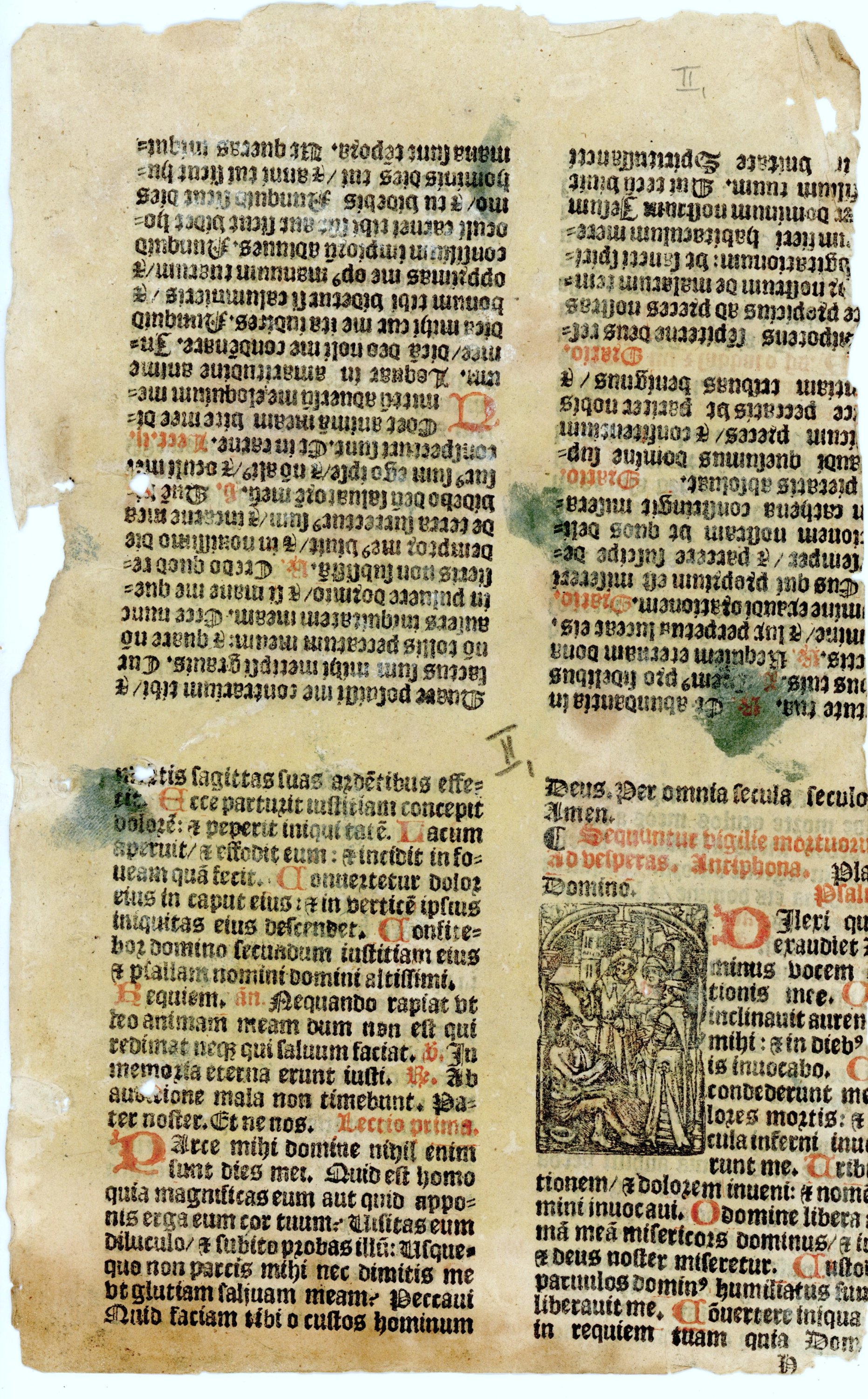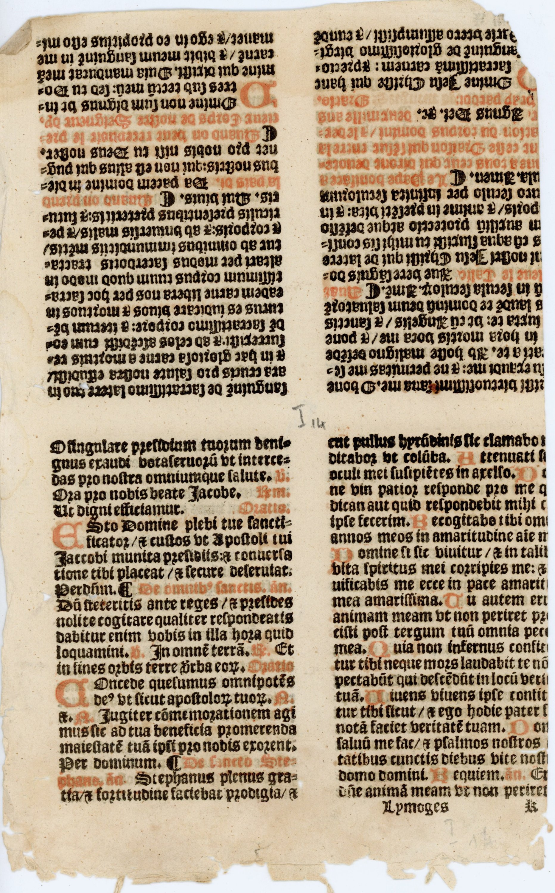 Réunion dextraits et de fragments de pages de bréviaire, psautier ou missel imprimés de la fin du 15e jusquau 17e siècle, dont 10 pages in-8 provenant dun bréviaire possiblement imprimé à Limoges à la fin du 15e ou au début du 16e siècle. En létat.