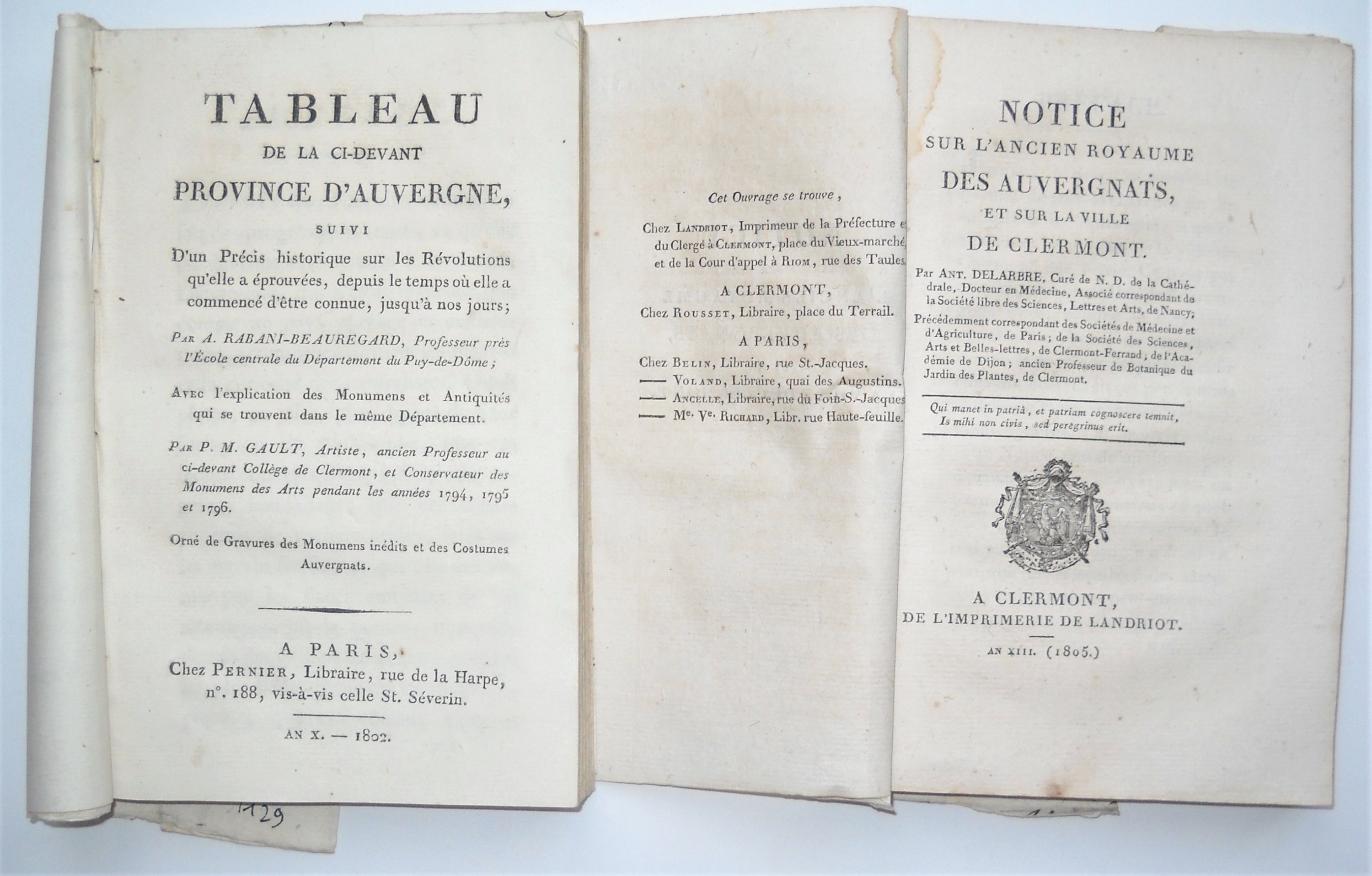 A. Rabani-Beauregard et P.M. Gault, Tableau de la ci-devant province d’Auvergne suivi d’un précis historique sur les Révolutions… orné de gravures des monuments inédits et des costumes auvergnats. Paris, Pernier, an X-1802. Broch. in-8 192 pp. ill. de 15 pl. gravées h.t. ;