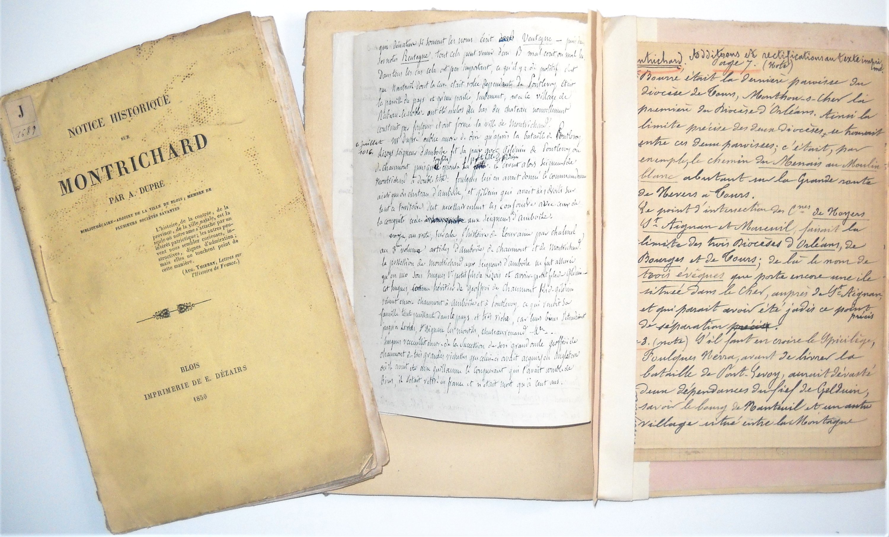 • Alexandre Dupré, Notice historique sur Montrichard, Blois, Dézairs, 1850, br. in-8, 32 pp. ; Notice historique sur Montrichard, Blois, Dézairs, 1850, br. in-8, 32 pp., corrigée et annotée par l’auteur et par Henri de la Vallière contenant des ajouts et notes manuscrites, exemplaire unique ;