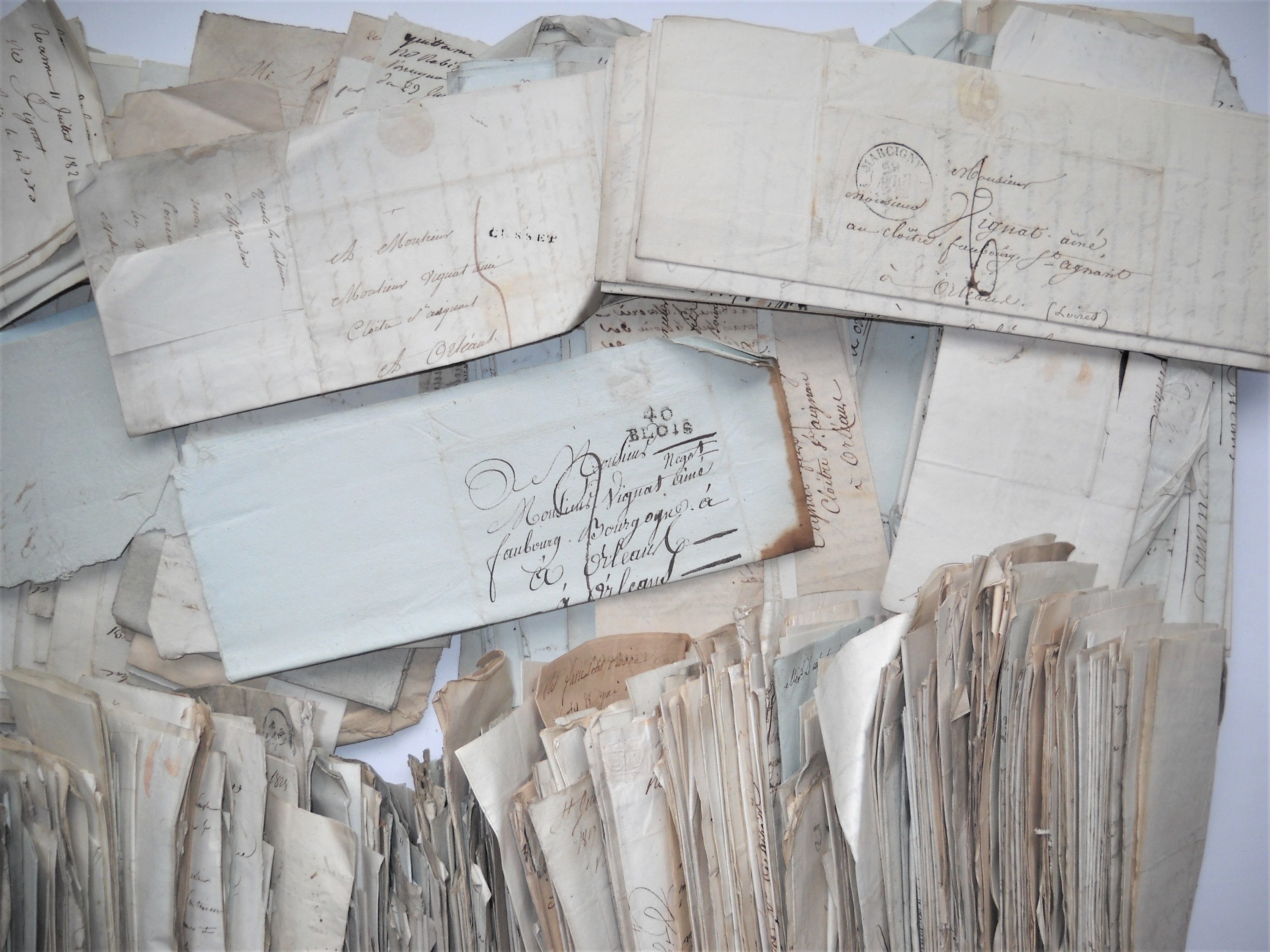 Importante réunion de + de 750 pièces manuscrites sur papier, formats divers, 1800-1832, concernant la famille Vignat, originaire de Roanne, dont les frères Vignat (Jean-François et Pierre-André à Orléans, Jean-Marie à Roanne) avaient fondé une entreprise de diligences privées, « Les Pataches de Roanne à Paris par Blois et Orléans », dont le siège était installé à Orléans.