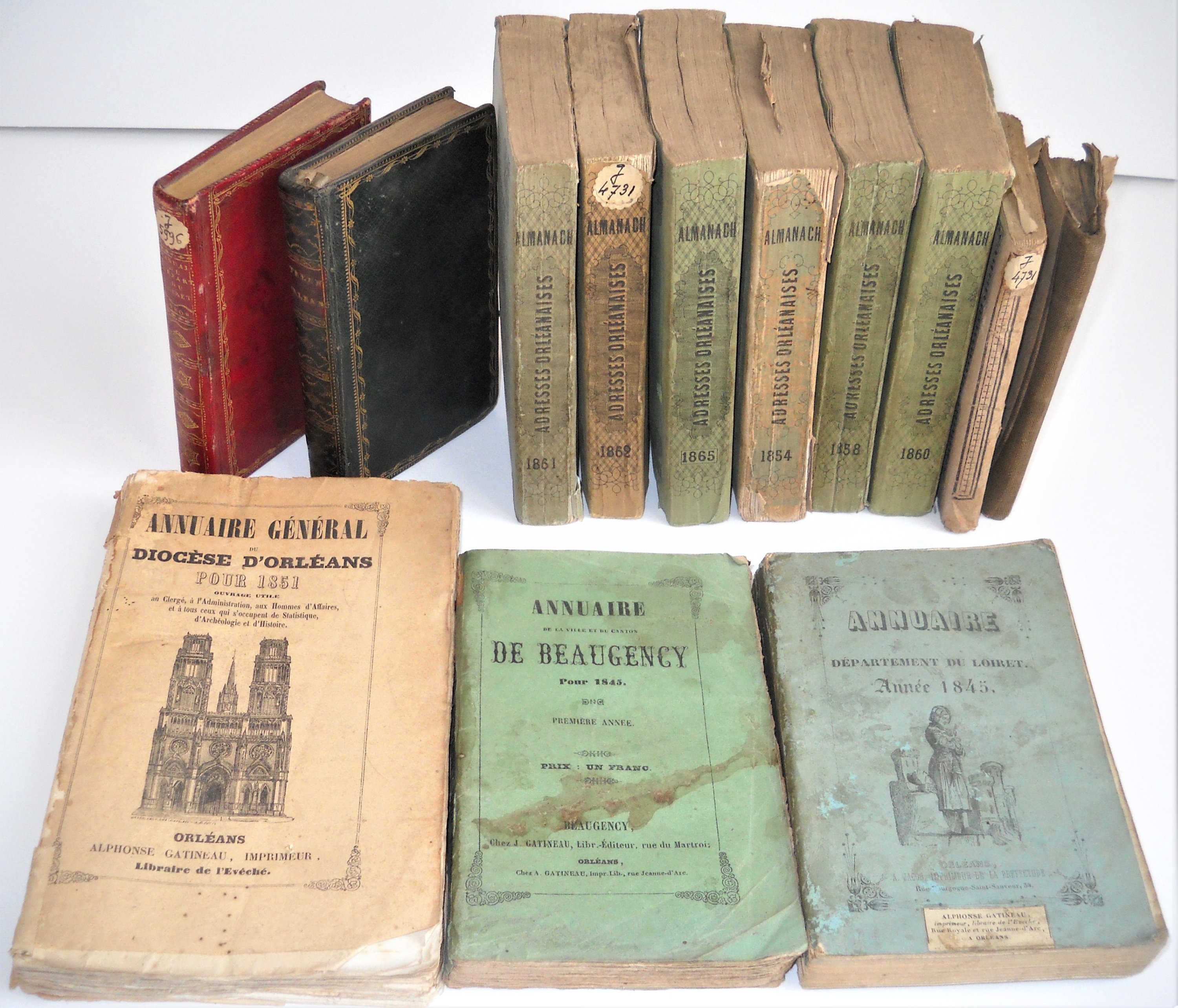 Réunion de 13 vol., annuaires et almanachs du Loiret, XVIIIe au XXe siècles, formats divers, dont :