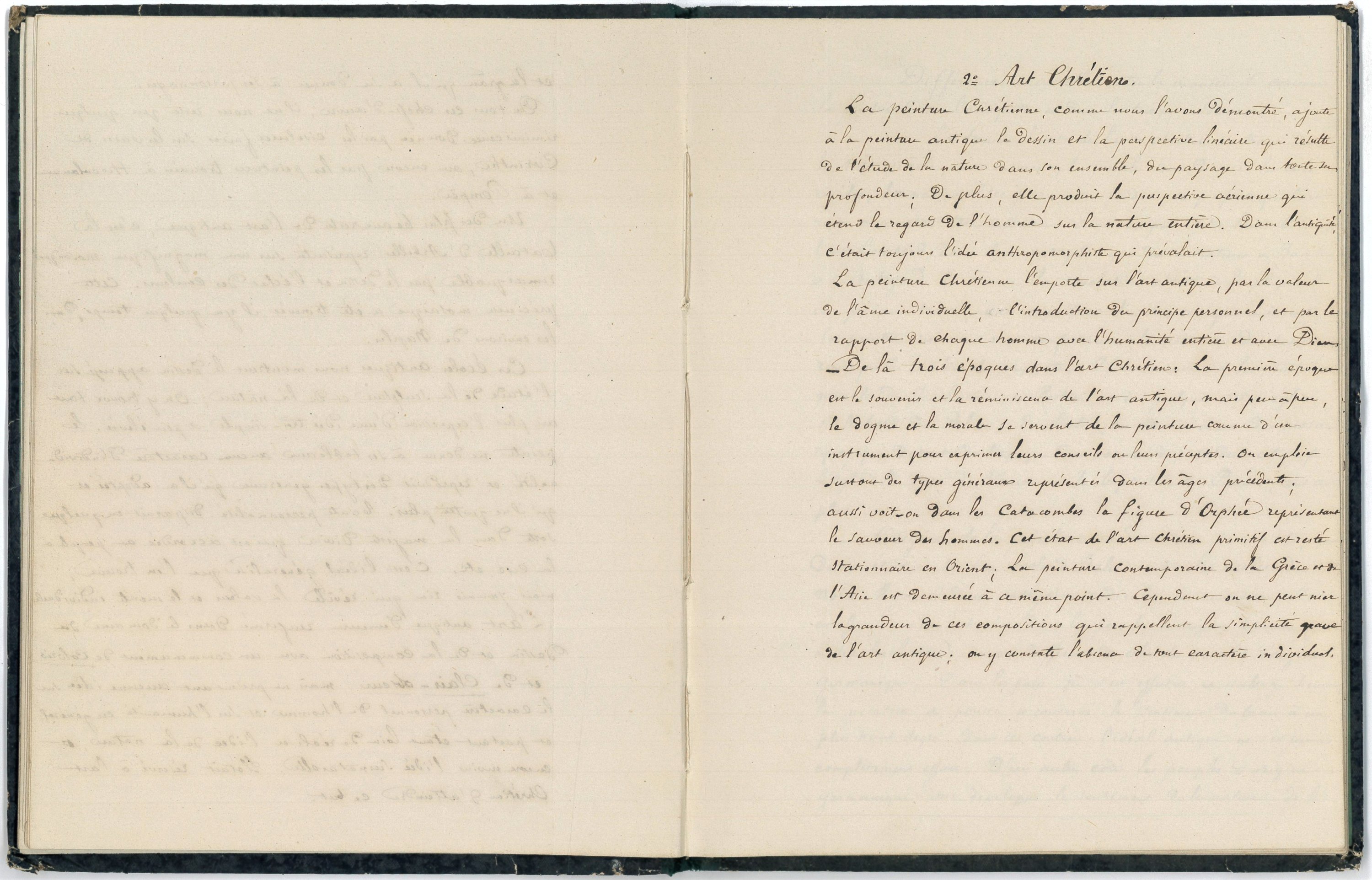 « La peinture », 42 pp. ; cahier manuscrit de cours dhistoire de lart dispensé au lycée dOrléans en 1864, probablement par Charles Pensée qui a durant cette même période aussi pour élève Paul Gauguin en 1864-1865 ;
