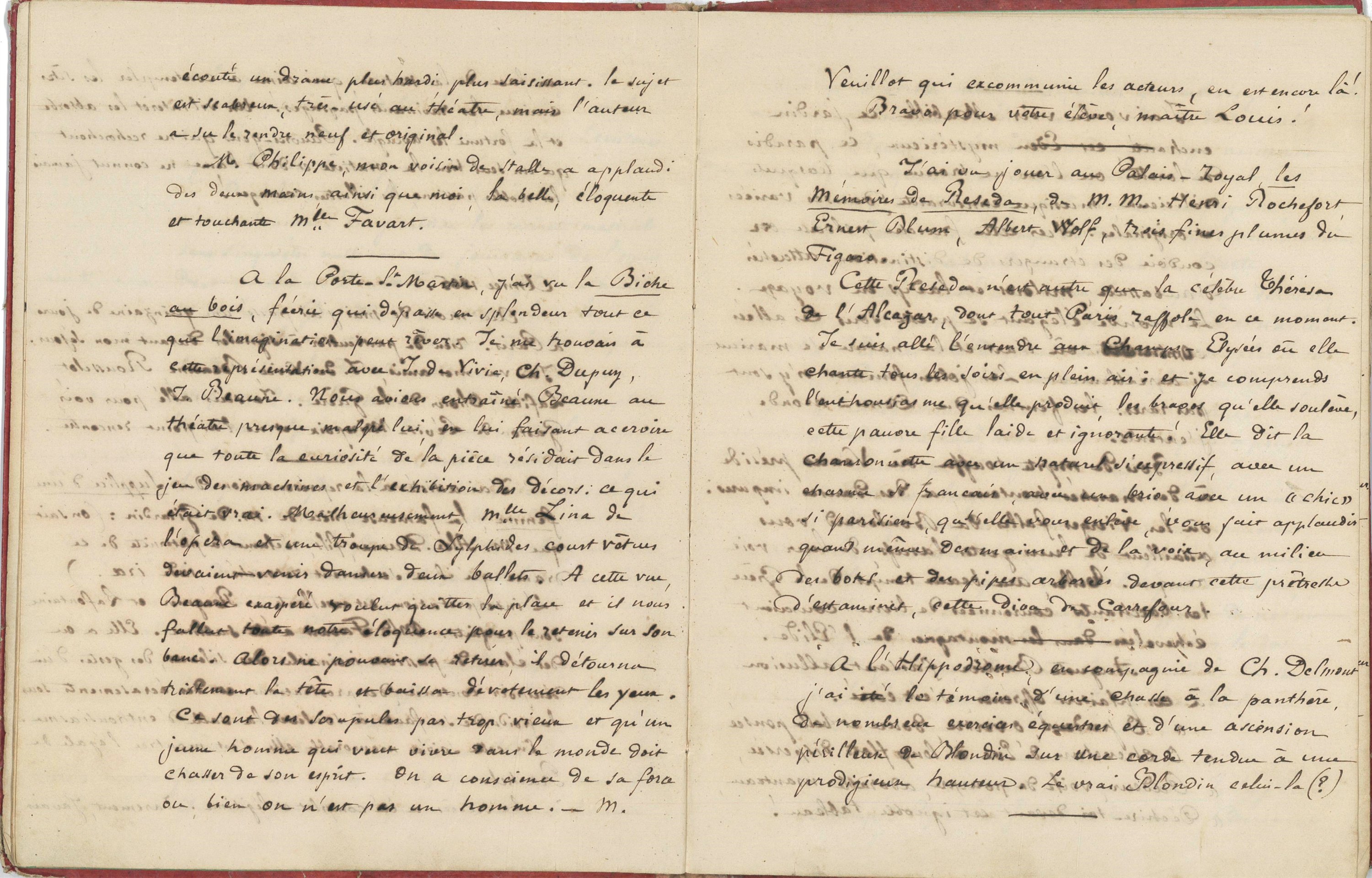 « Journal », 70 pp. ; notes manuscrites écrites à partir de 1865 par Osmin Massias, âgé de 21 ans, commençant par ces mots « Je tiens à relater ici mes impressions diverses, littéraires et personnelles. Ce cahier sera comme un journal où jinscrirai jour par jour sans ordre ni méthode tout ce que limagination maura dicté. Désormais habitant de Gontaud, je ne raconterai plus les plaisirs sans cesse renaissants de mon esprit ; la lecture et le souvenir fourniront seuls un aliment à ma pensée