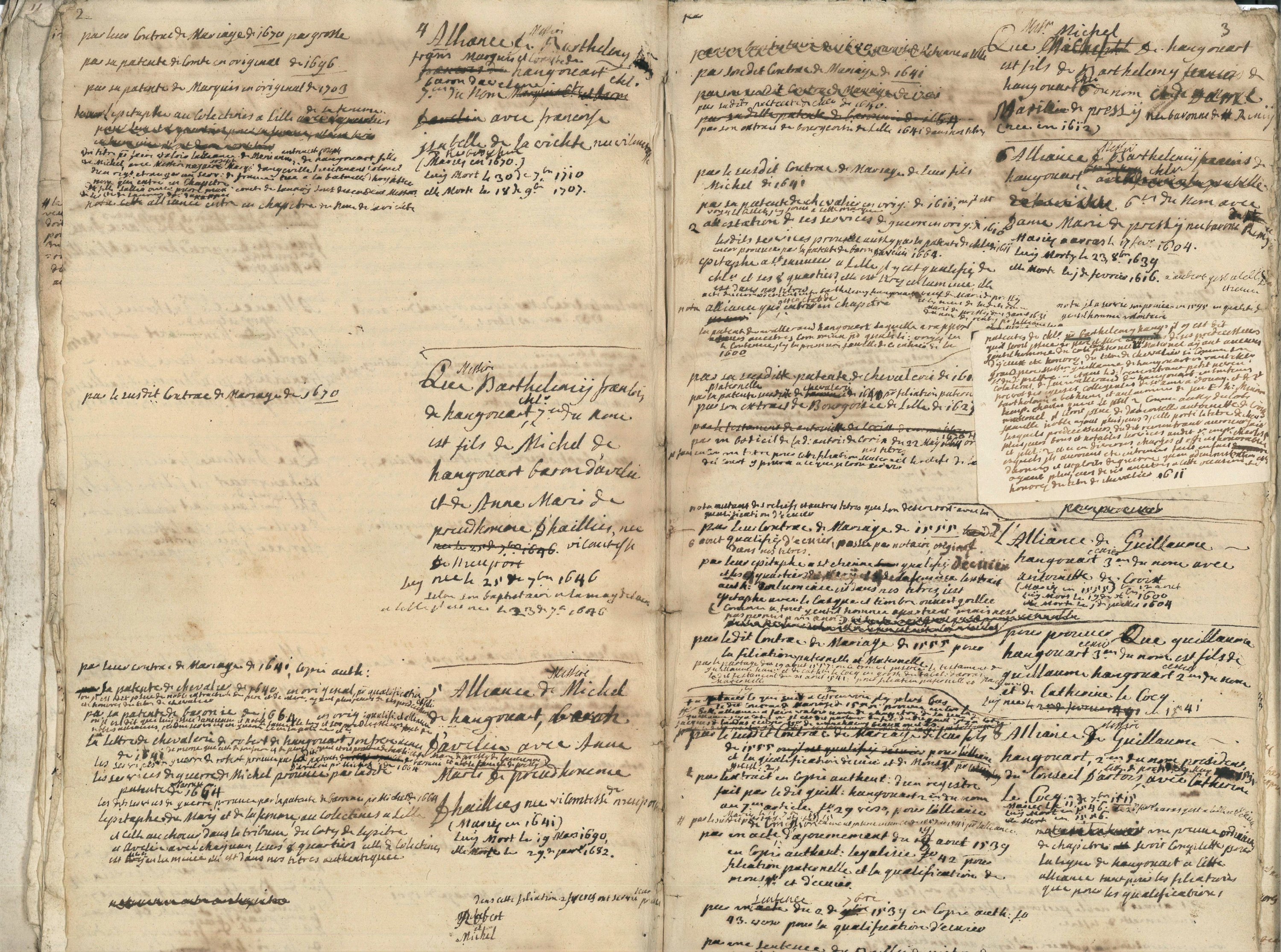 Notes, réflexions et arbre généalogique des deux lignes de la famille de Hangouart, 17e siècle, 30 et 16 pp. in-4 ;