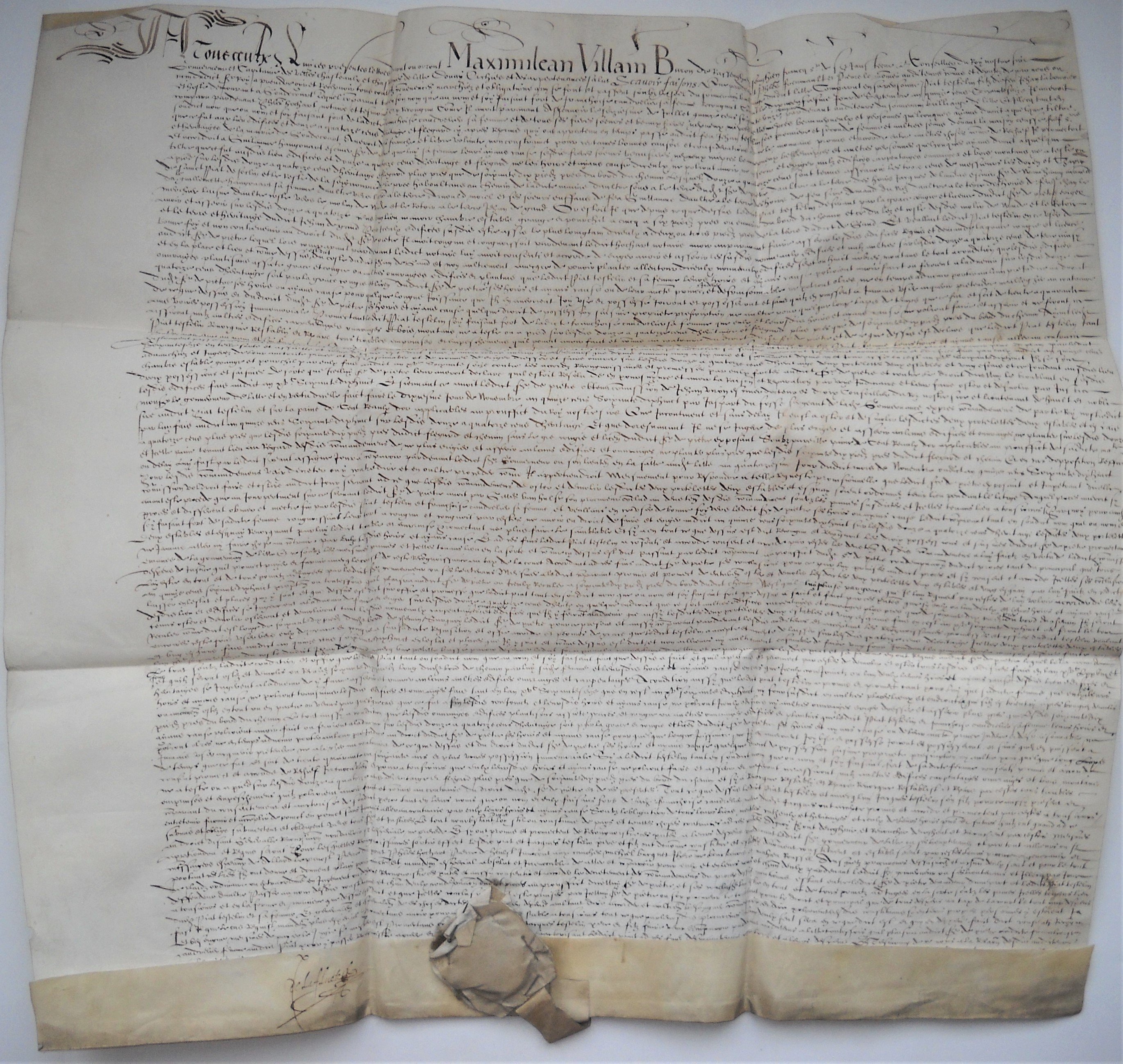 Réunion de 28 pièces manuscrites, 16e et 18e siècles, en majorité sur parchemin, formats divers, avec annotations manuscrites, sur chaque document original, du marquis dHangouart, auteur de « Analyse généalogique des Archives de la Maison d'Hangouart. 900 ans d'histoire d'une vieille famille de Lille », publié en 1930.