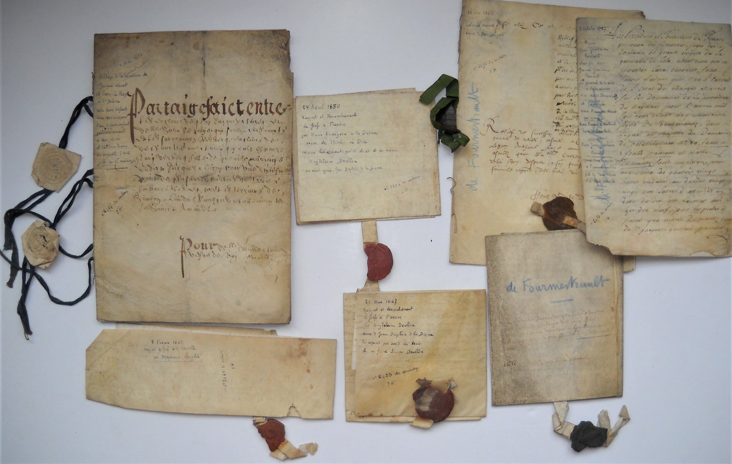 Réunion de + de 130 pièces manuscrites, 16e au 18e siècle, papier et parchemin, formats divers, avec annotations manuscrites, sur chaque document original, du marquis dHangouart, auteur de « Analyse généalogique des Archives de la Maison d'Hangouart. 900 ans d'histoire d'une vieille famille de Lille », publié en 1930, relatives à la seigneurie de Fourmestraux et aux familles Ran de la Fontaine, Lefranc, Claret, Desmaetz, Flameng, de Langlet, etc.