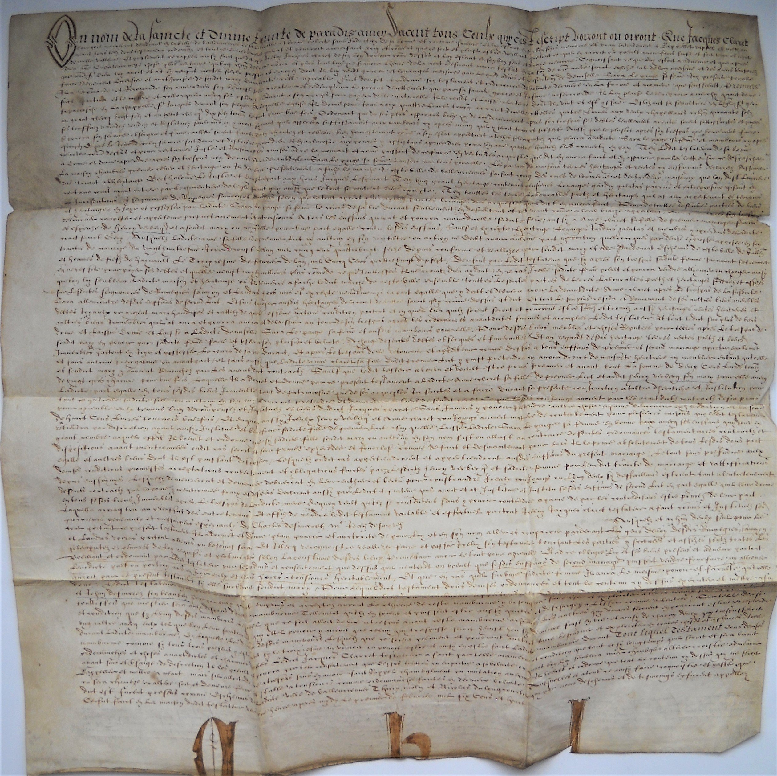 Actes de rentes, partages de succession, testaments, etc, dont : Testament du 1er février 1608 de Jacques Claret, parchemin 56 x 57 cm ; testament du 12 août 1630 dEustace Claret, parchemin 34 x 71 cm ; Partage de la succession du 1er octobre 1633 de Jacques Claret ; testament du 11 janvier 1638 de Marie Bauldry veuve de Jean Flameng ; Partage du 26 août 1649 de la succession de Marie Bauldry veuve de Jean Flameng ; etc.